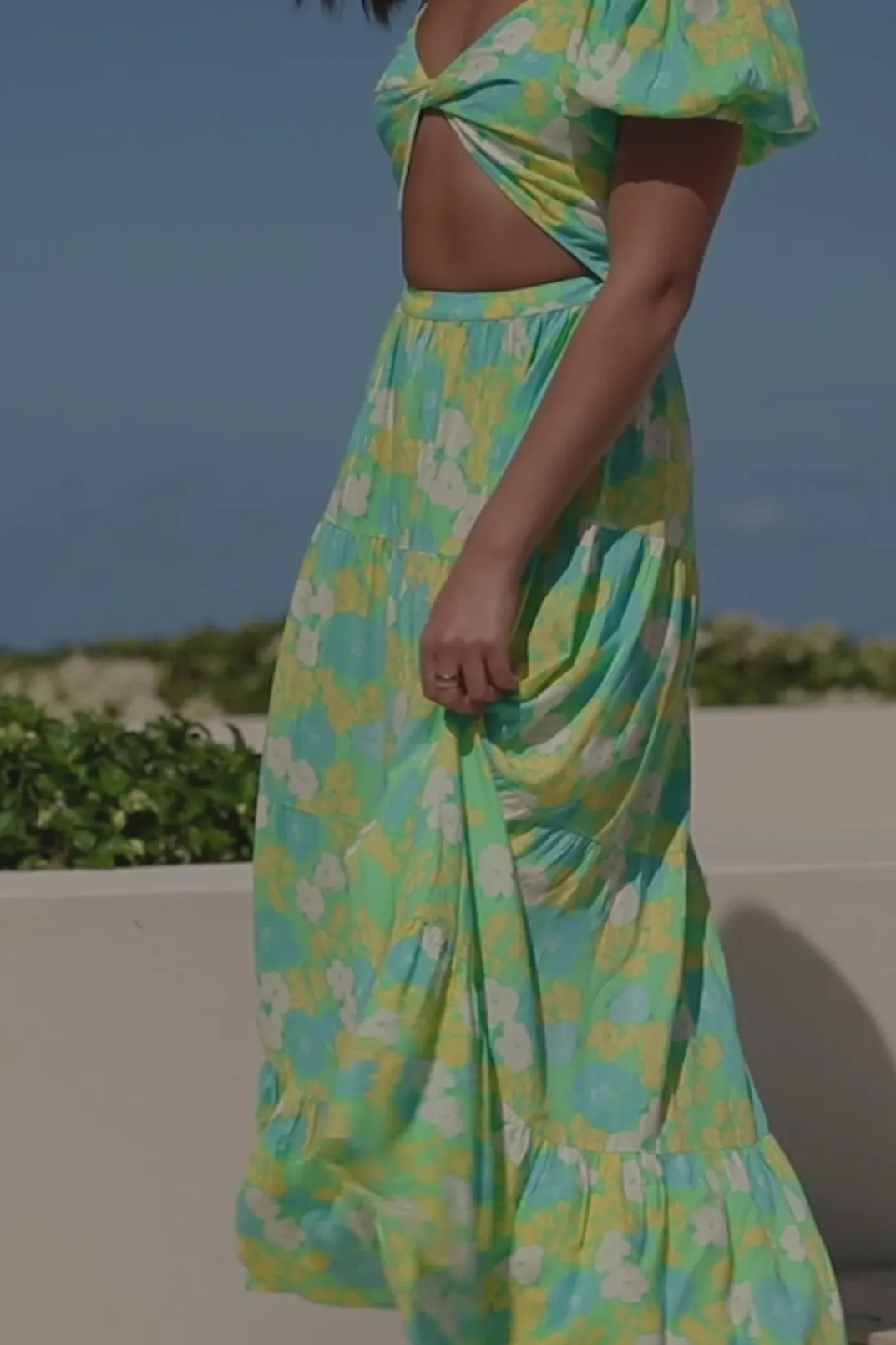 Stand Out At Your Next Event In The Belle Maxi Dress, Made From A Stunning Viscose Slub Fabric With Our Exclusive New Bryony Tropical Print. It Features Short Puff Sleeves, Twist Detail At Centre Bust, Cutout At Waist And A Flowy Tiered Skirt. Style With The Tiana Bag And Strappy Rafaela Heels For Your Next Night Out! Designed Exclusively By Sabo.