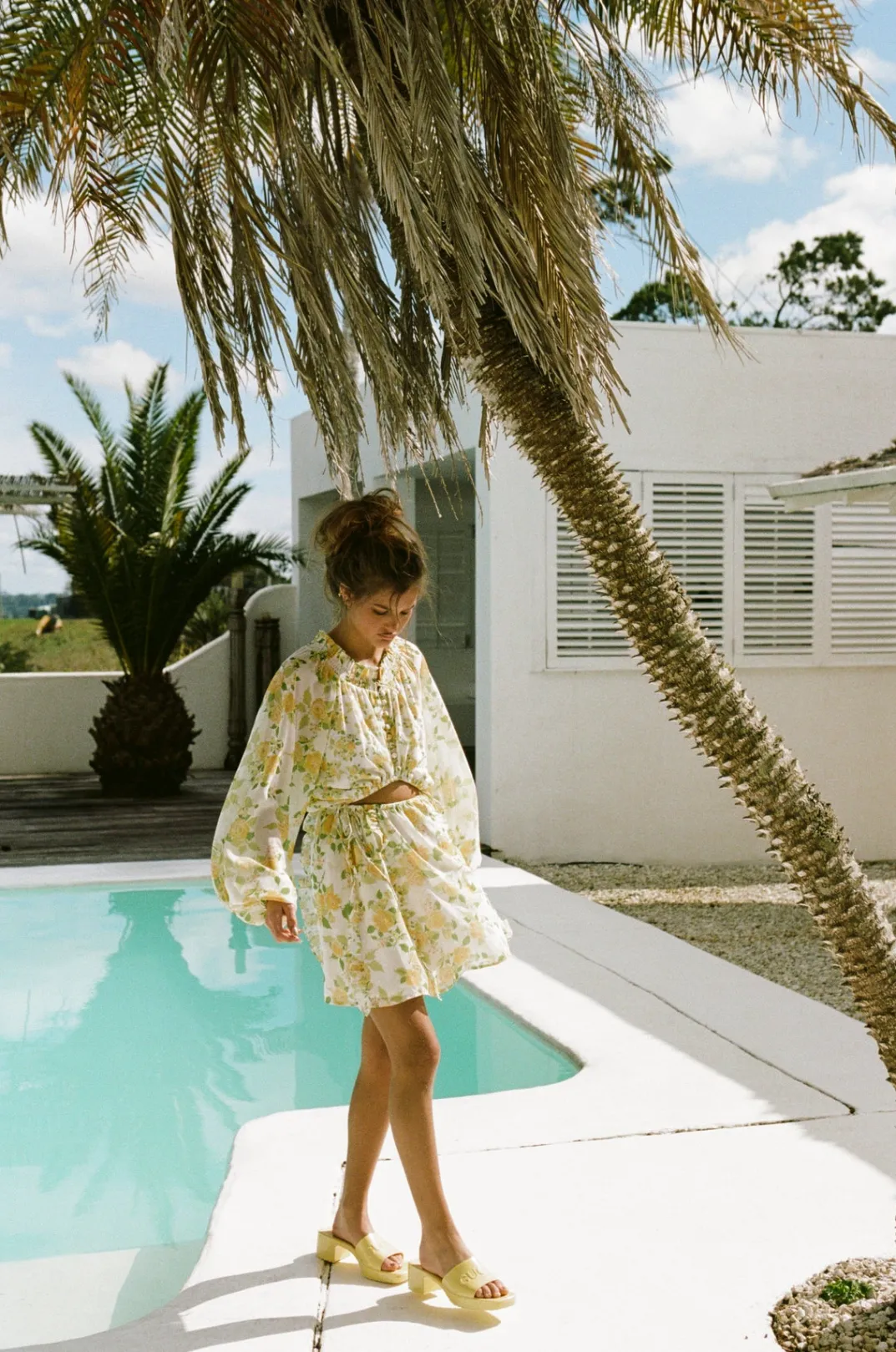 Inspired By Relaxed Resort Vacation Vibes, The Inez Cutout Dress Is Made From A Luxurious Chiffon Fabric With Our Exclusive Dusty Lemon Floral Print. It Features Puff Sleeves, Rounded Neckline With Shirred Detailing, Covered Buttons At Centre Front Bodice, Cutout At Waist, Ties At Side Of Skirt And Flouncy Skirt With Ruffle Details. Keep It Casual With Slides Or Dress It Up For Dinner Or An Event With The Strappy Leila Heels! Designed Exclusively By Sabo.
