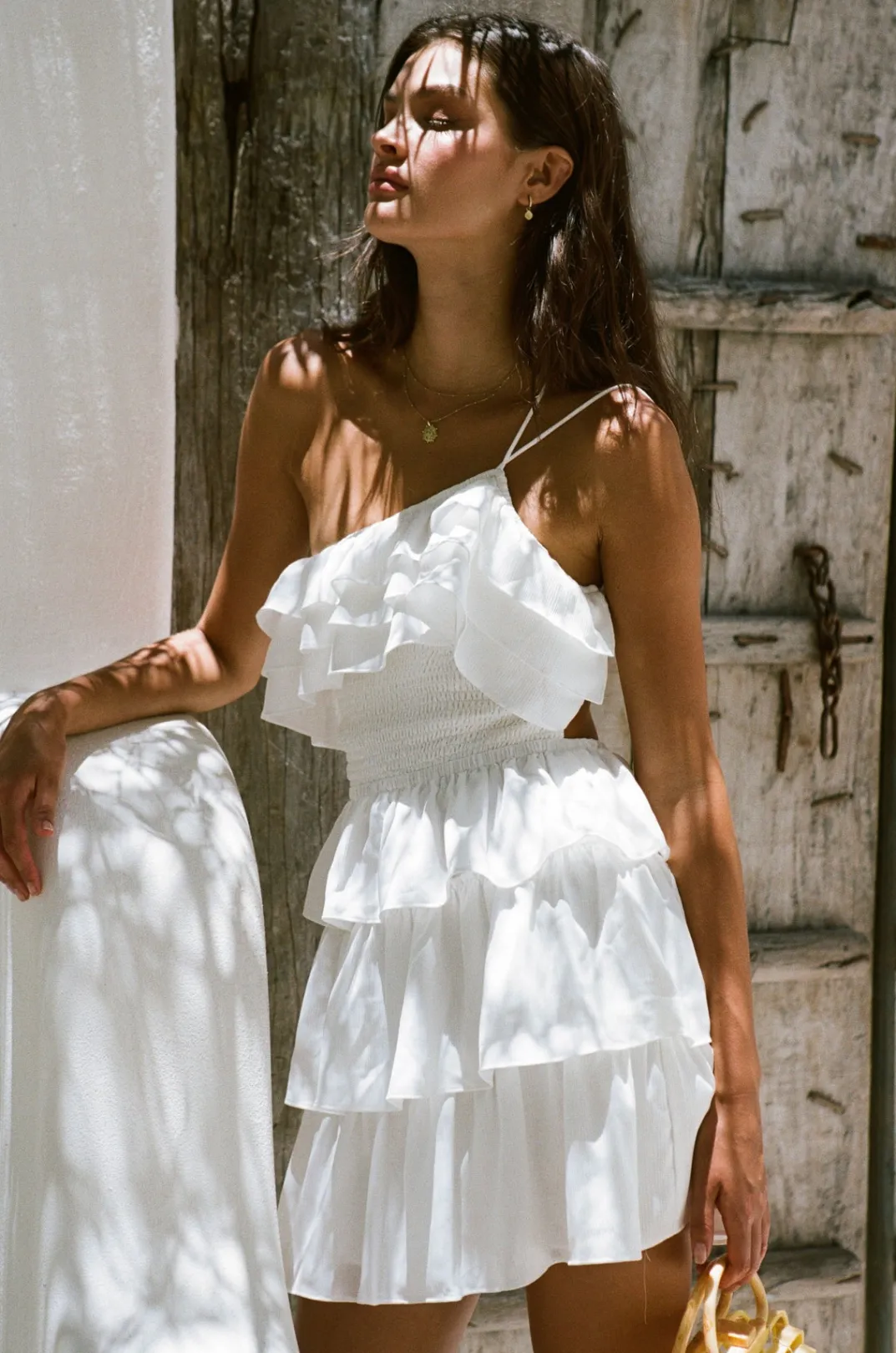 The Perfect Party Piece For Our Feminine Girlies Has Arrived! The Khean Frill Dress Is Made From A Crepe-Feel Fabric In White. It Features Asymmetric Straps And Neckline, Triple Frill Details Across Neckline And Skirt And A Shirred Bodice. Dress It Up With The Strappy Rafaela Heels! Designed Exclusively By Sabo.