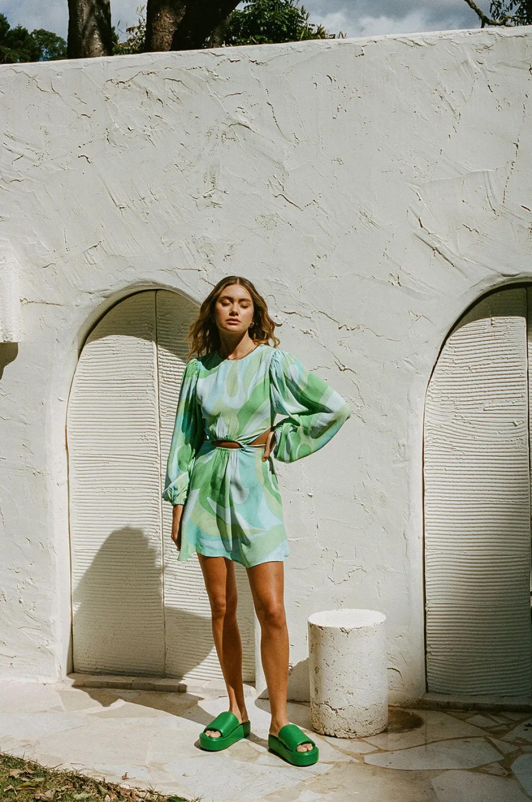 The Retro Inspired Serrano Cutout Dress Is Made From A Matte Silky Fabric With Our Exclusive Lucid Oasis Print. It Features Full Length Puff Sleeves, High Rounded Neckline, Cutouts At Waist With Tie Details And A Flouncy Skirt. Complete The Look With The Zita Strappy Sandals For Your Next Event! Designed Exclusively By Sabo.