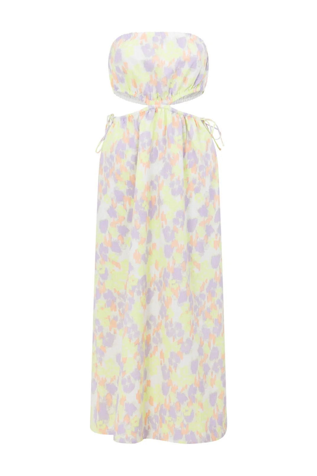The Perfect Look For A Long Lunch, The Vella Cutout Midi Dress Is Made From A High Quality Natural Cotton Slub Fabric With Our New Exclusive Smudge Ditsy Lime Print. It Is A Strapless Style Featuring Cutouts At Waist With Draw Tie Details And A Flouncy Midi Length Skirt. Dress It Up With The Transparent Mules For Your Next Event! Designed Exclusively By Sabo.