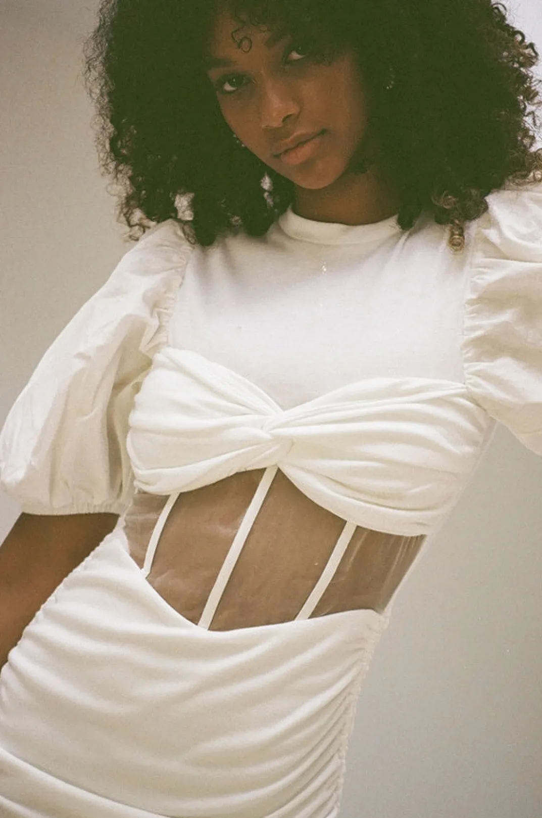 *This Is A Final Sale Item* Let Us Do The Layering! The Venezia Corset Dress Is Made From An Off White Jersey Fabric. It Features Short Puff Sleeves, High Rounded Neckline, Overlay Bust Detail, Sheer Boned Corset And Fitted Gathered Skirt With Adjustable Drawstrings At Sides. Pair With The Transparent Mules For Your Next Night Out! Designed Exclusively By Sabo.