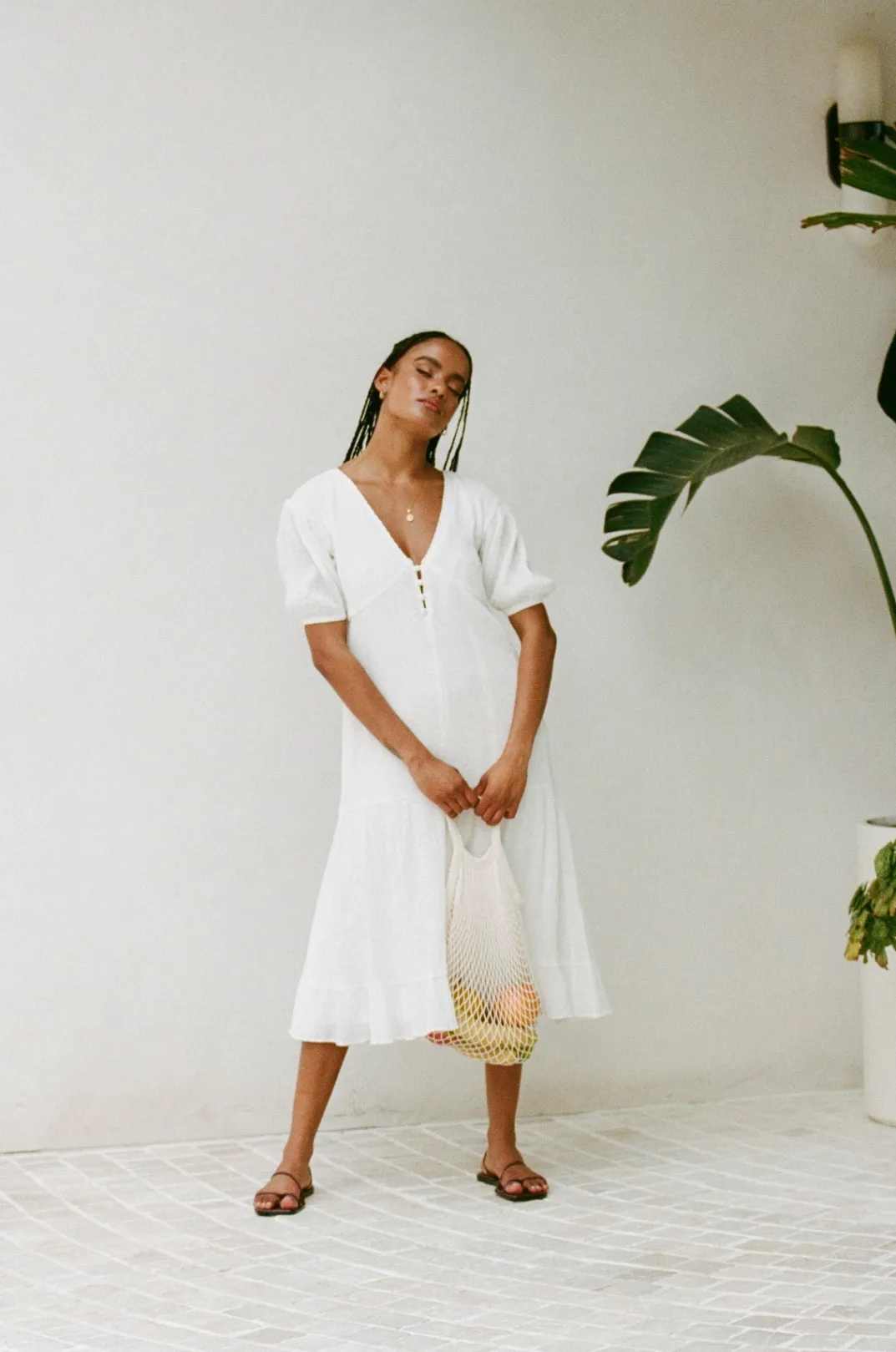 *This Is A Final Sale Item And Cannot Be Returned. See Our Returns Policy Here One Of Our Customer Favourite Shapes Now In A Whimsical Midi Length! The Vittoria Midi Dress Is Made From A Lightweight Textured Fabric In White. It Is A Relaxed Style Featuring Short Puff Sleeves, V Neckline With Covered Button Details And Flouncy Triple Tiered Skirt. Style With Slides And Sunnies For A Cute Weekend Look! Designed Exclusively By Sabo.