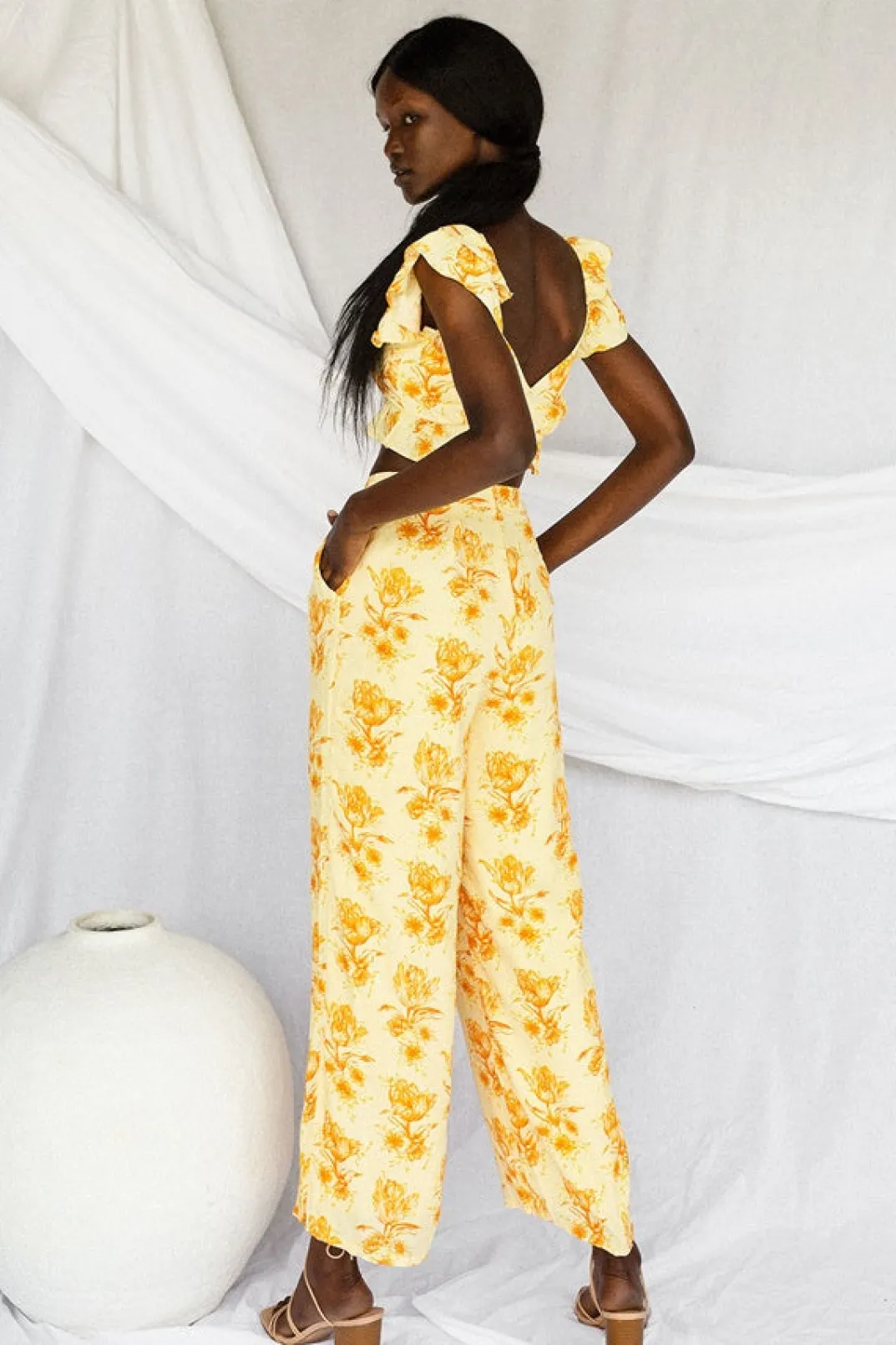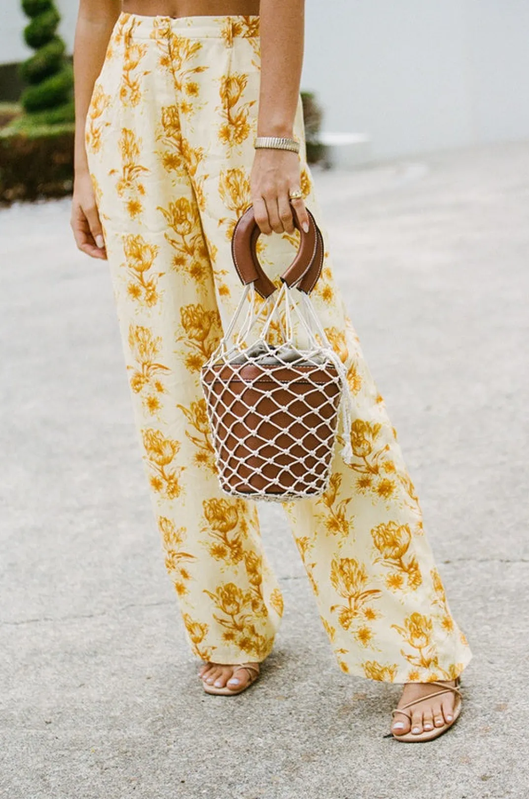*This Is A Final Sale Item* Trade Up Your Dress For A Pant Set! The Danika Pants Are Made From A Luxurious Yellow Zipper Crepe Fabric With Our Exclusive Sunset Tulip Floral Print Throughout. They Are A High Waisted Style Featuring Flowy Wide Legs. Get The Look With The Danika Top, Lena Mules And Net Bucket Bag! Exclusively Designed By Sabo.