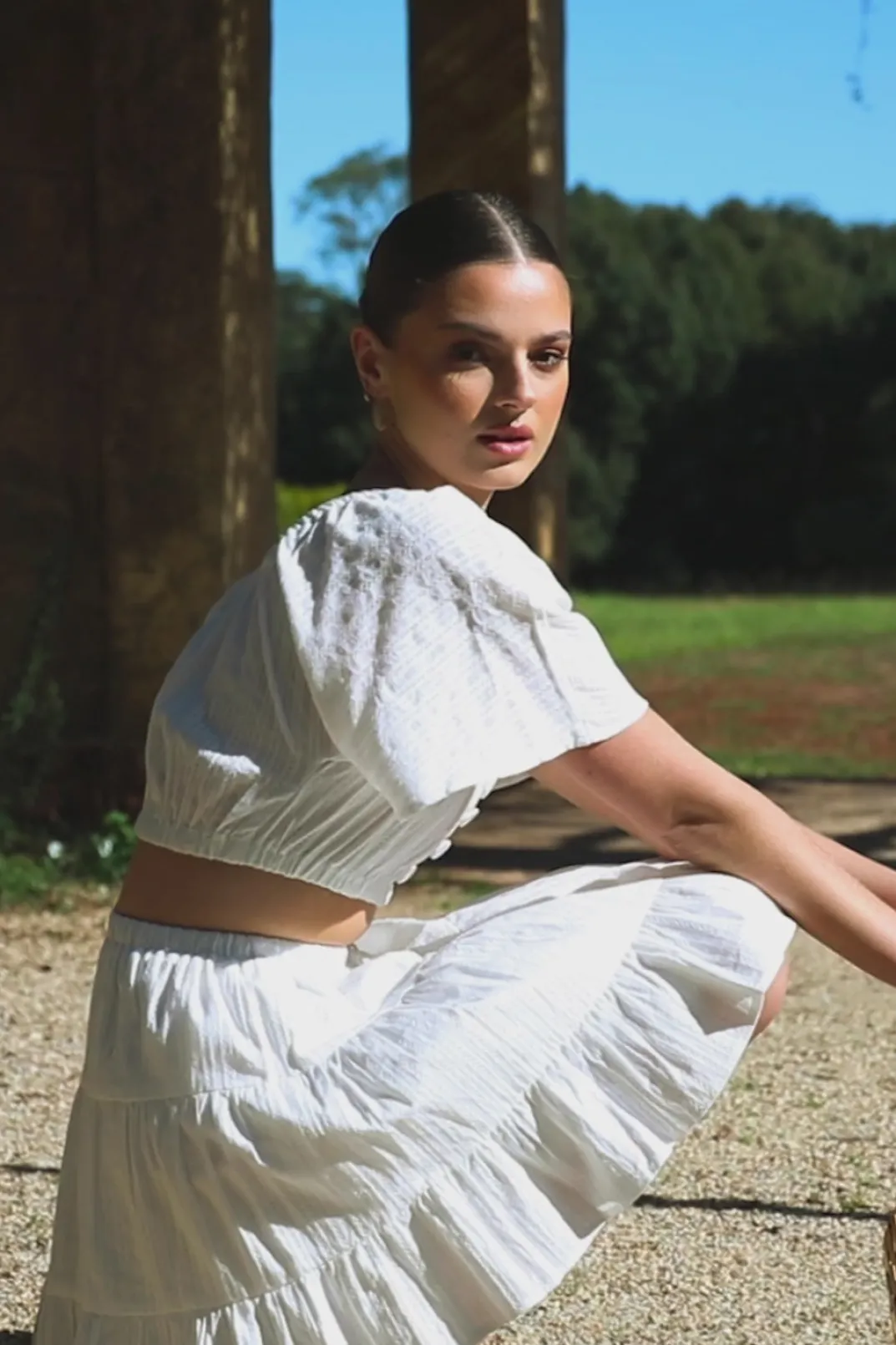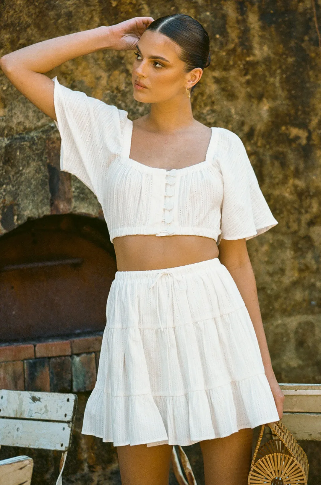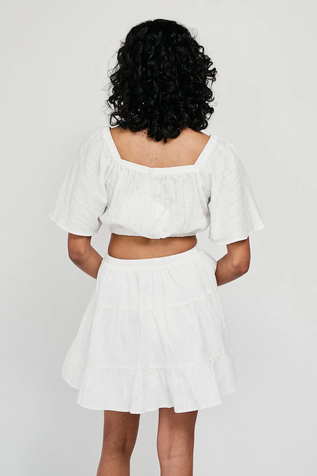 Wear It As A Set Or Style It With Denim! The Gabriella Top Is Made From A High Quality Natural Vertical Dobby Cotton In White. It Is A Cropped Style Featuring Stunning Textured Self Stripes Throughout, Short Flared Sleeves And Button Details At Centre Front. Get The Look With The Gabriella Skirt And Neutral Sandals! Designed Exclusively By Sabo.