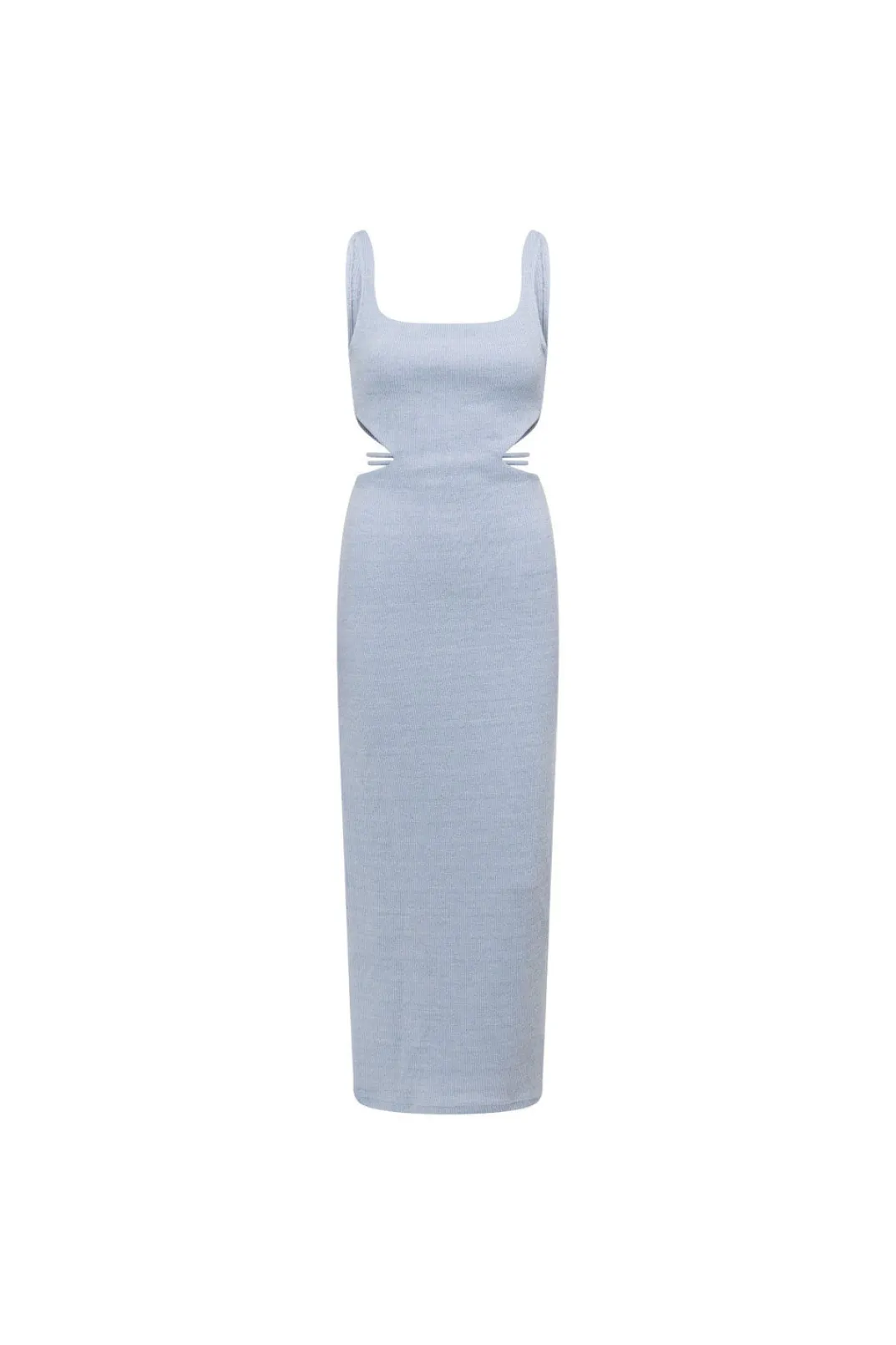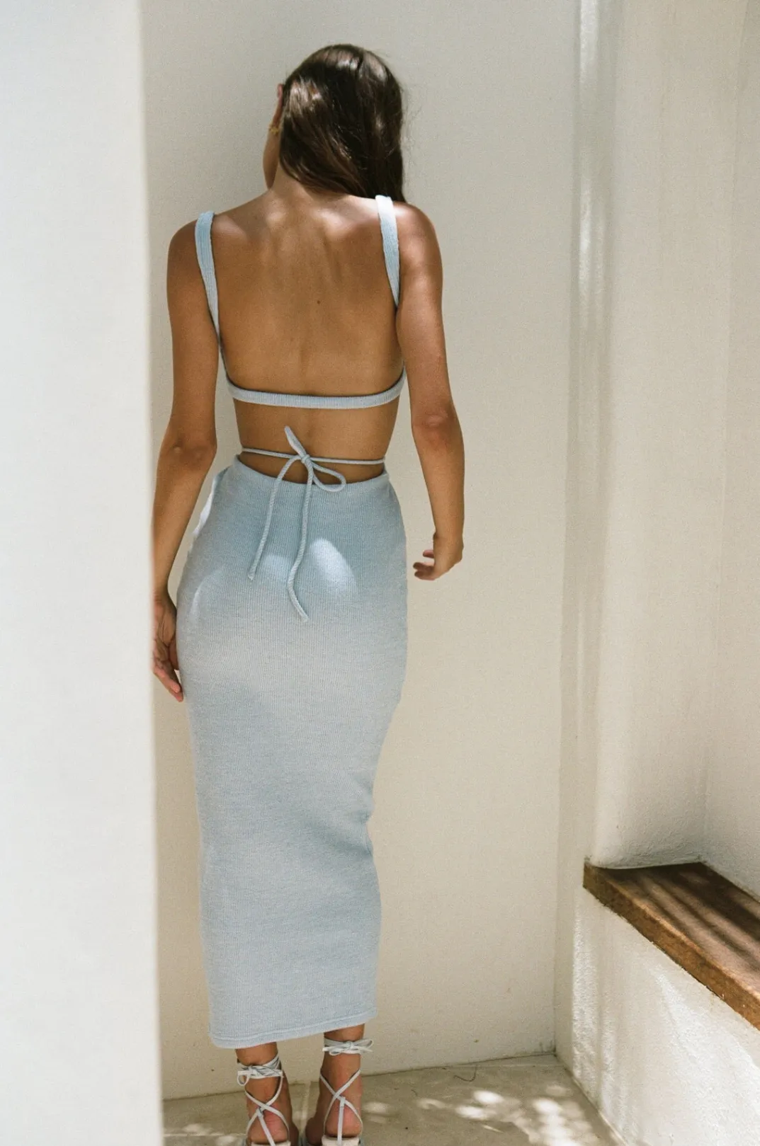 *This Is A Final Sale Item And Cannot Be Returned. See Our Returns Policy Here *Back In Stock* Wear It To Dinner With The Girls Or On Date Night! The Backless Bahari Dress Is Made From A Soft Ribbed Fabric In A Sky Blue Hue. It Is A Backless Midi Style Featuring Cutouts At Waist With Tie Detail. Pair With The Strappy Rafaela Heels And Bold Luna Hoops. Designed Exclusively By Sabo.