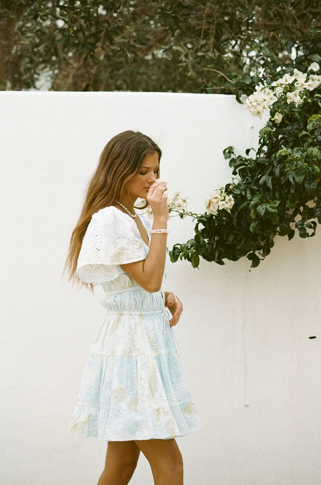 Introducing Our Brand New Printed Broiderie Fabric Featuring Our Exclusive Dusty Blue Lilly Print. The Alessanda Cutout Dress Has Short Flirty Sleeves, Cutout At Centre Front With Draw Tie Details And A Flouncy Triple Tiered Skirt. Style Your Look With The Petal Necklace And Strappy Zita Sandals! Designed Exclusively By Sabo.