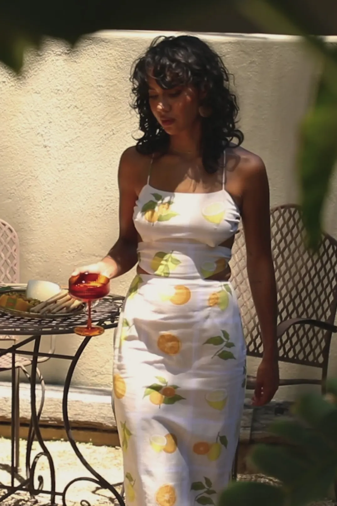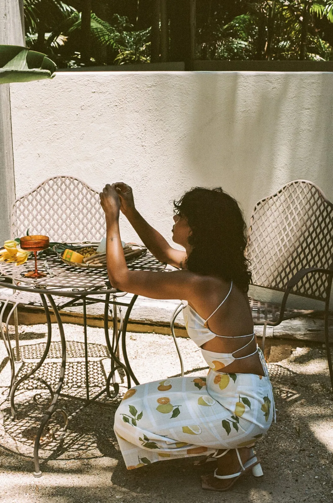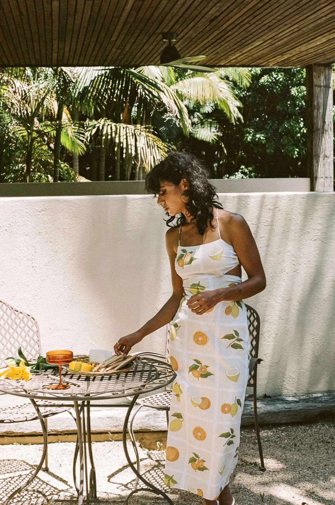 Introducing Our Brand New Exclusive Citrus Print! The Sabo Luxe Arion Midi Dress Is Made From A High Quality Structured Natural Cotton Fabric In A Cream Hue. It Features White Check Panels, Open Back With Strappy Detailing, Cutouts At Waist And Midi Length Skirt. Style With Sandal Heels And Chic Sunglasses For A Long Lunch! Designed Exclusively By Sabo.