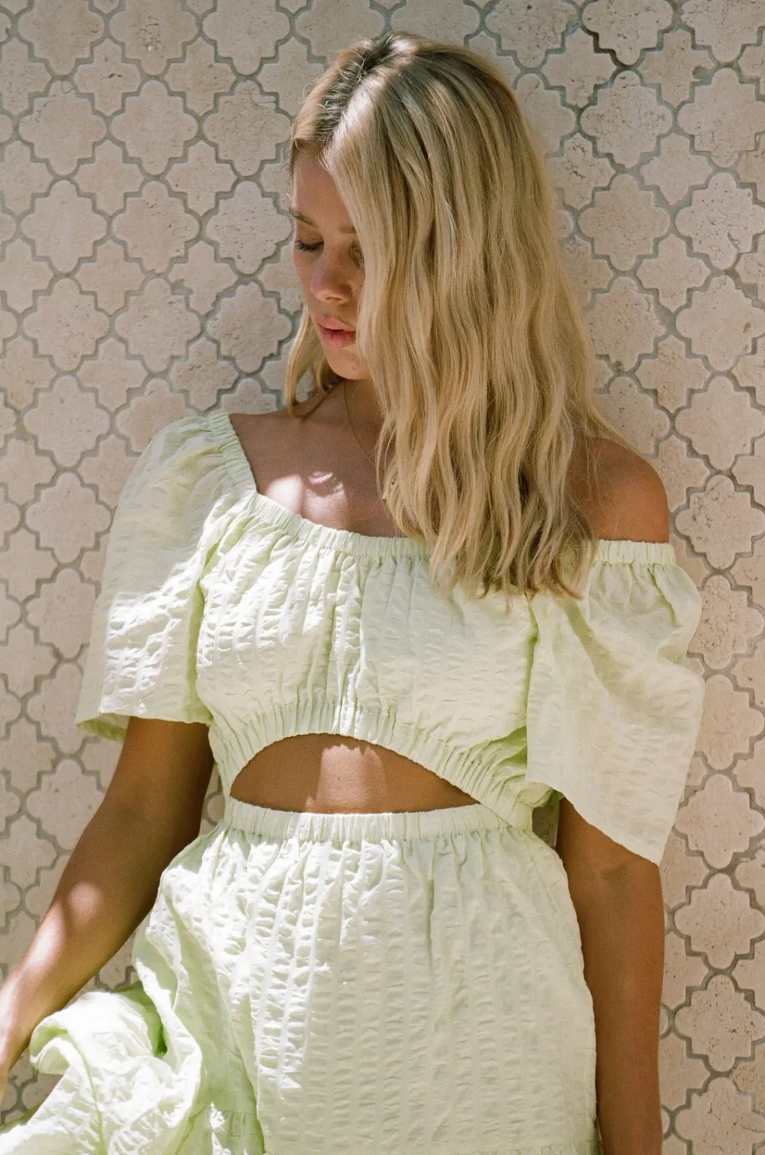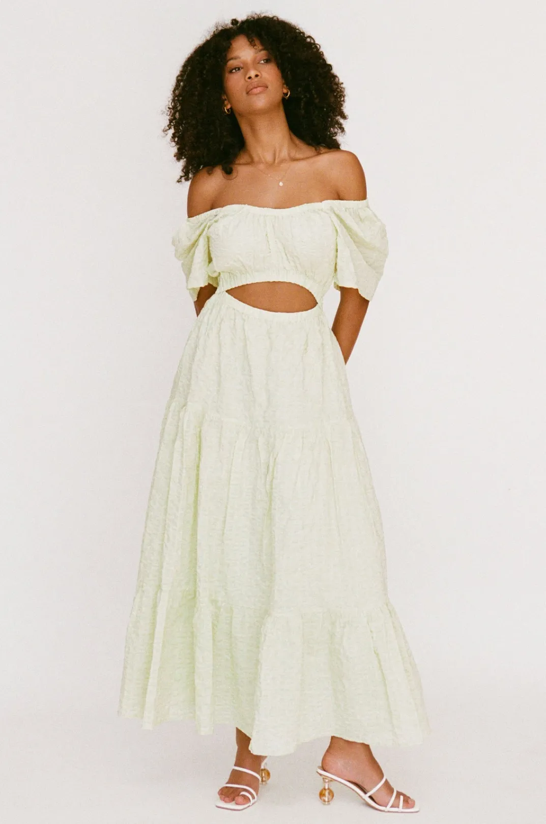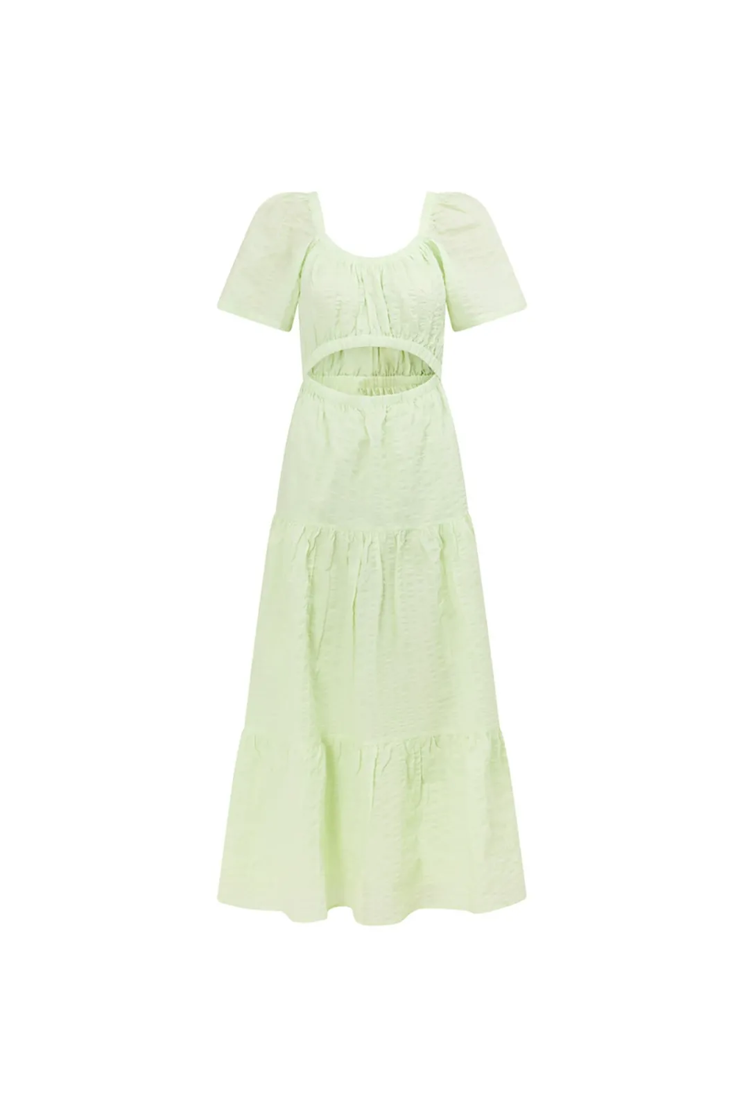 Exude Vacation Vibes In The Stunning Armelia Maxi Dress, Made From A Natural Cotton Textured Seersucker Fabric In A Green Hue. It Features Flared Sleeves, Cutout At Waist And Flouncy Skirt. Style Your Look With Tan Sandals And Matisse Sunglasses! Designed Exclusively By Sabo.