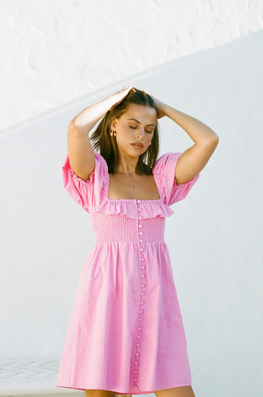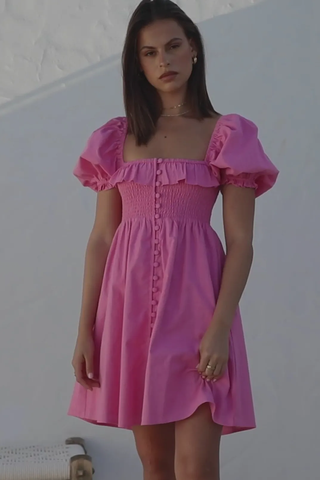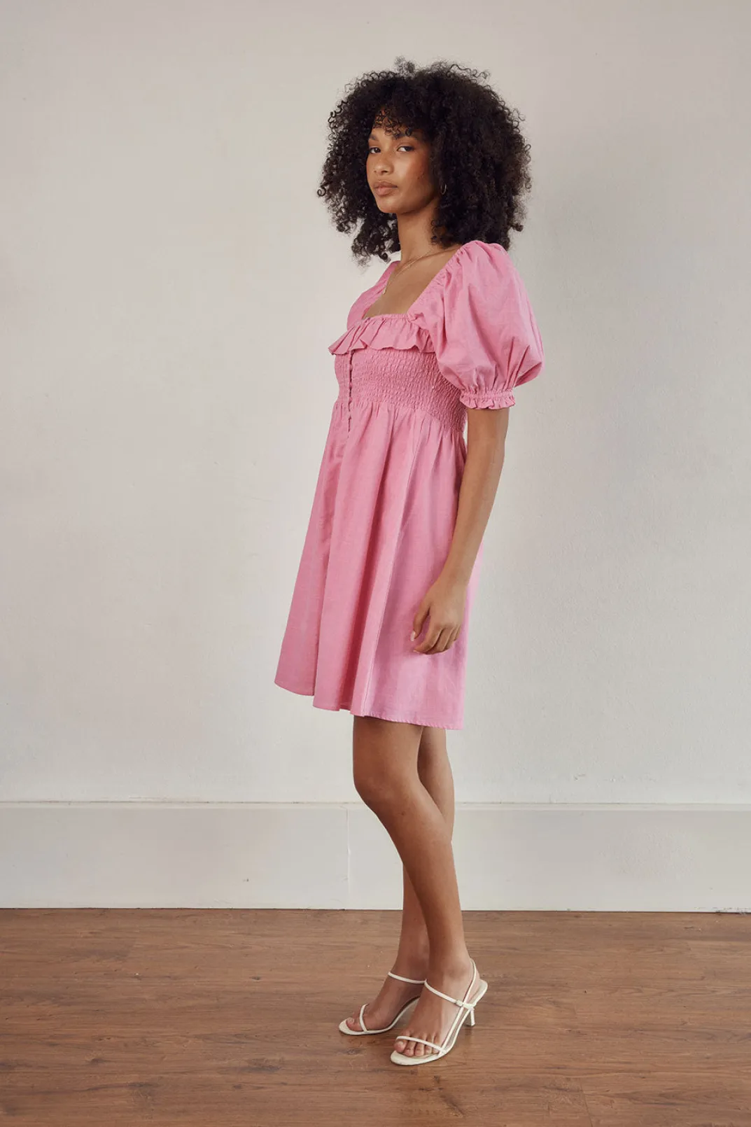 *This Is A Final Sale Item* Stand Out In The Atticus Dress! It Is Made From A High Quality Natural Cotton Slub Fabric In A Vibrant Pink Hue. It Is A Babydoll Style Featuring Short Puff Sleeves, Square Neckline With Frill Detail, Shirred Panel At Bust, Covered Button Details Down Centre Front And A Flouncy Skirt. Pair With Sandals For A Super Cute Weekend Look! Designed Exclusively By Sabo.
