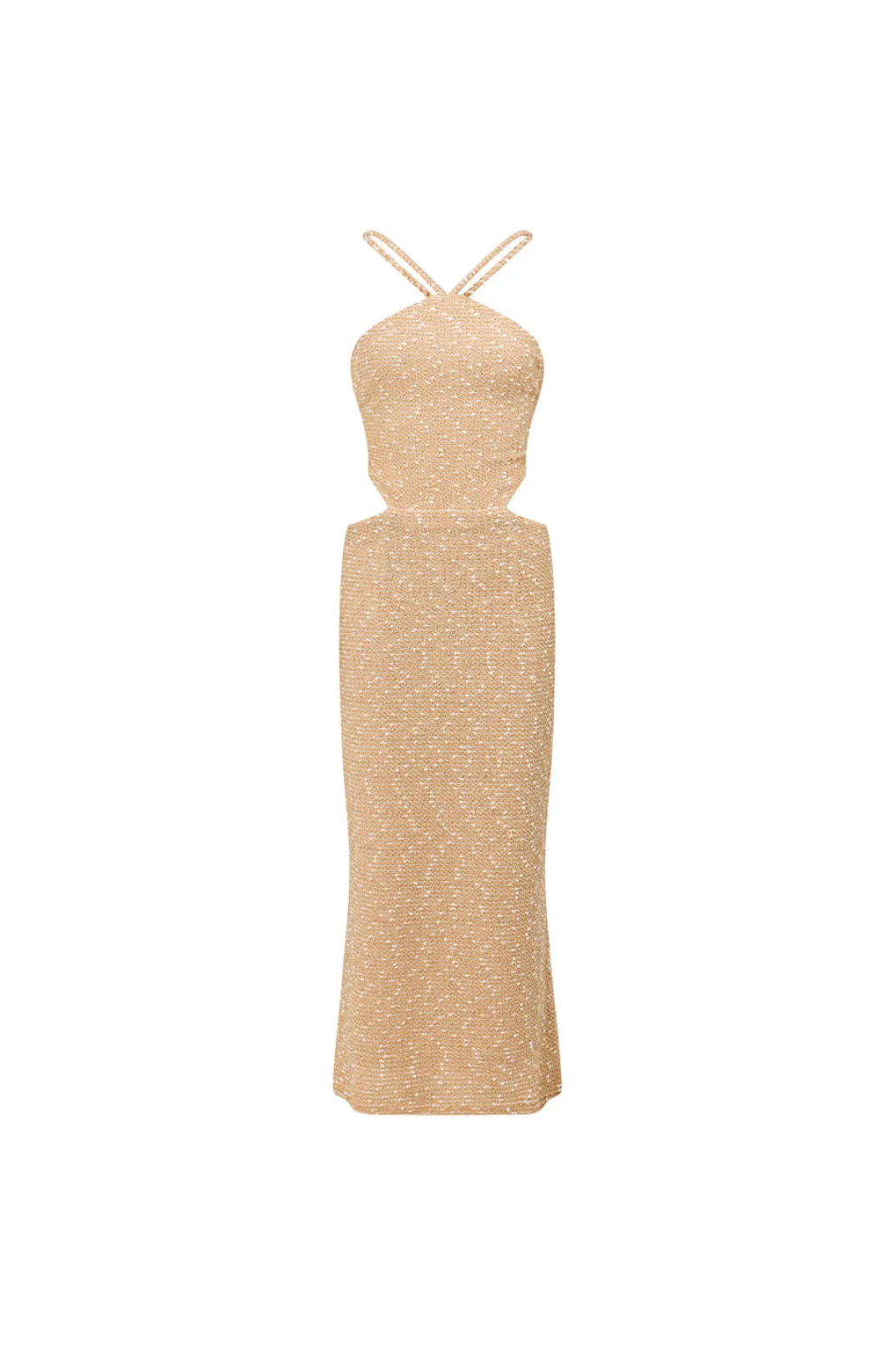 Adding An Element Of Texture To This Chic Design, Thebackless Amada Dress Is Made From A Cotton Blend Boucle Fabric In Tan With A White Speckle Throughout. It Is A Backless Style Featuring A High Halter Neckline, Cutouts At Waist And A Midi Skirt With Flared Hem. Dress It Up With The Peyton Mules For Your Next Event! Designed Exclusively By Sabo.