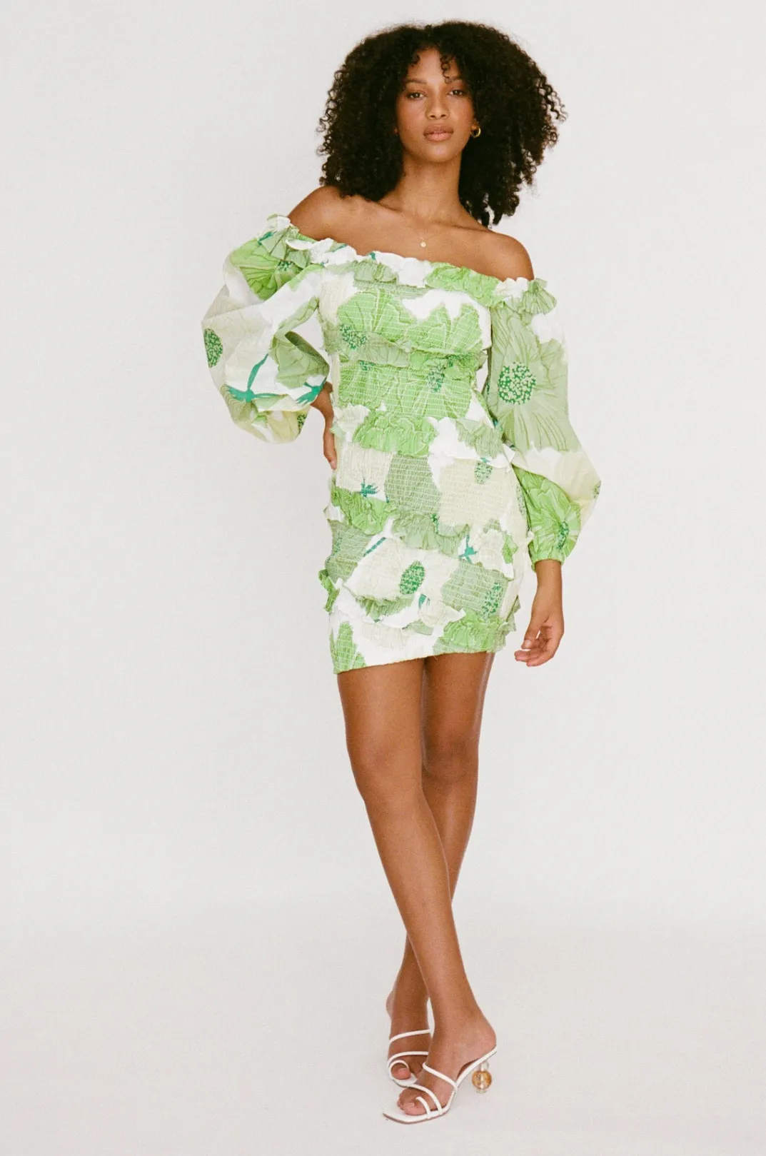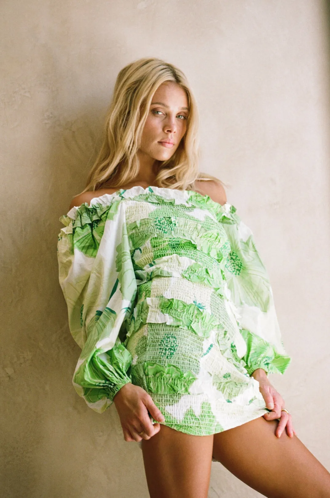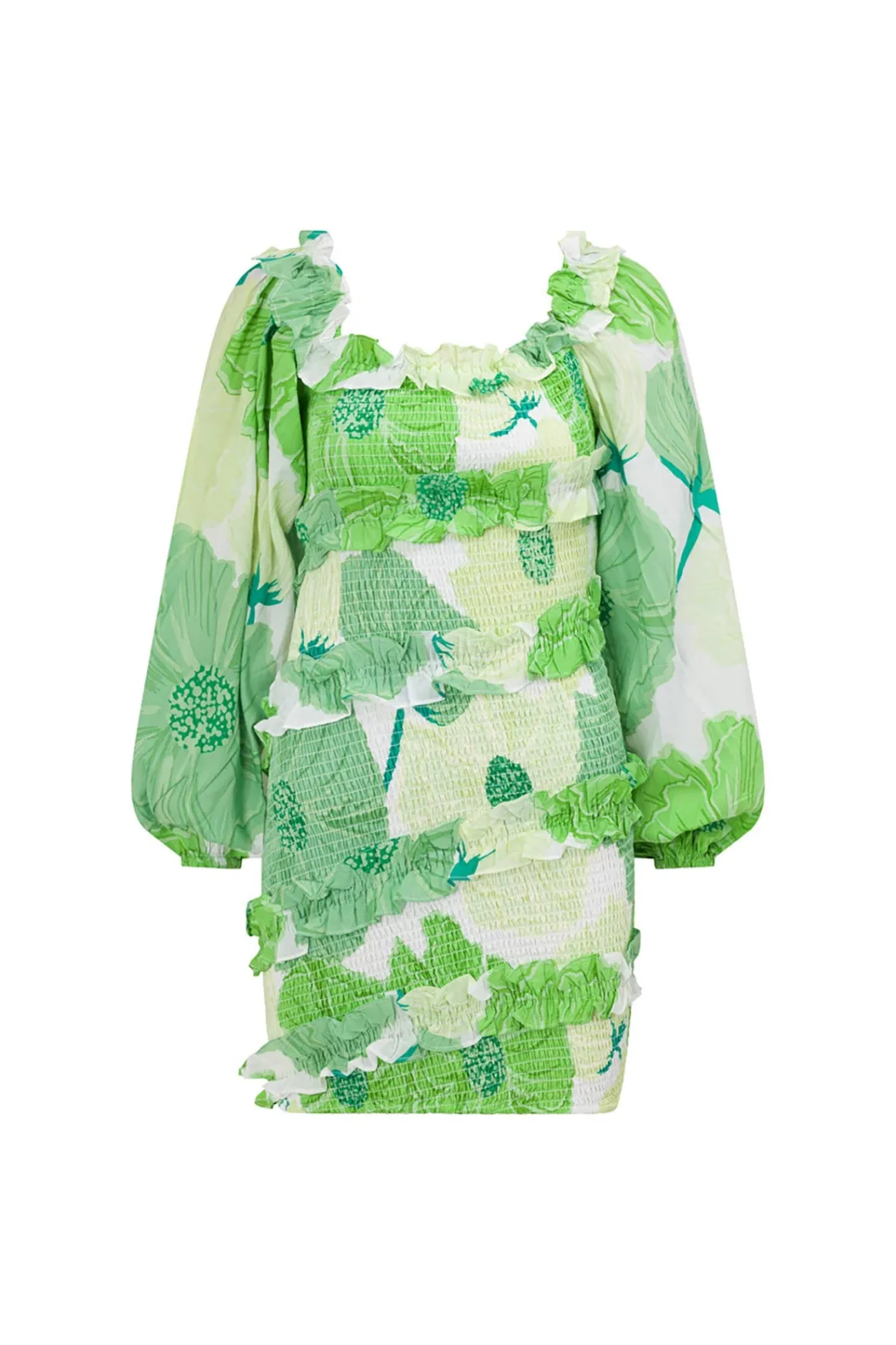 *This Is A Final Sale Item And Cannot Be Returned. See Our Returns Policy Here Designed To Flatter, The Berlyn Shirred Dress Is Made From A High Quality Natural Cotton Voile Fabric With Our Exclusive Moss Lily Print. It Is A Shirred Mini Style Featuring Bold Puff Sleeves And Ruffle Panels Throughout. Styling Tip:Can Also Be Worn One Off And One On Shoulder! Designed Exclusively By Sabo.