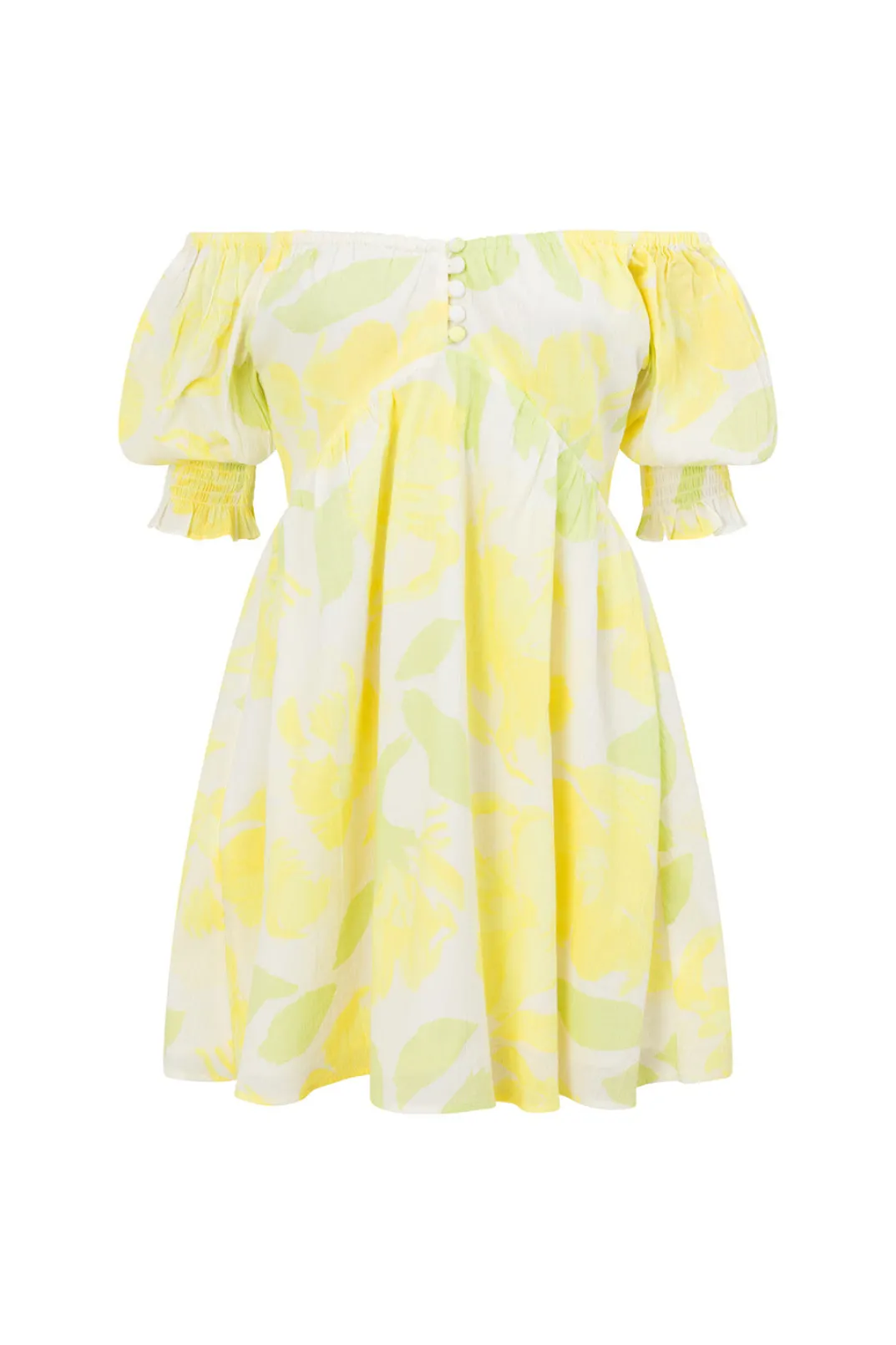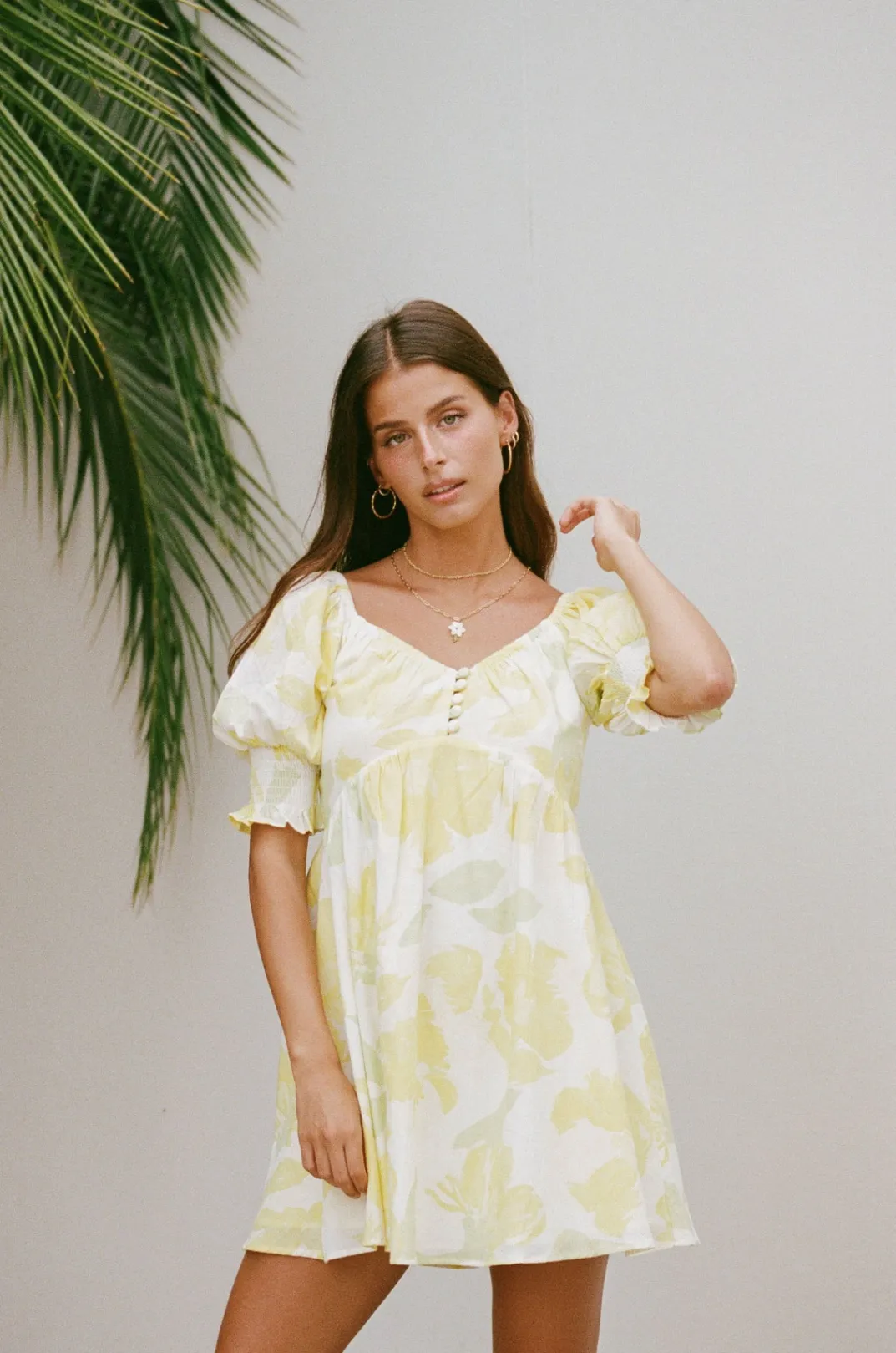 A Super Cute Style That Can Be Worn On Or Off Shoulder! The Birdie Dress Is Made From A Natural Crinkle Cotton Fabric With Our Exclusive Solstice Floral Print. It Features Short Puff Sleeves With Shirred Cuffs With Ruffle Trims, An Elastic Neckline, Covered Buttons At Centre Bust And A Flouncy Babydoll Skirt. Style Your Look With The Transparent Mules For Your Next Girls Lunch! Designed Exclusively By Sabo.