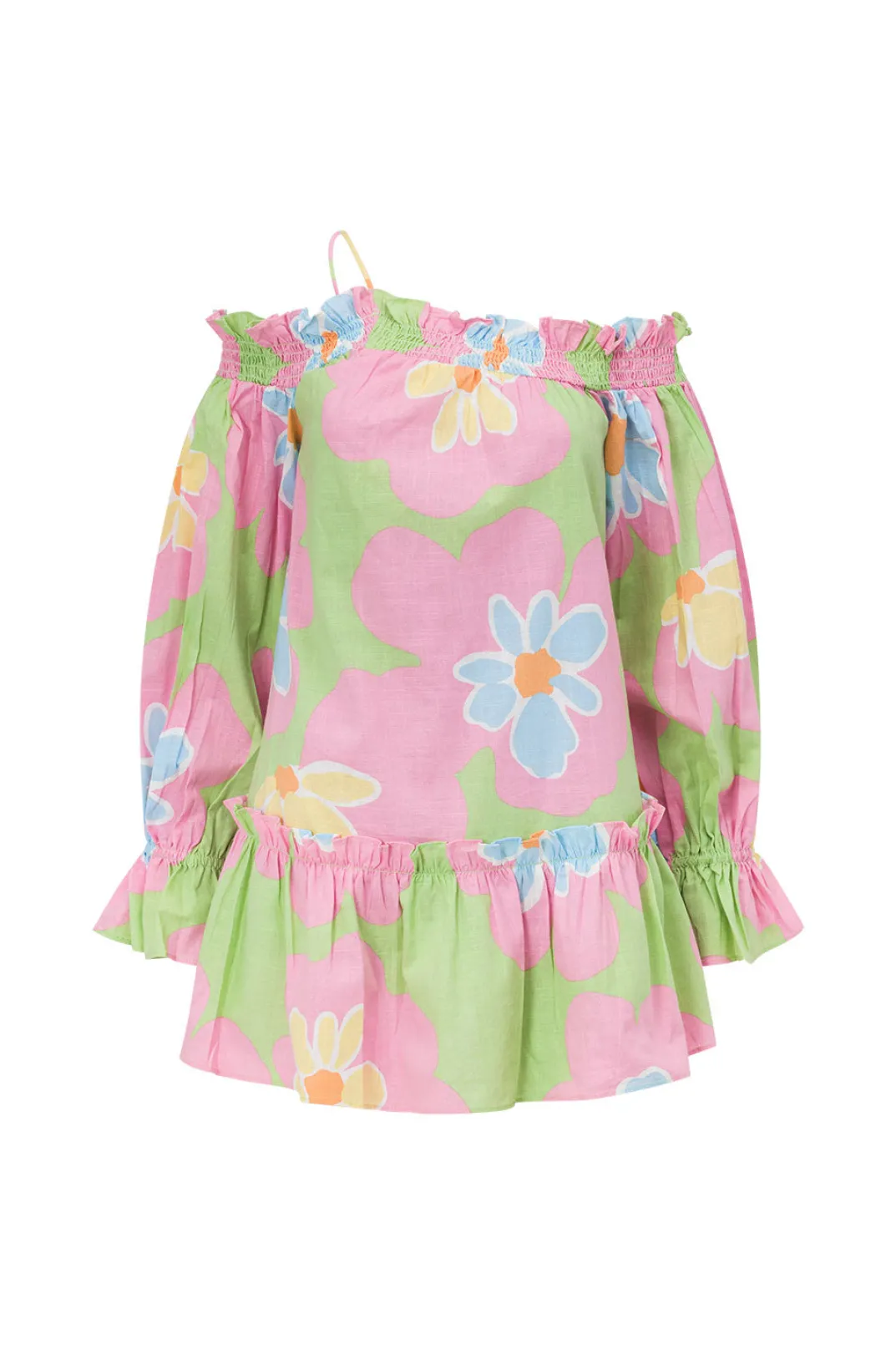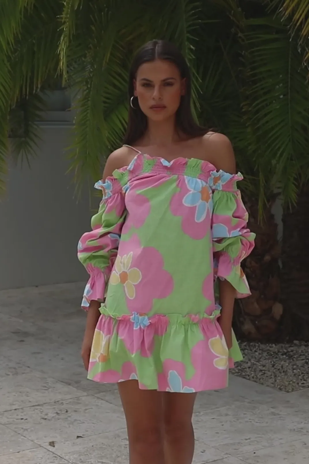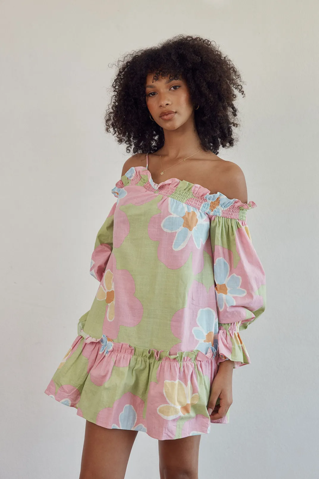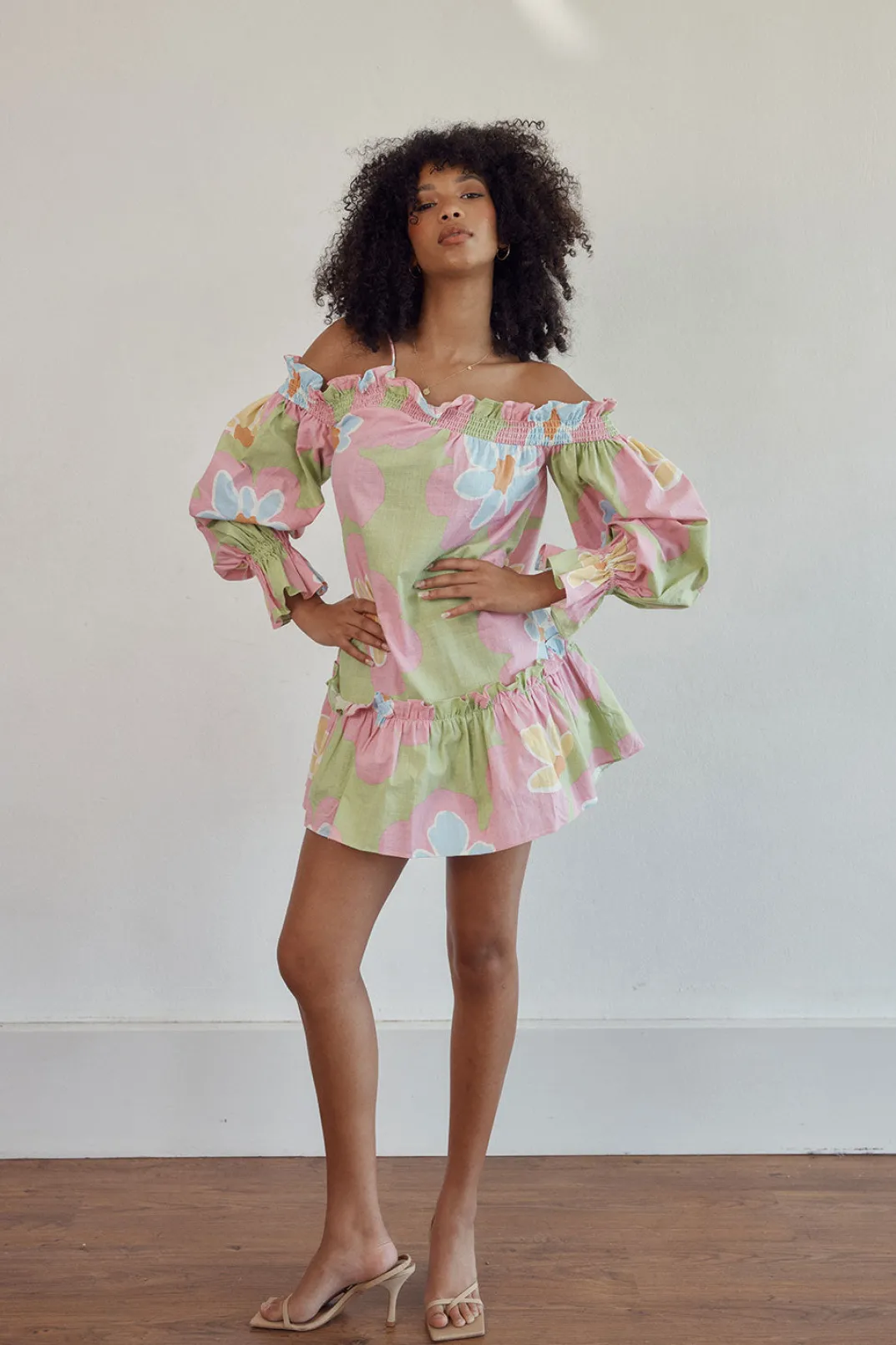 An Easy-To-Wear Piece Perfect For The Holiday Season! The Super Cute Blair Puff Dress Is Made From A High Quality Natural Cotton Slub Fabric With Our New Exclusive Hana Green Print. It Features Full Length Off Shoulder Puff Sleeves With Gathered Flared Cuffs, Shirred Panel Across Shoulders, Thin Strap On One Shoulder, Relaxed Fit, Frill Across Hem And Ruffle Details At Neckline And Across Skirt. Dress It Up With The Strappy Asteria Heels And Briella Earrings! Designed Exclusively By Sabo.