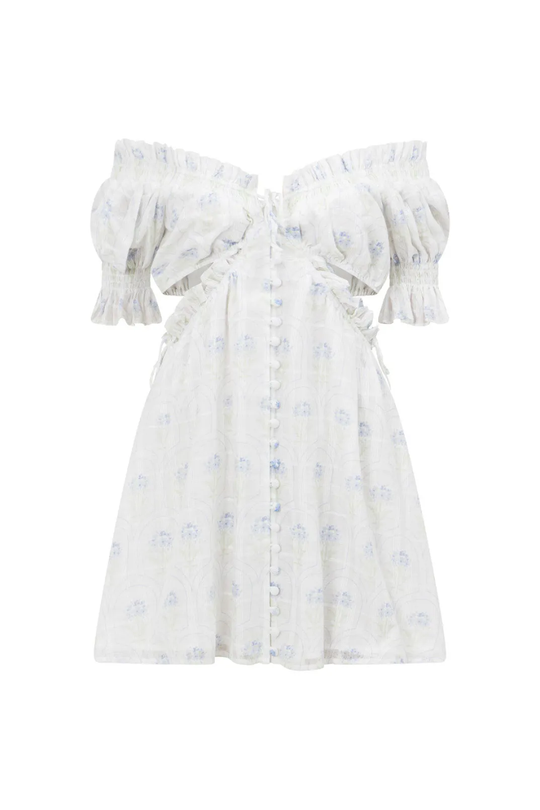 Perfect For Date Night, The Cannes Dress Is Made From A Delicate Natural Cotton Fabric With Our Exclusive Dainty Bouquet Print And A Self Check Throughout. It Is An Off Shoulder Style Featuring Short Puff Off Shoulder Sleeves, Ruffle Detailing Across Neckline, Sleeve Hems And Waist, Cutouts At Waist, Covered Button Details Down Centre Front And A Flouncy Mini Skirt. Dress It Up With The Strappy Rafaela Heels! Designed Exclusively By Sabo.