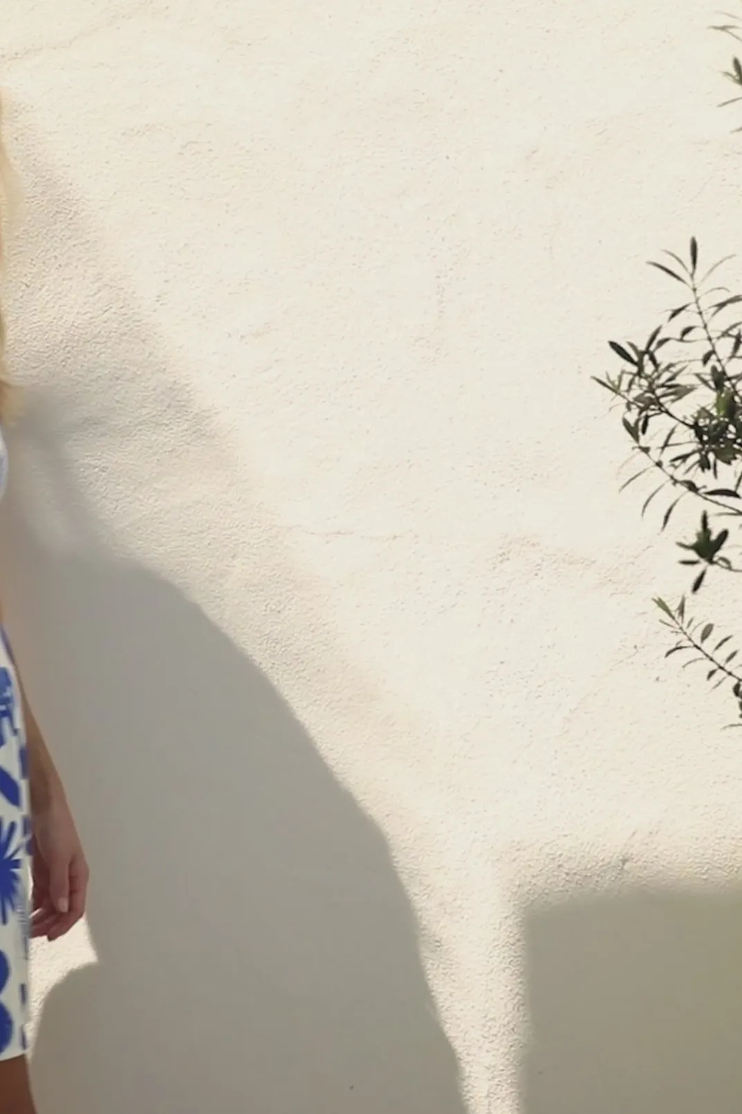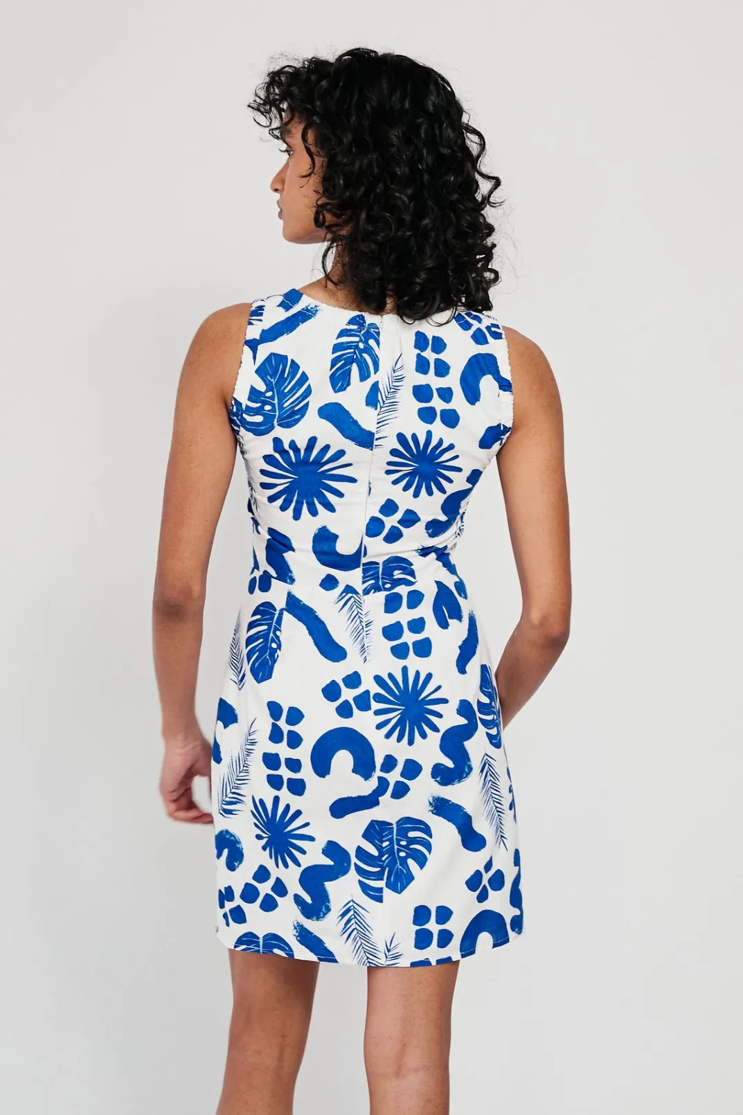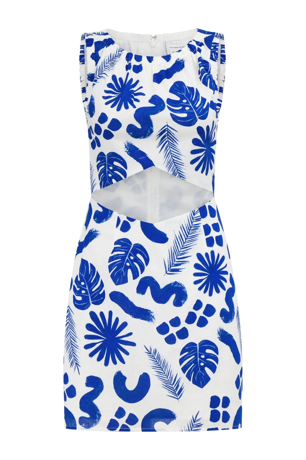 Inspired By Greece, The Celia Dress Is Made From A Naturl High Quality Linen Cotton Blend Fabric With Our Exclusive Blue Leaf Print. It Is A Structured Style Featuring A High Elastic Neckline And Cutout At Waist. Style With White Slides And The Jamilla Bag! Designed Exclusively By Sabo.