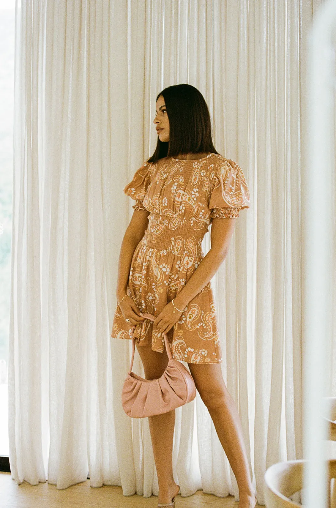 *This Is A Final Sale Item* Feminine And Classy, Perfect For An Event! The Charlize Shirred Dress Is Made From A Natural Lightweight Cotton Cheesecloth Fabric With Our Exclusive Earthy Paisley Print. It Features A High Rounded Neck With Shirring Across Neckline And Waist, Short Puff Sleeves With Frill Detailing And A Flouncy Skirt. Complete The Look With The Transparent Mules And Gold Accessories! Designed Exclusively By Sabo.