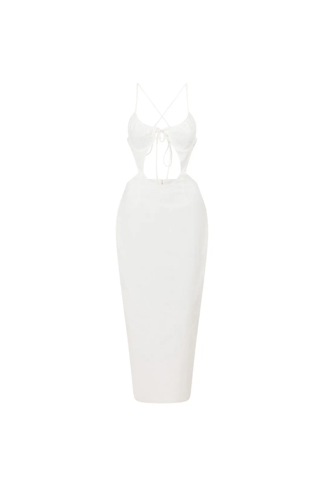 The Perfect Dress For Our Taller Ladies! Thechele Midi Dress Is Made From A Structured Cotton Fabric In White. It Is A Backless Style Featuring Thin Straps, Wire Detail At Centre Bust, Underwire At Cups, Cutouts At Waist And Split At Centre Back. Style Your Look With The Zita Strappy Sandals! Designed Exclusively By Sabo.