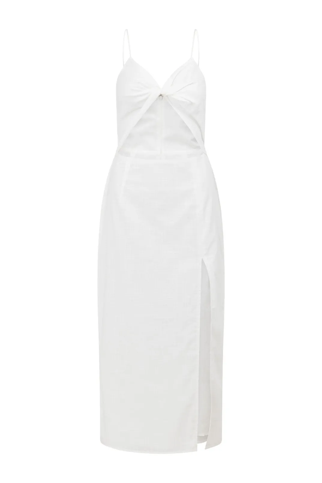 The Perfect Party Dress Has Arrived! The Ciri Cutout Midi Dress Is Made From A High Quality Natural Cotton Slub Fabric In White. It Features Thin Rouleau Straps, Twist Detail At Centre Bust, Cutout At Waist, Midi Length Skirt With Split At Side. Dress It Up With The Transparent Mules And Transparent Elle Bag! Designed Exclusively By Sabo.