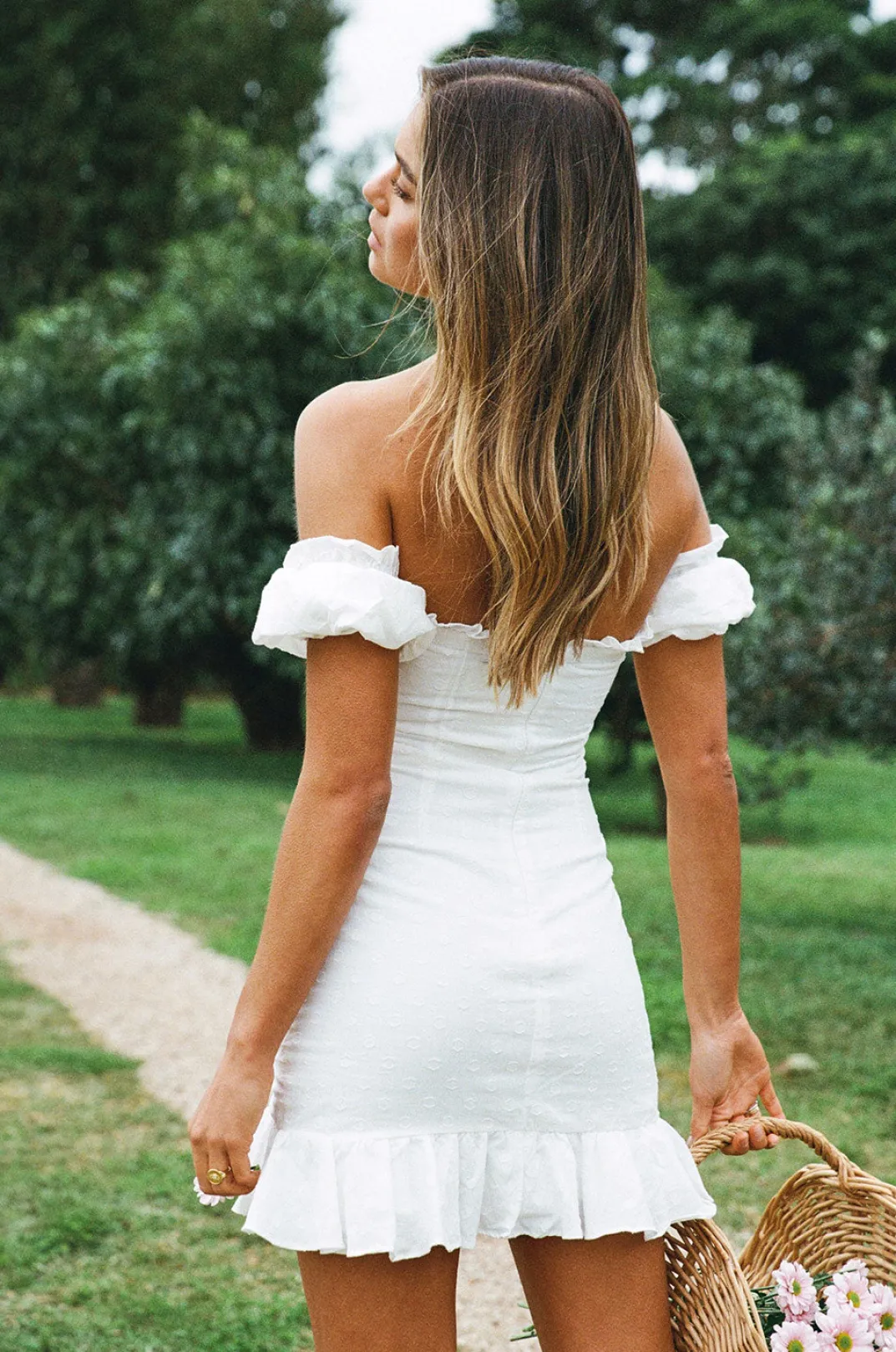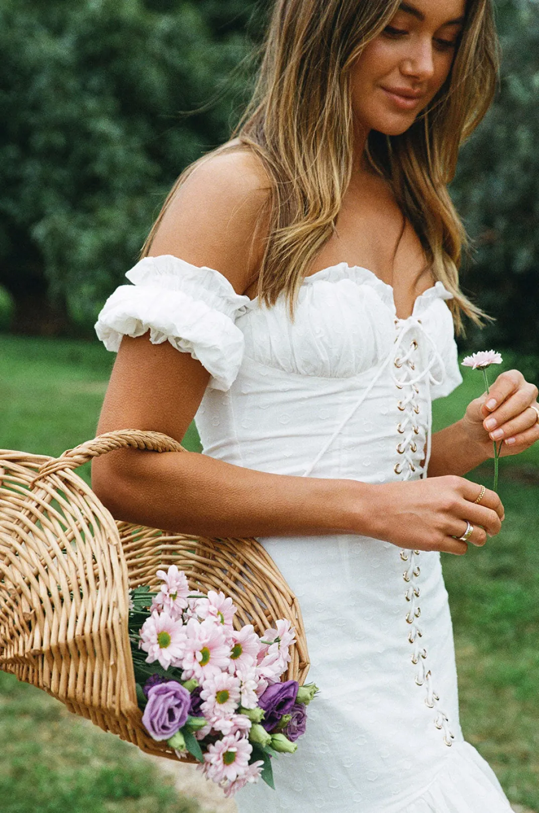 Designed To Flatter, The Costa Mesa Dress Is Made From A Stunning Dobby Spot Fabric In White. It Features A Corset Style Bodice With Ruching At Cups, Puffy Arm Sleeves, Lace Up At Centre Front And Frill Across Hemline. Pair With Nude Mules And Gold Accessories For Your Next Event! Exclusively Designed By Sabo.