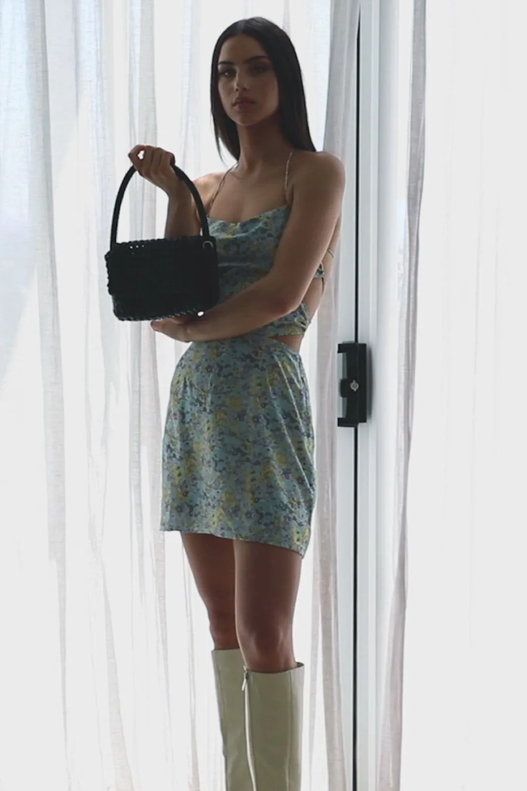 *This Is A Final Sale Item* Afternoon Drinks With Friends, We’Ve Got You Covered! The Emmeline Dress Is Made From A Super Lightweight Blue Fabric With A Floral Print. It Is A Backless Style Featuring Strappy Detailing, Straight Neckline And Cutouts At Waist. Style With The Kumi Bag And Transparent Mules! Designed Exclusively By Sabo.