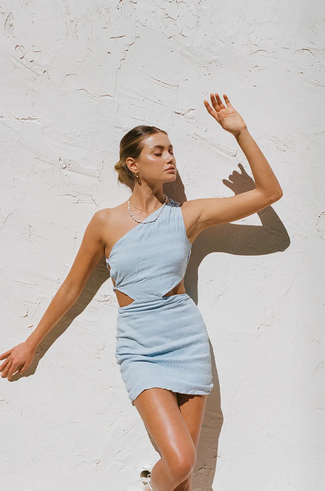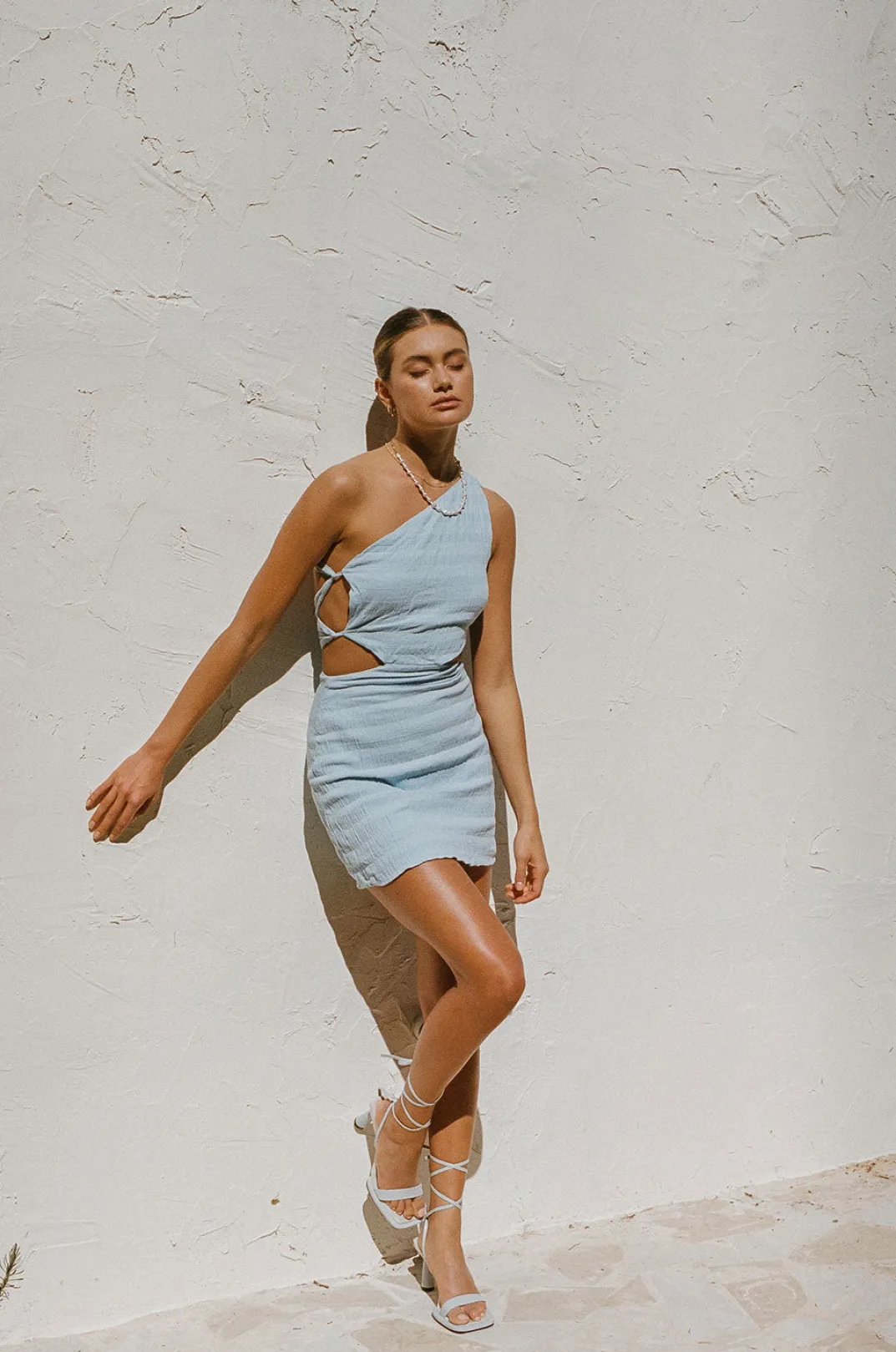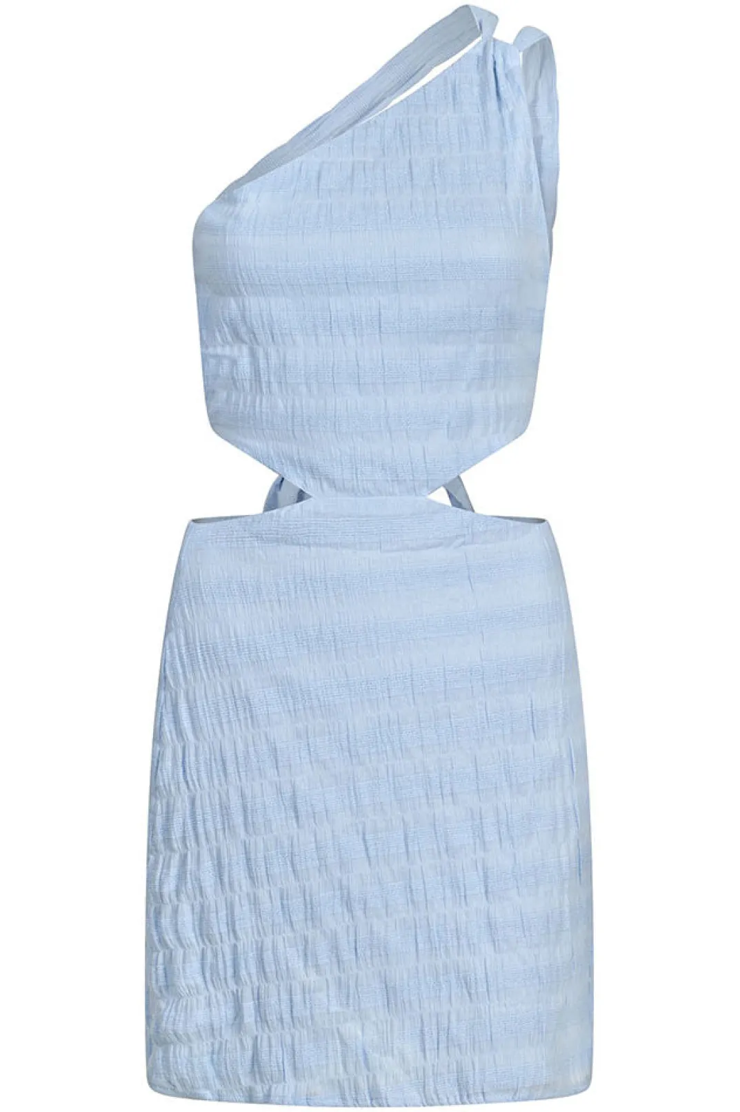 Perfect For Party Season, The Everly Dress Is Made From A Lightweight Natural Cotton Fabric In A Baby Blue Hue Featuring Featuring Cutouts At Side Waist And One Shoulder Design. Style Your Look With The Strappy Asteria Heels And Briella Earrings! Designed Exclusively By Sabo.