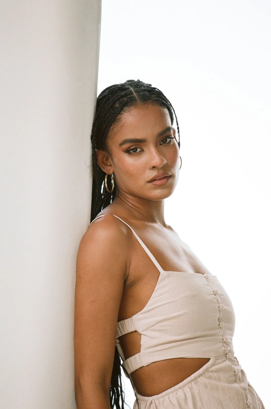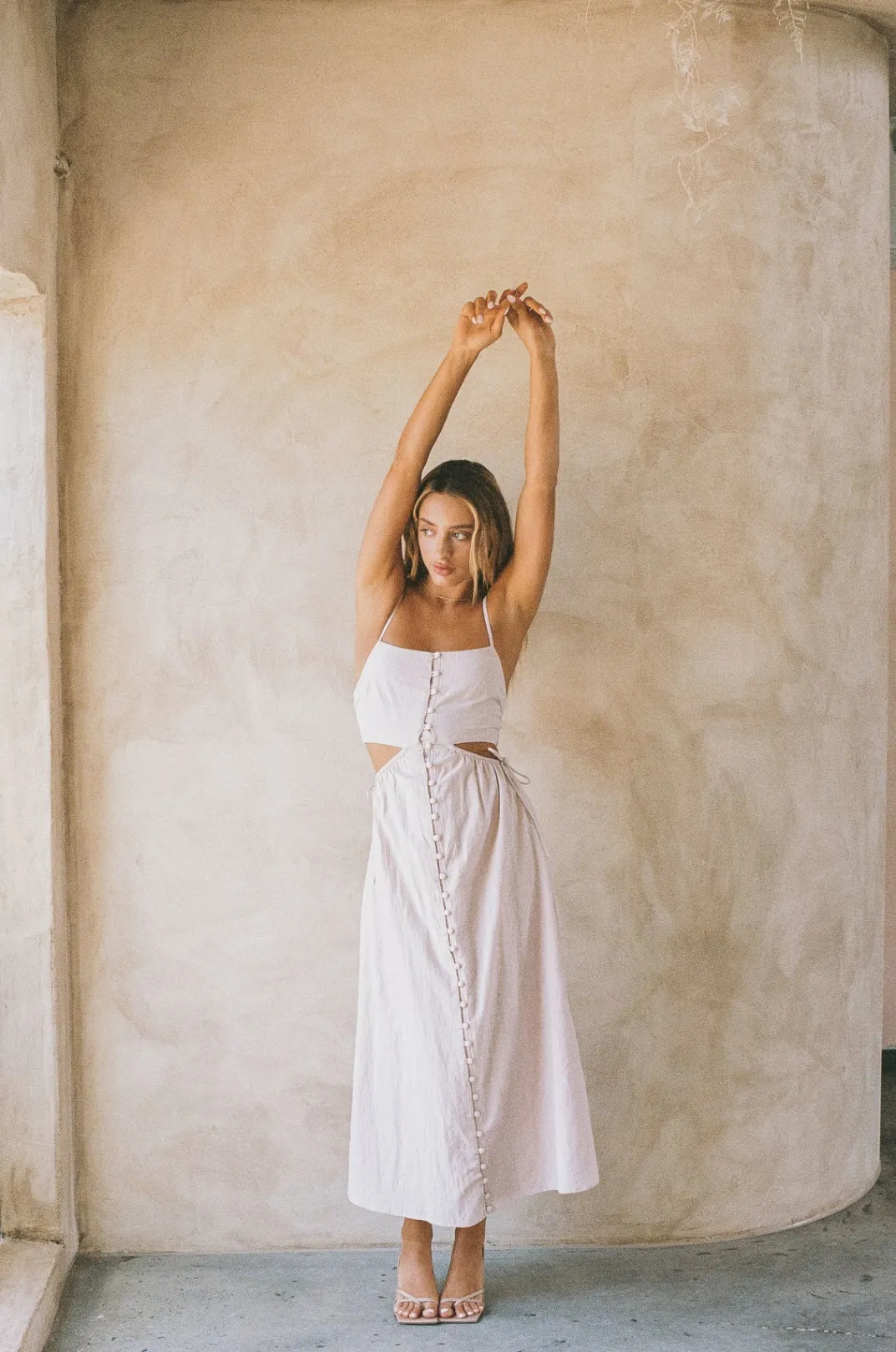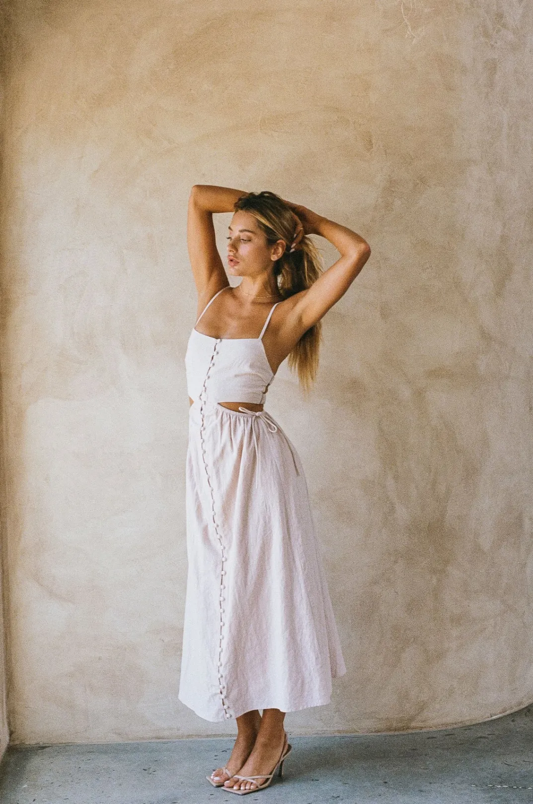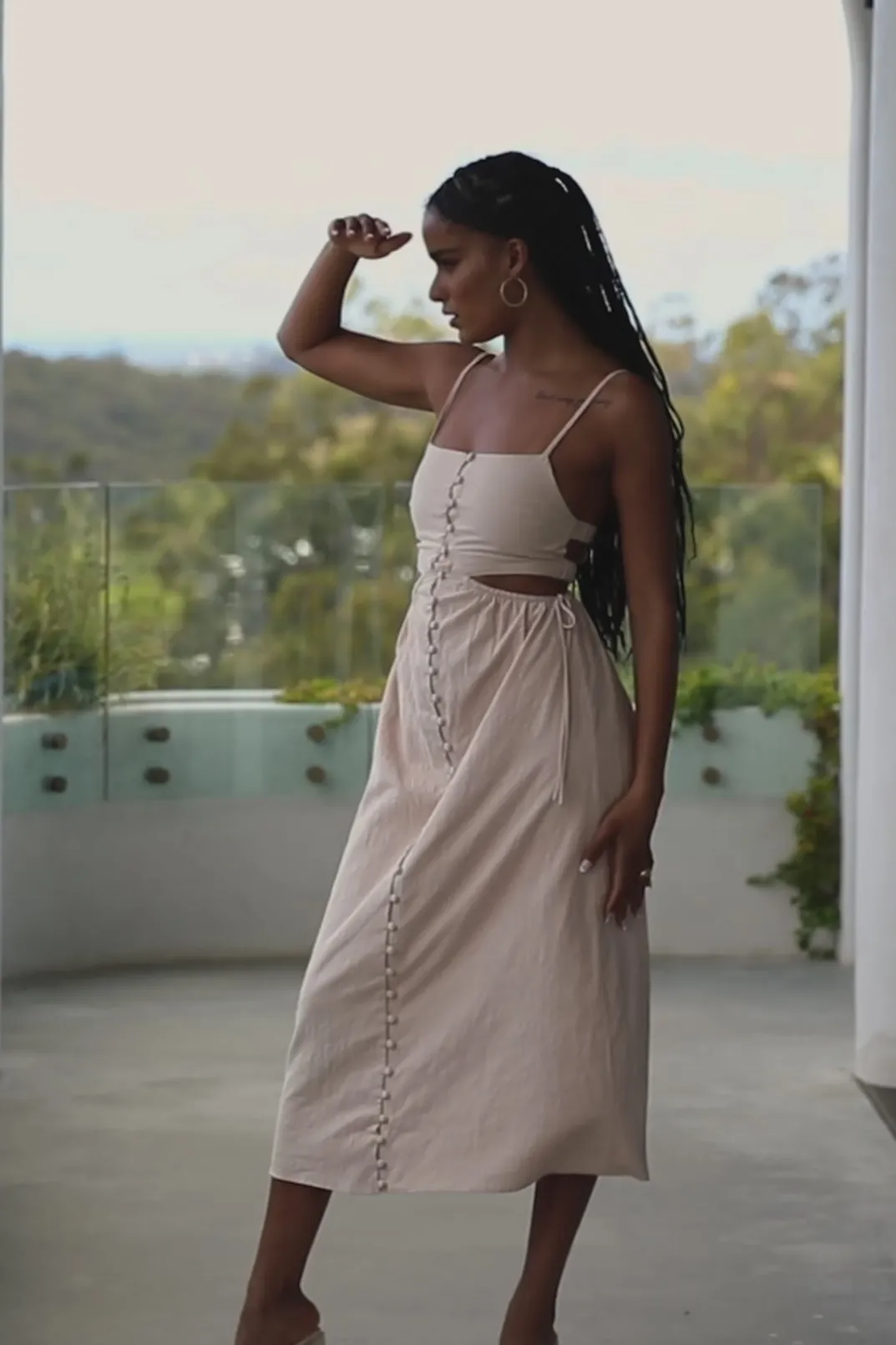 The Perfect Style That Can Be Dressed Up With Heels Or Dressed Down With Slides! The Harmony Dress Is Made From A High Quality Natural Cotton Fabric In A Sandy Beige Hue. It Features Covered Button Details Down Centre Front, Cutouts At Waist And A Pleasant Relaxed Skirt. Style With The Strappy Rafaela Heels And Jamilla Bag! Designed Exclusively By Sabo.
