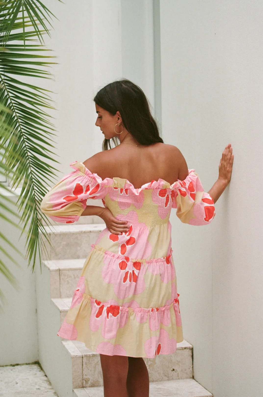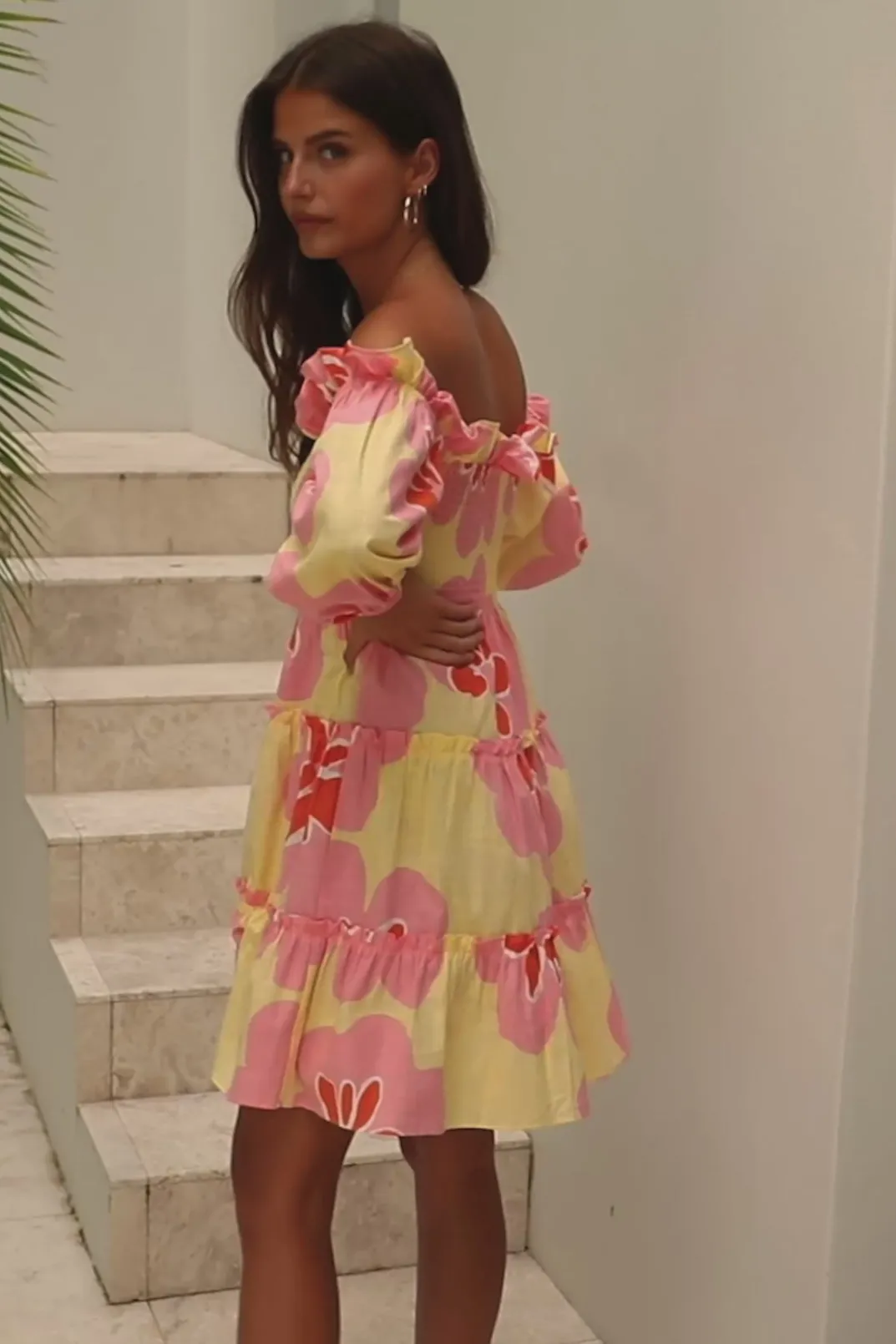 Introducing Our Brand New Exclusive Hana Yellow Print! The Jaia Off Shoulder Dress Is Made From A High Quality Natural Cotton Fabric And Features Bold Off Shoulder Sleeves, Shirred Bust, Frill And Ruffle Trim Details Throughout And A Relaxed Babydoll Mini Skirt. Pair With Sandals For A Super Cute Weekend Look! Designed Exclusively By Sabo.