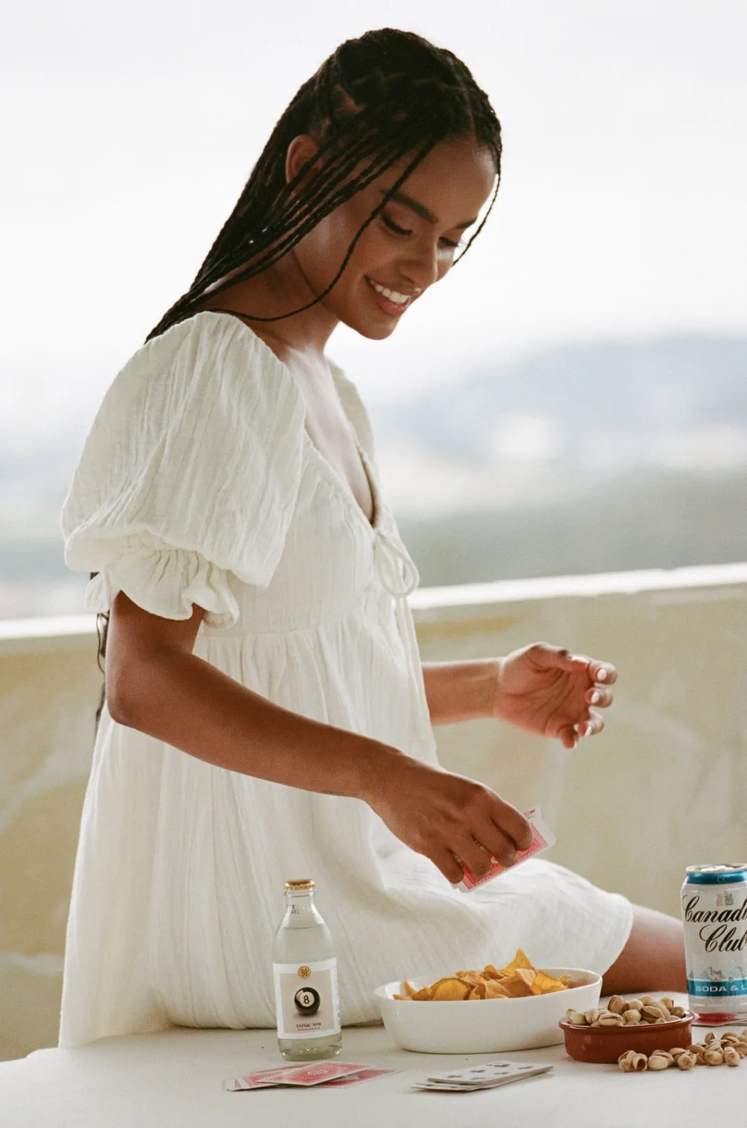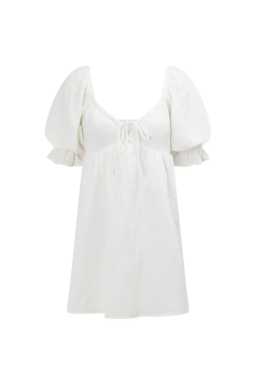 A Super Cute Lwd Perfect For A Family Lunch Or Your Vacation Wardrobe! The Kartia Dress Is Made From A Structured Natural Cotton Fabric In White. It Features Billowing Puff Sleeves With Frill Detail, Rouleau Tie At Centre Bust And Flowy Skirt. Keep It Casual With Chunky Sandals Or Dress It Up With The Strappy Rafaela Heels! Designed Exclusively By Sabo.