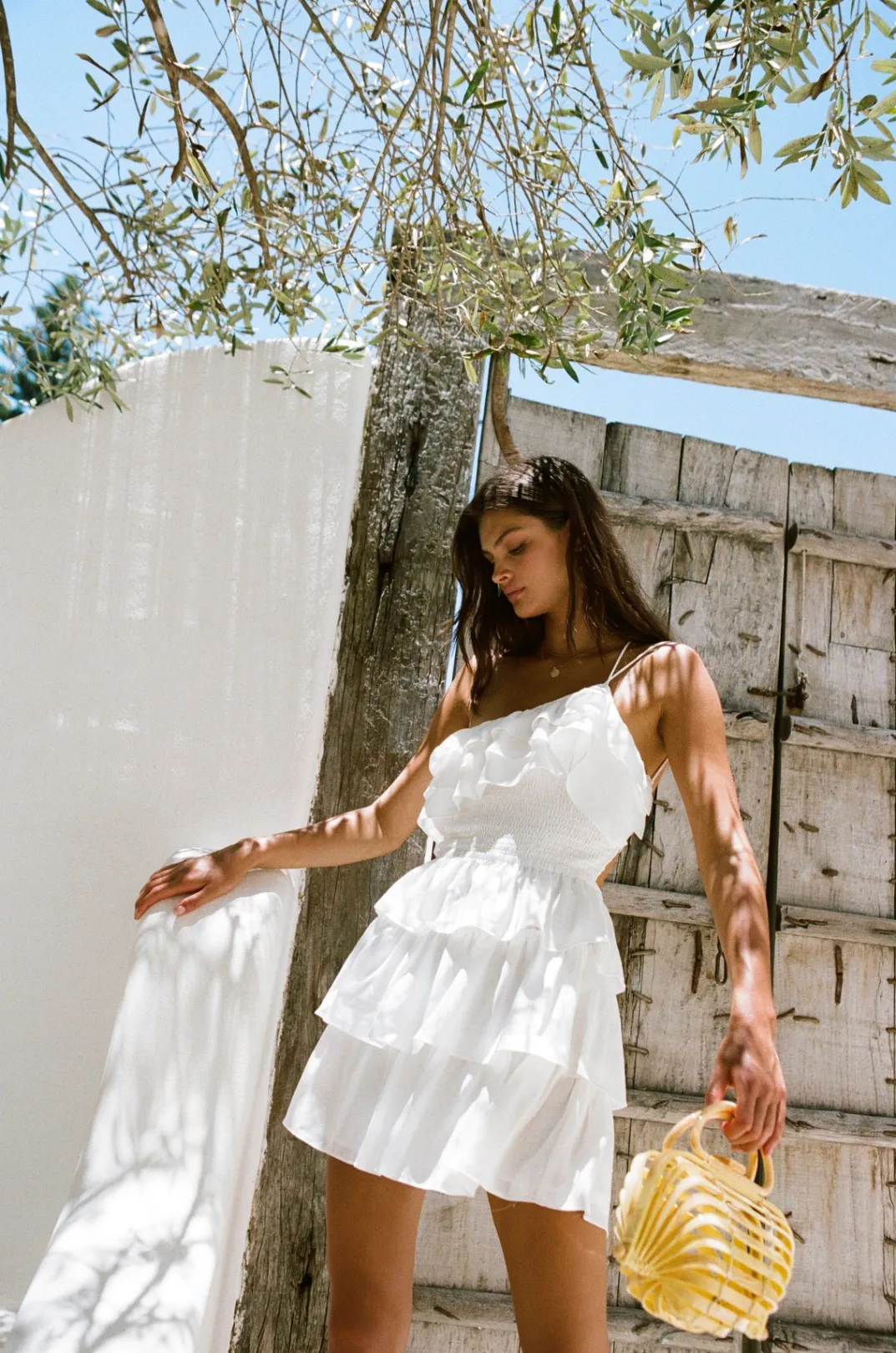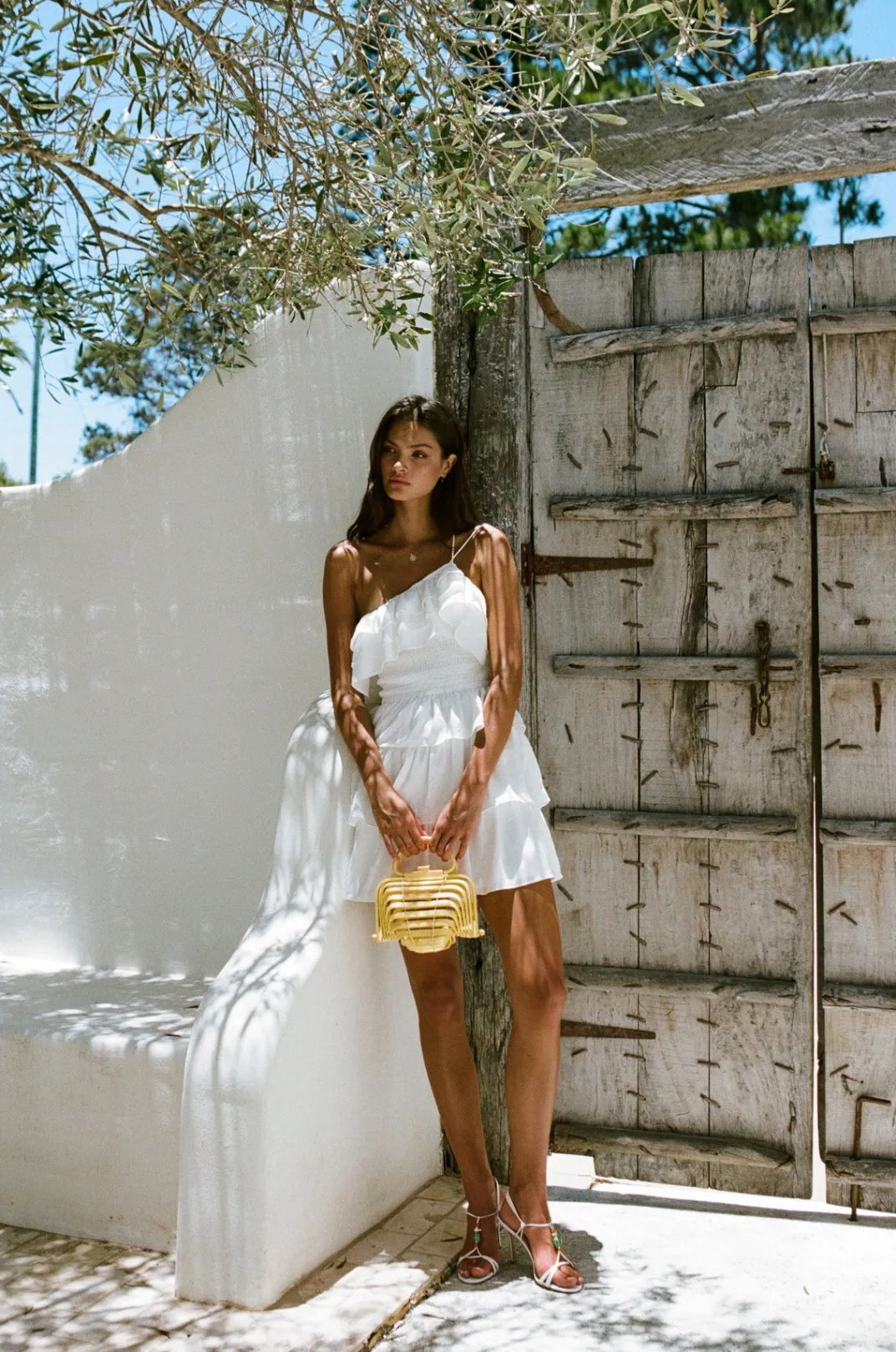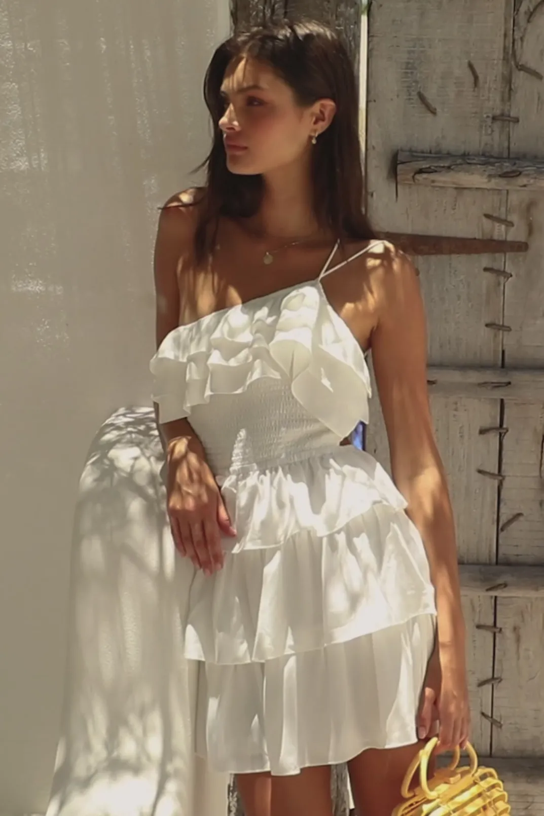 The Perfect Party Piece For Our Feminine Girlies Has Arrived! The Khean Frill Dress Is Made From A Crepe-Feel Fabric In White. It Features Asymmetric Straps And Neckline, Triple Frill Details Across Neckline And Skirt And A Shirred Bodice. Dress It Up With The Strappy Rafaela Heels! Designed Exclusively By Sabo.