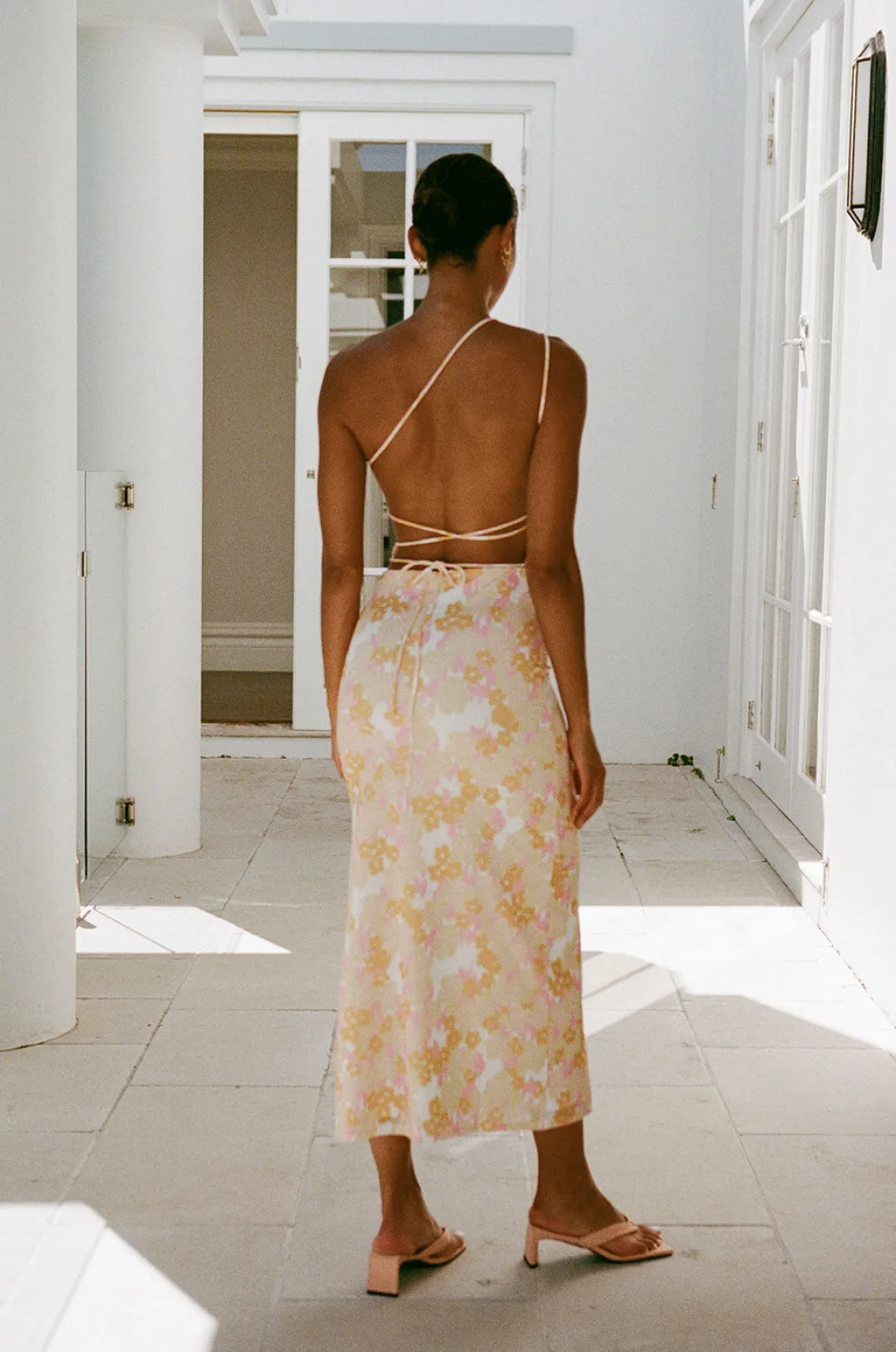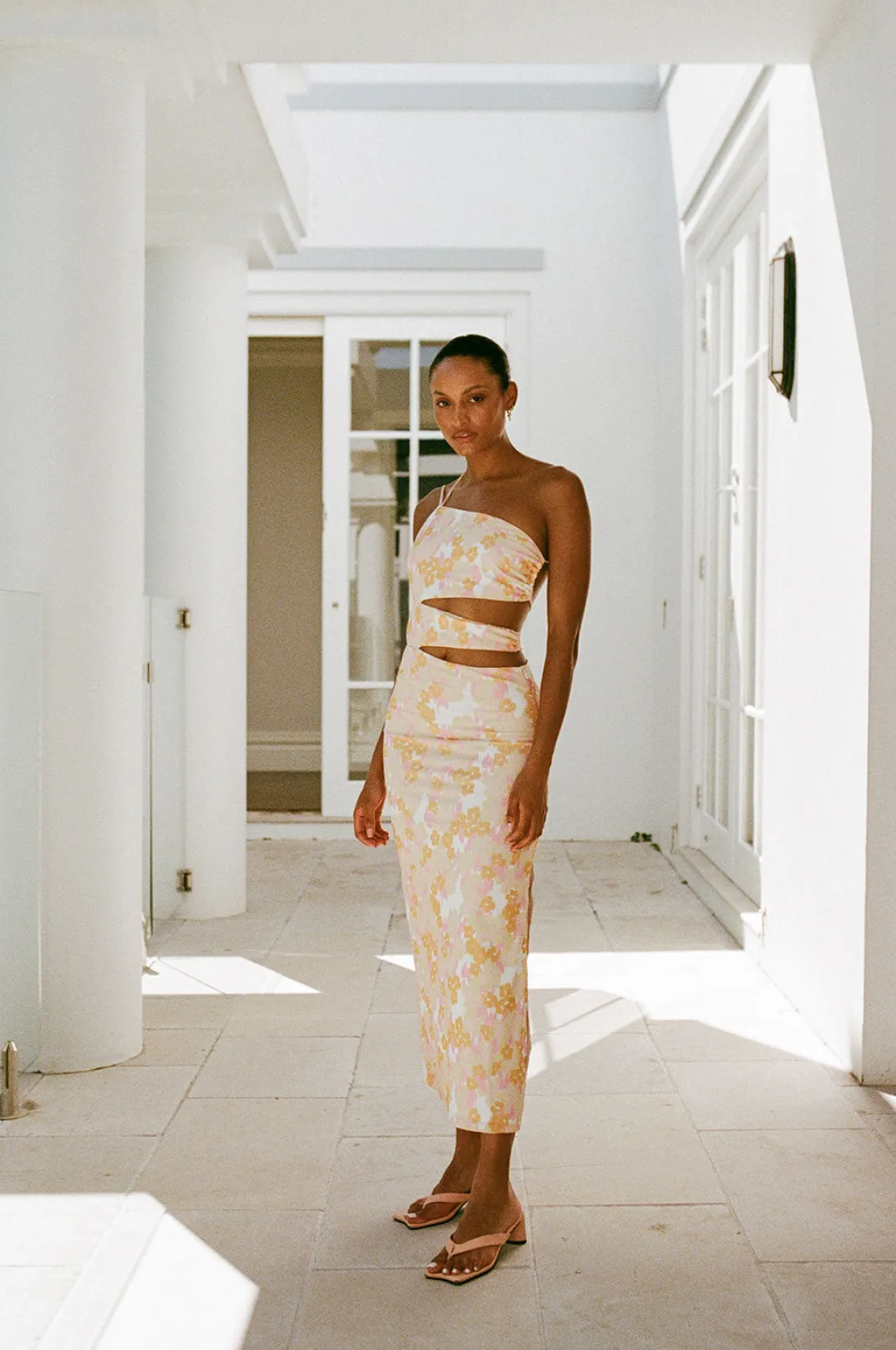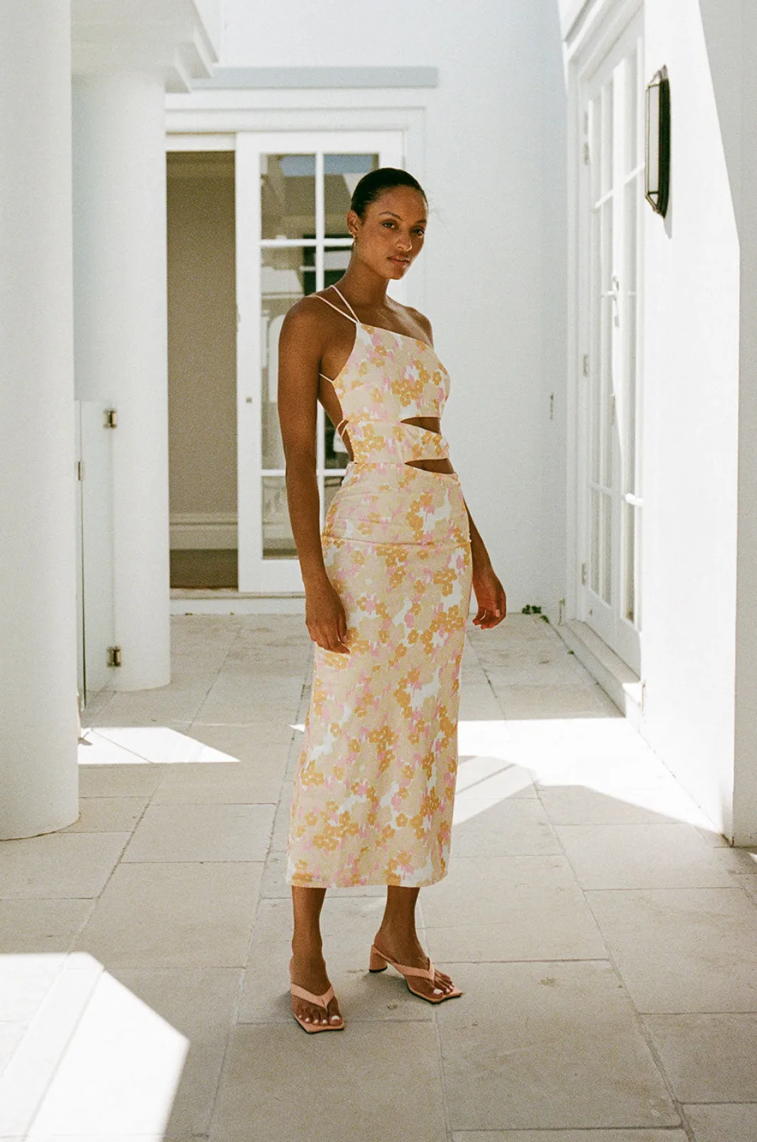 Lunch With The Girls Or An Upcoming Event, The Kika Dress Is Designed To Flatter! Made From A Stunning Power Mesh Fabric With Our Exclusive Smudge Ditzy Print,It Features An Open Back With Strappy Detailing, Asymmetric Neckline, Twin Straps, Cutouts At Waist And Midi Skirt With Split At Centre Back. Get The Look With The Peyton Mules! Designed Exclusively By Sabo.