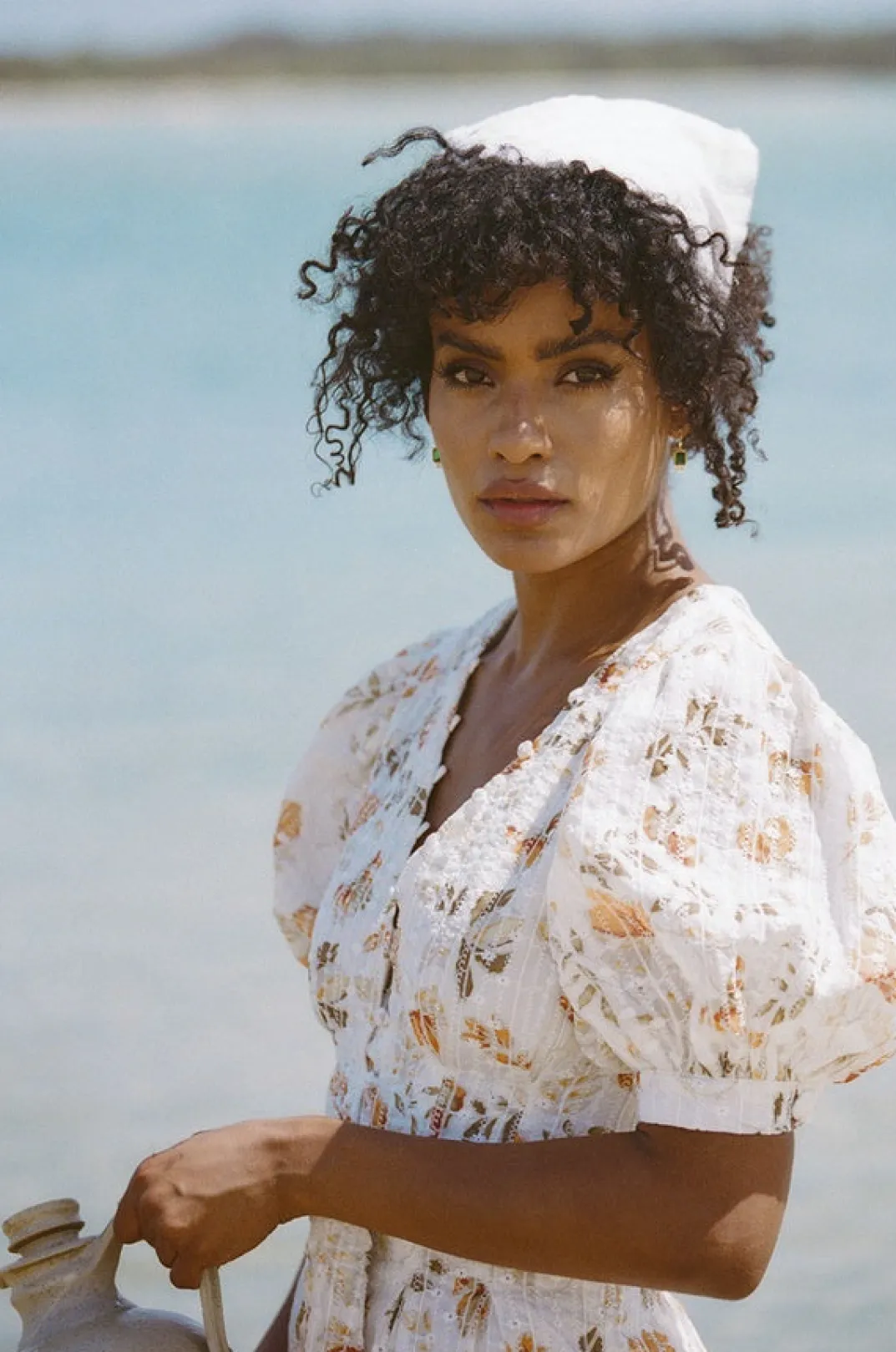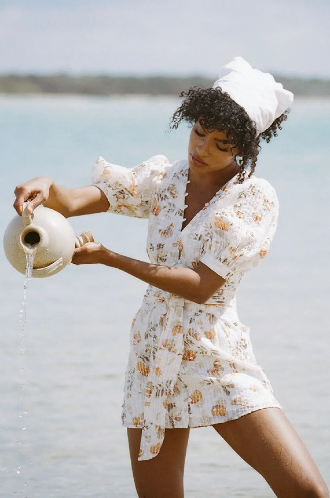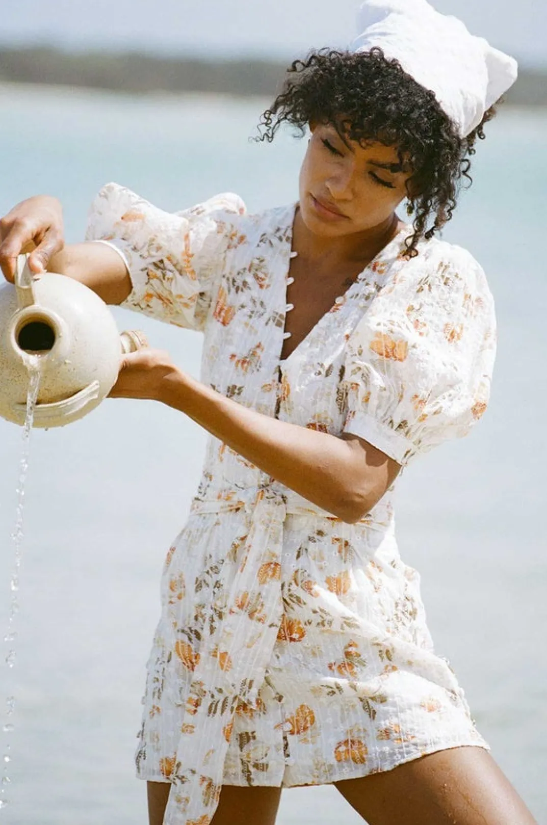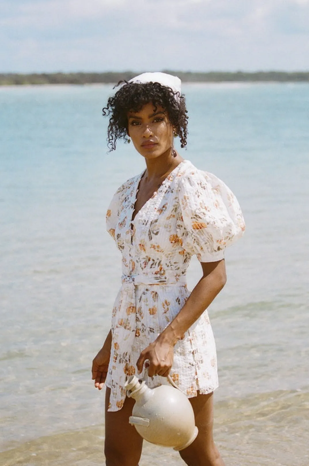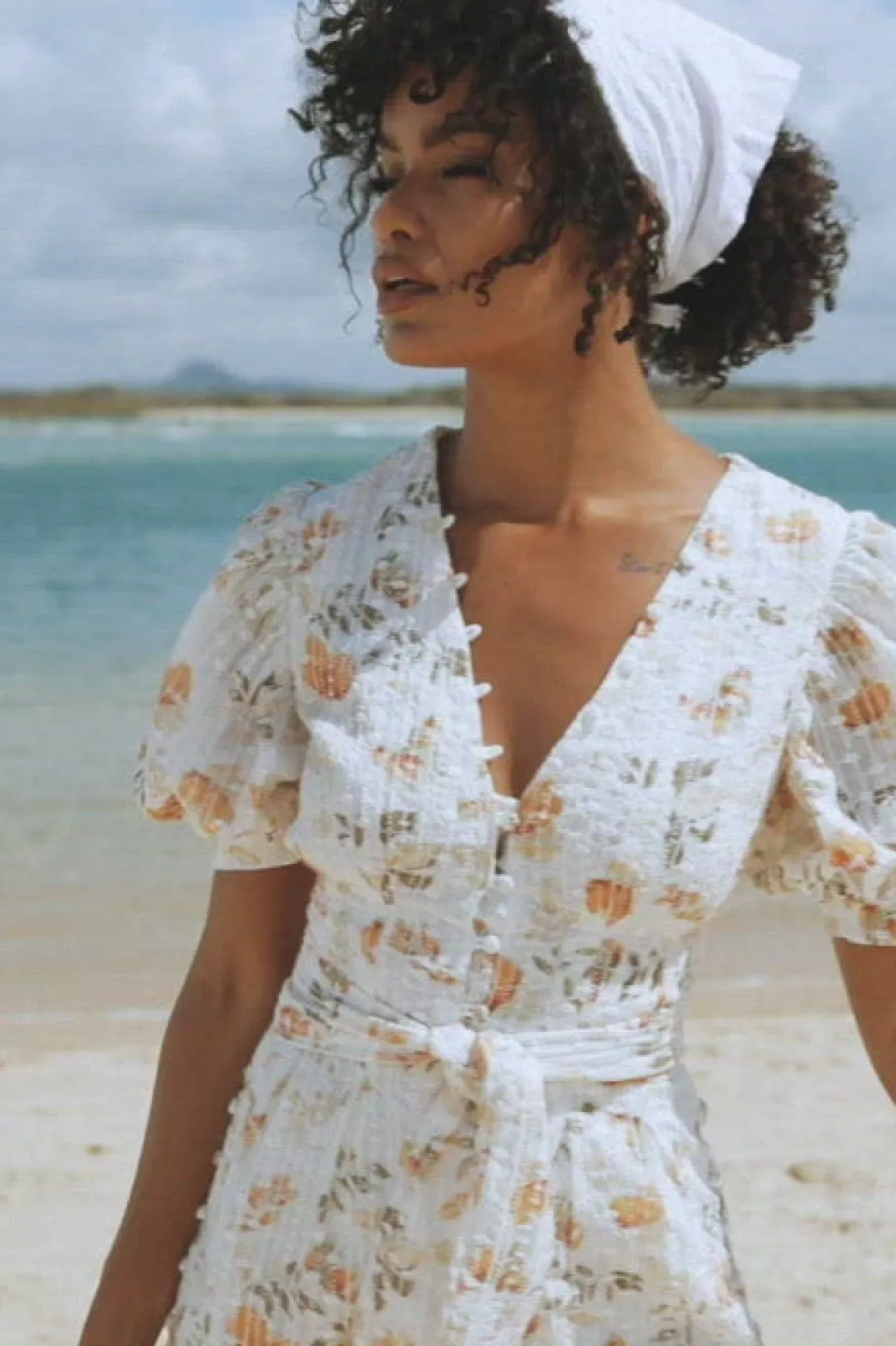 *This Is A Final Sale Item* *Back In Stock* The ‘It’ Dress Has Landed! The Kori Dress Is Made From An Off White Fabric With Orange Floral Print And Embroidered Line Detailing Throughout. It Features A Plunging V Neckline With Covered Button Detailing Down Centre Front And Sides Of Skirt, Short Puff Sleeves And A Matching Waist Tie. Get The Look With The Strappy Kenny Heels And Apollo Necklace! Designed Exclusively By Sabo.