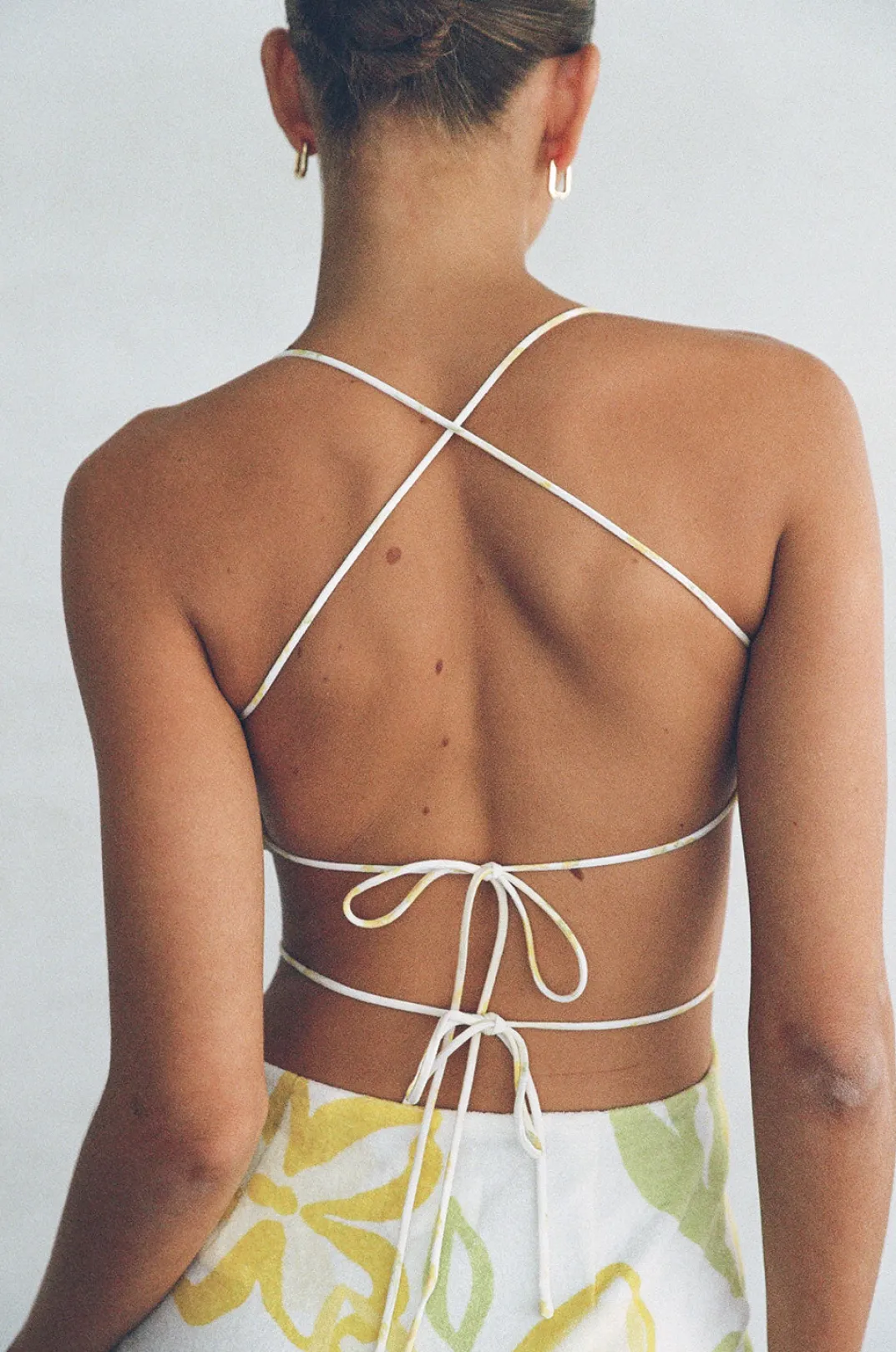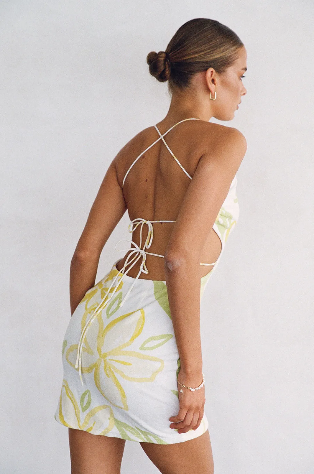 The Perfect Summer Dress Has Arrived! The Lola Dress Is Made From A Natural Cotton Towelling Fabric With Our Exclusive Citrus Floral Print. It Is A Backless Style Featuring Strappy Tie Detailing, Straight Neckline, Cutouts At Waist, Adjustable Drawstrings At Sides And Gathered Detailing Throughout. Designed Exclusively By Sabo.
