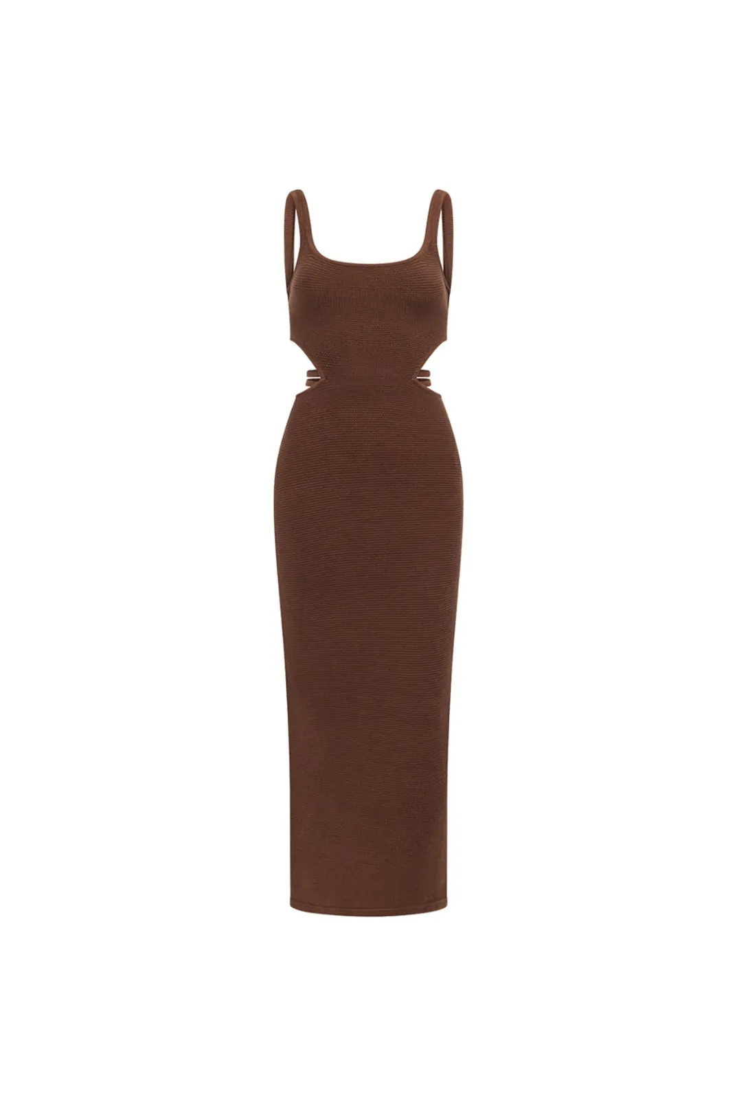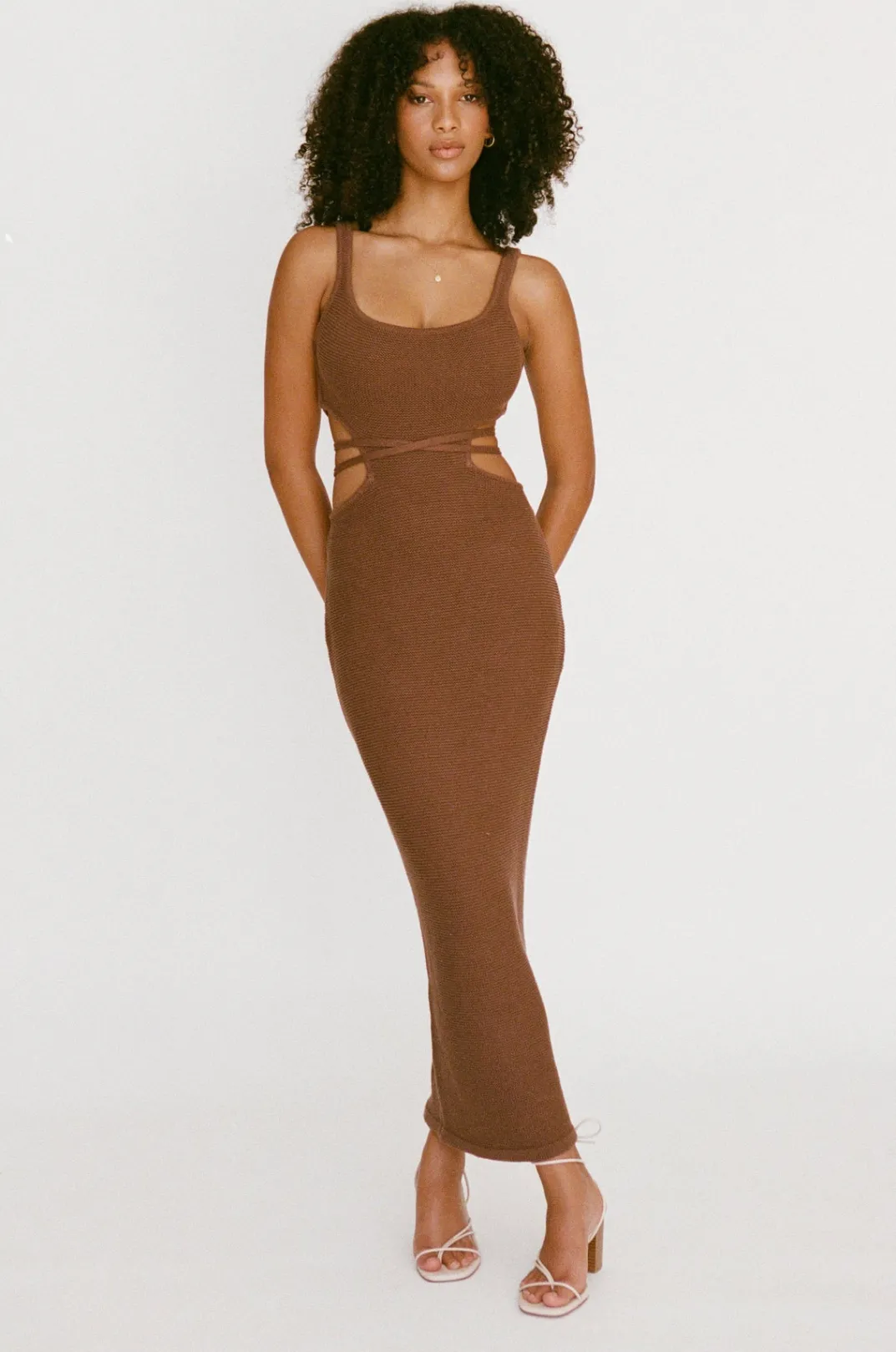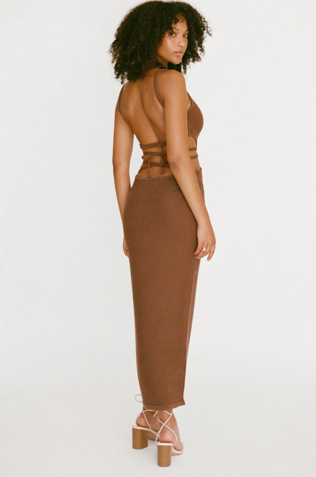 Wear It To Dinner With The Girls Or On Date Night! The London Knit Dress Is Made From A Natural Knitted Cotton Fabric In A Chocolate Hue. It Is A Backless Style Featuring A Scoop Neckline, Tie Detail At Waist And 7/8 Length. Pair With The Jamilla Bag And Strappy Rafaela Heels! Designed Exclusively By Sabo.