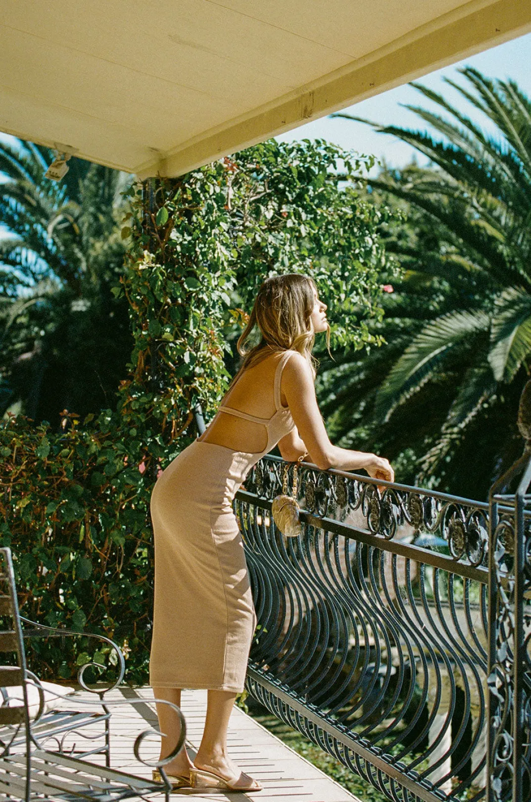 Wear It To Dinner With The Girls Or On Date Night! The London Knit Dress Is Made From A Natural Knitted Cotton Fabric In A Tan Hue. It Is A Backless Style Featuring A Scoop Neckline, Cutouts At Waist And Midi Length. Pair With The Rico Handle Bag And And Strappy Lilly Heels! Designed Exclusively By Sabo.