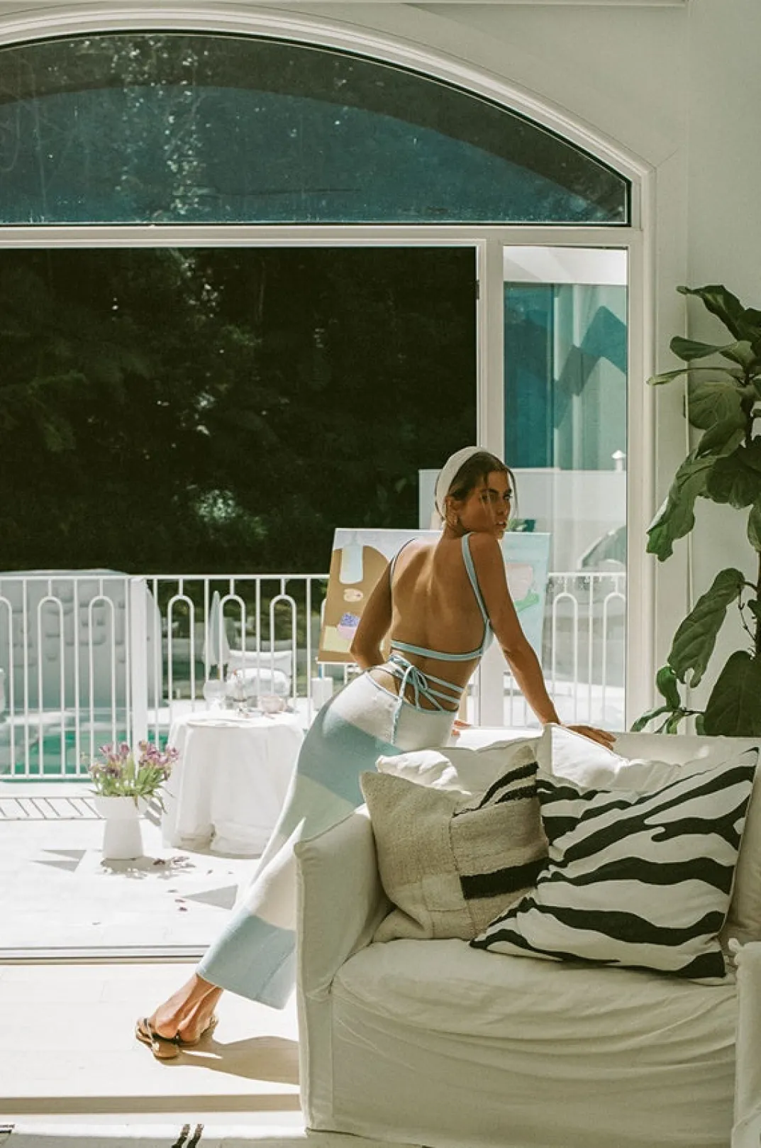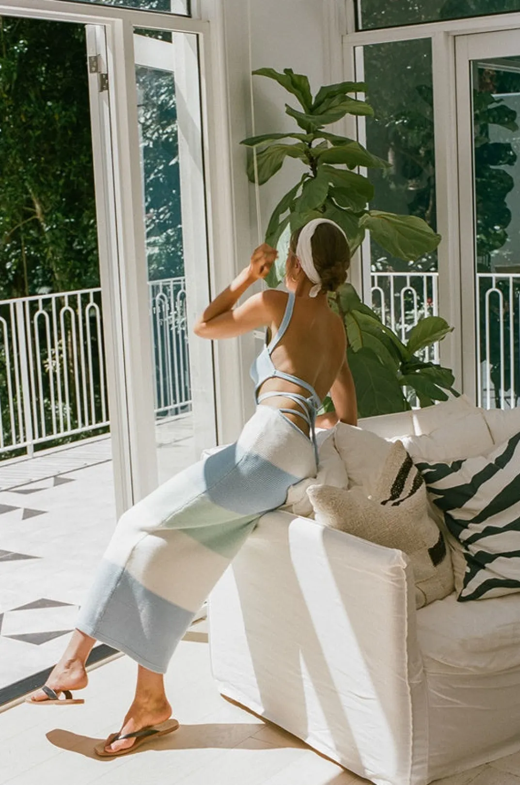*This Is A Final Sale Item And Cannot Be Returned. See Our Returns Policy Here *Back In Stock* Wear It To Dinner With The Girls Or On Date Night! The London Knit Dress Is Made From A Natural Knitted Cotton Fabric In Blue, Green And White Hues. It Is A Backless Style Featuring A Scoop Neckline, Tie Detail At Waist And 7/8 Length. Pair With The Rico Handle Bag And And Strappy Verde Heels! Designed Exclusively By Sabo.