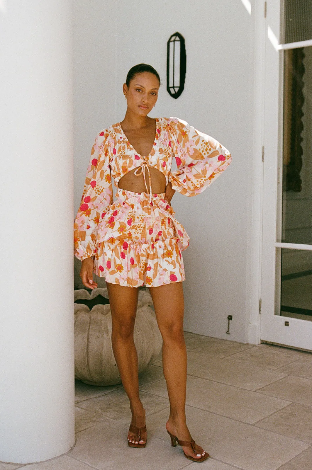 Blending Tight Panels And Frills To Flatter, Thelorde Cutout Dress Is Made From A Crinkle Fabric With Our Exclusive Peach Bud Floral Print. It Features Billowing Full Length Puff Sleeves, V Neckline With Covered Buttons And Tie Details, Shirred Panels Across Bodice, Cutout At Waist, Fitted Shirred Skirt And Frill Panels At Hips And Hem. Pair With The Transparent Mules For Your Next Event! Designed Exclusively By Sabo.