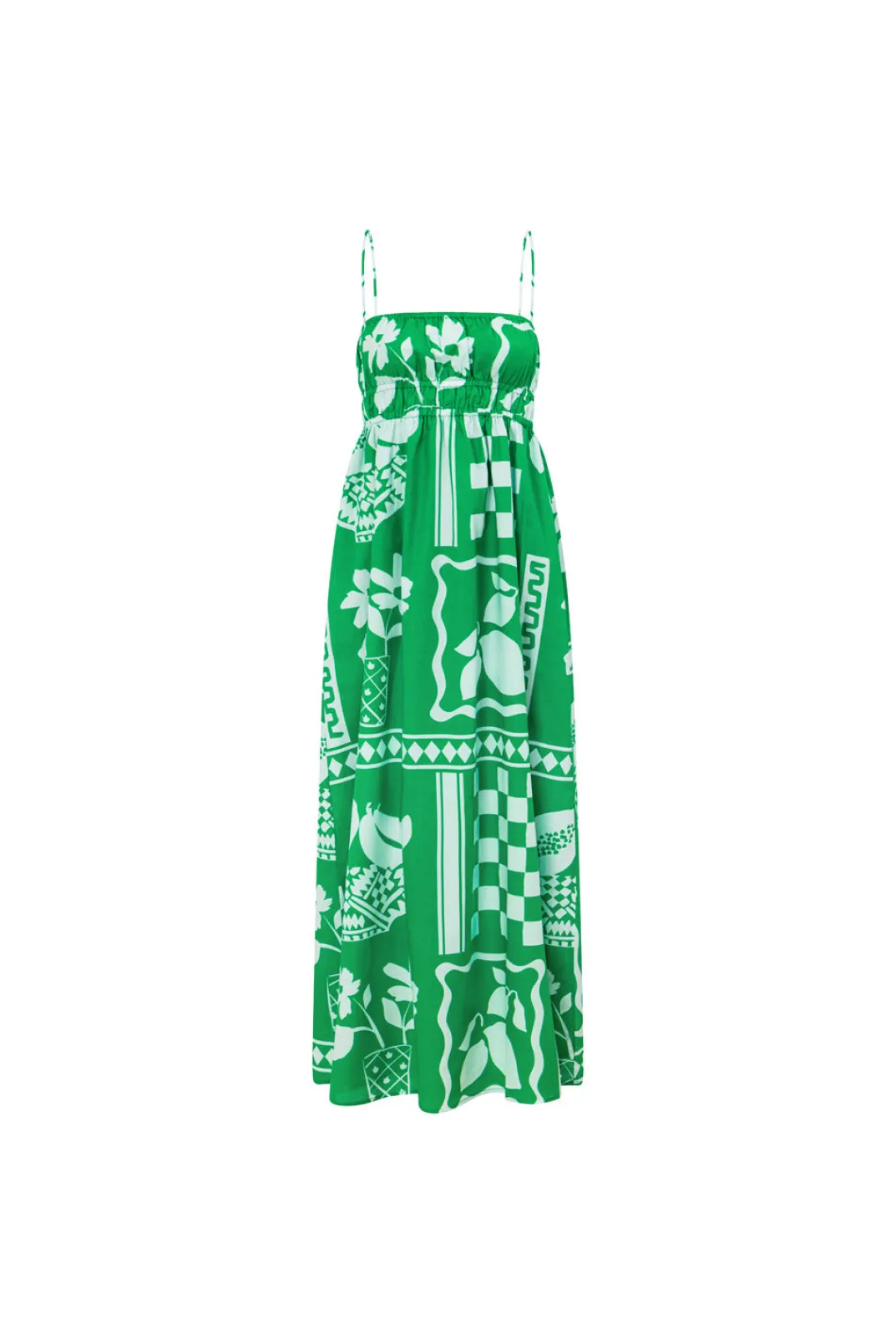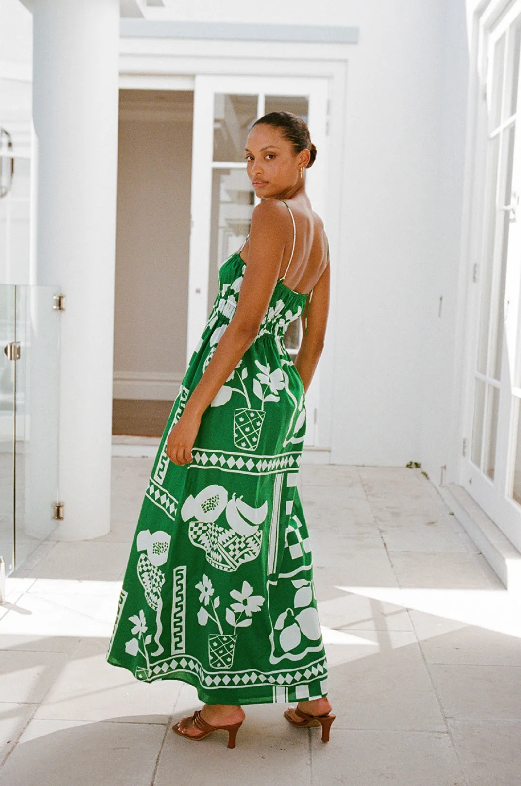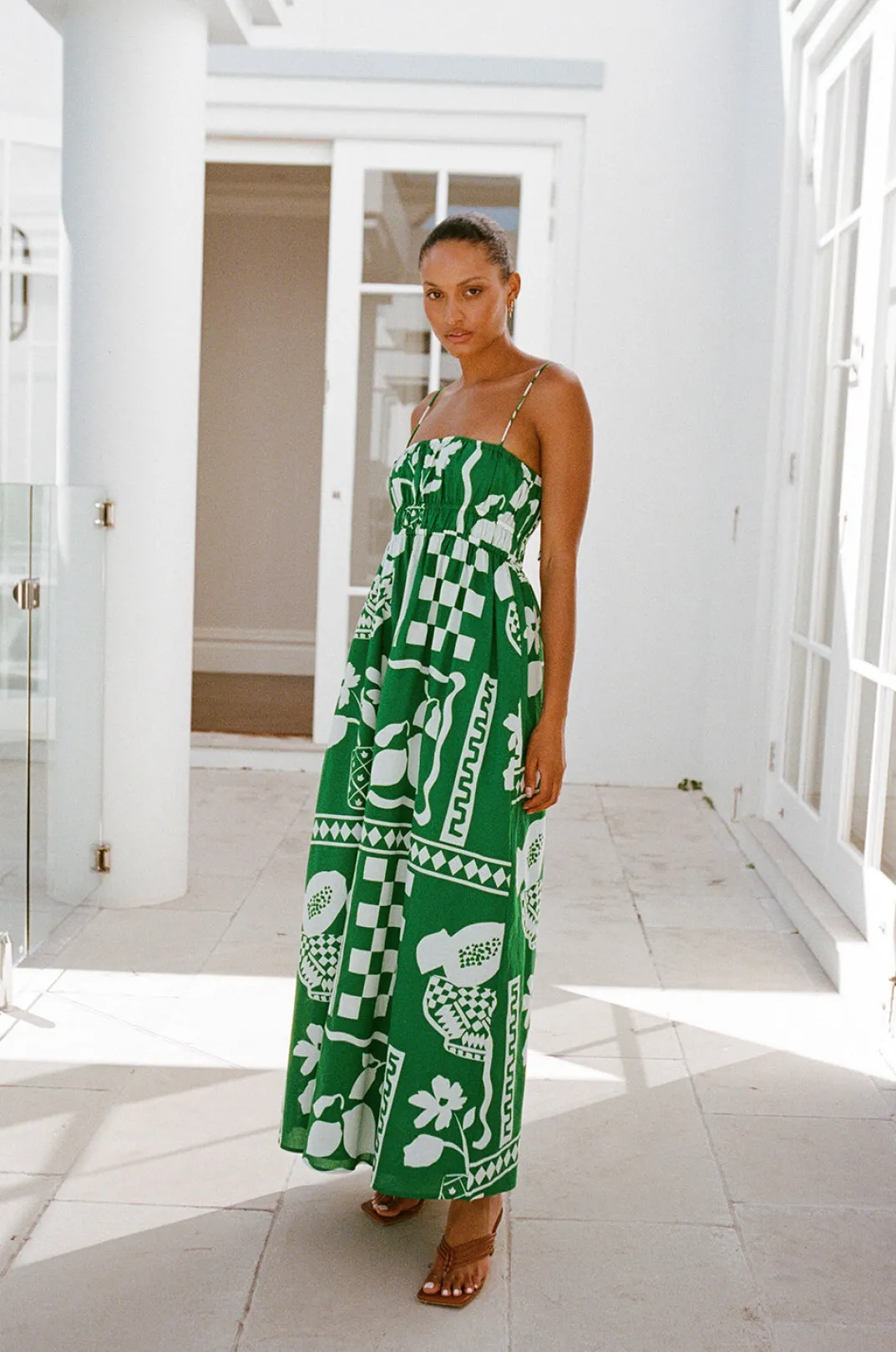 The Perfect Piece For A Long Lunch, Themaia Dress Is Made From A High Quality Natural Cotton Voile Fabric With Our Exclusive New Lemoni Green Print. It Features Thin Rouleau Straps Which Can Be Adjusted At Back, Straight Neckline, Elastic Panels At Neckline, Under Bust And Waist And A Full, Flouncy Maxi Skirt. Style Your Look With The Catalina Heels! Designed Exclusively By Sabo.