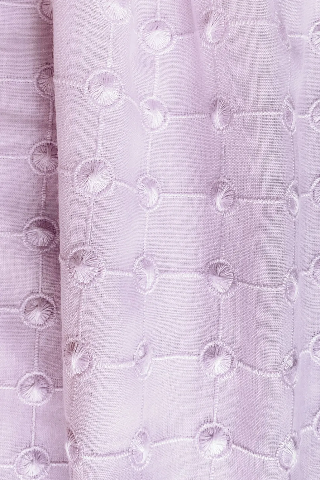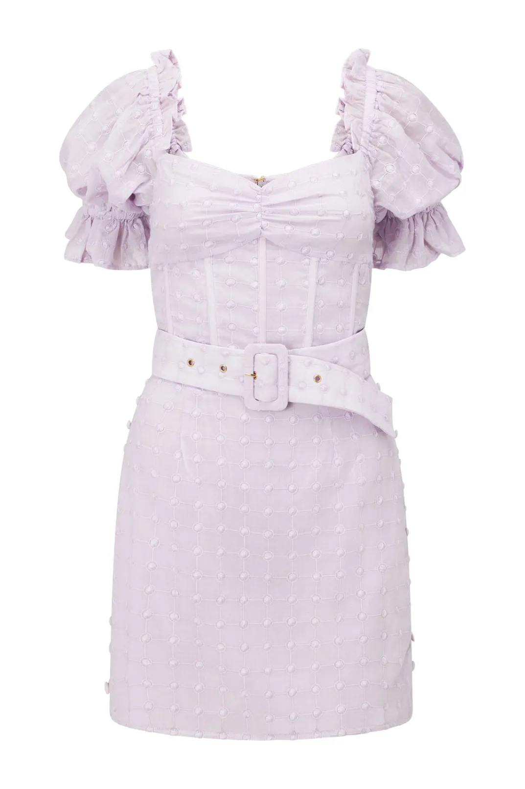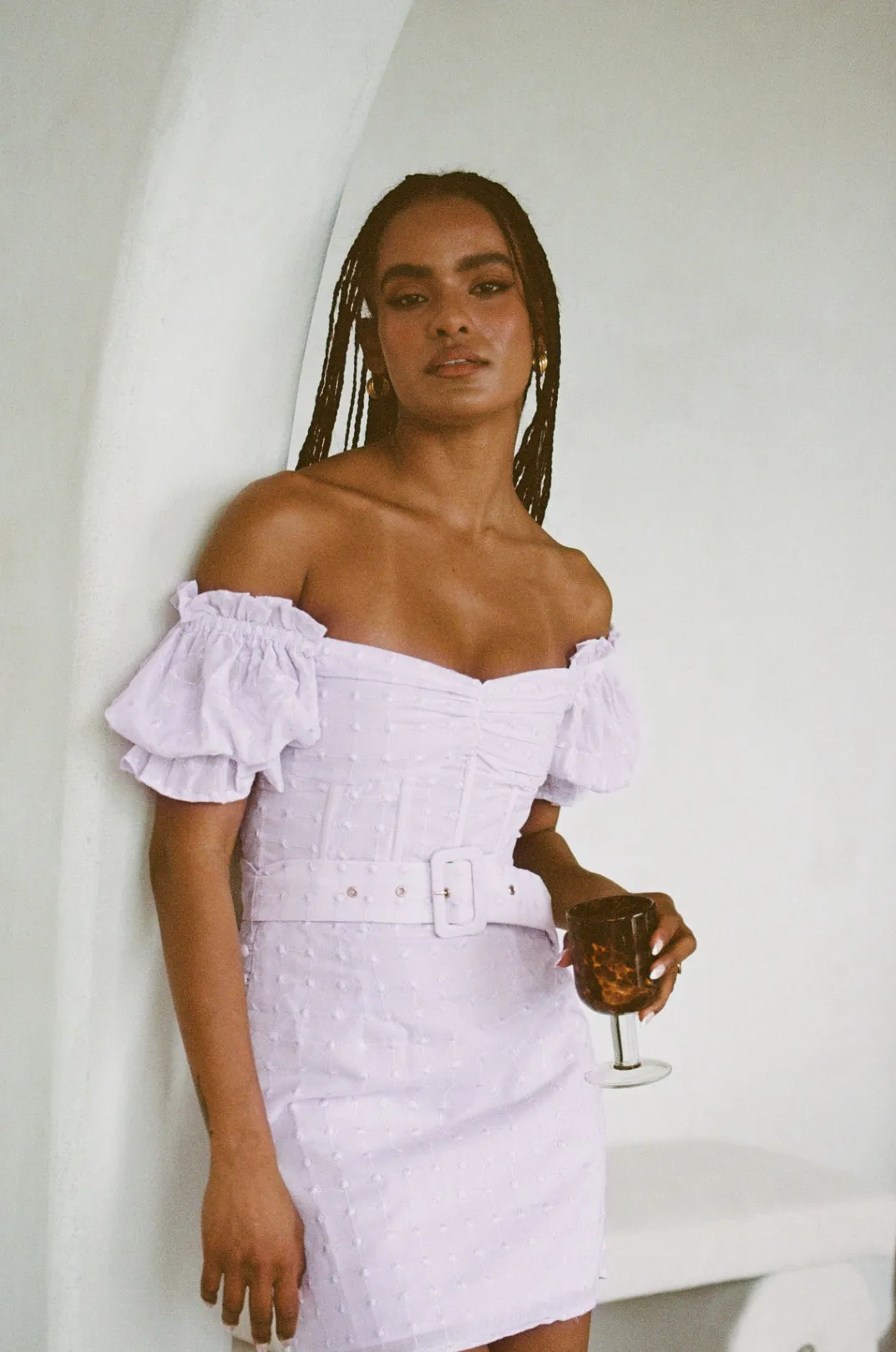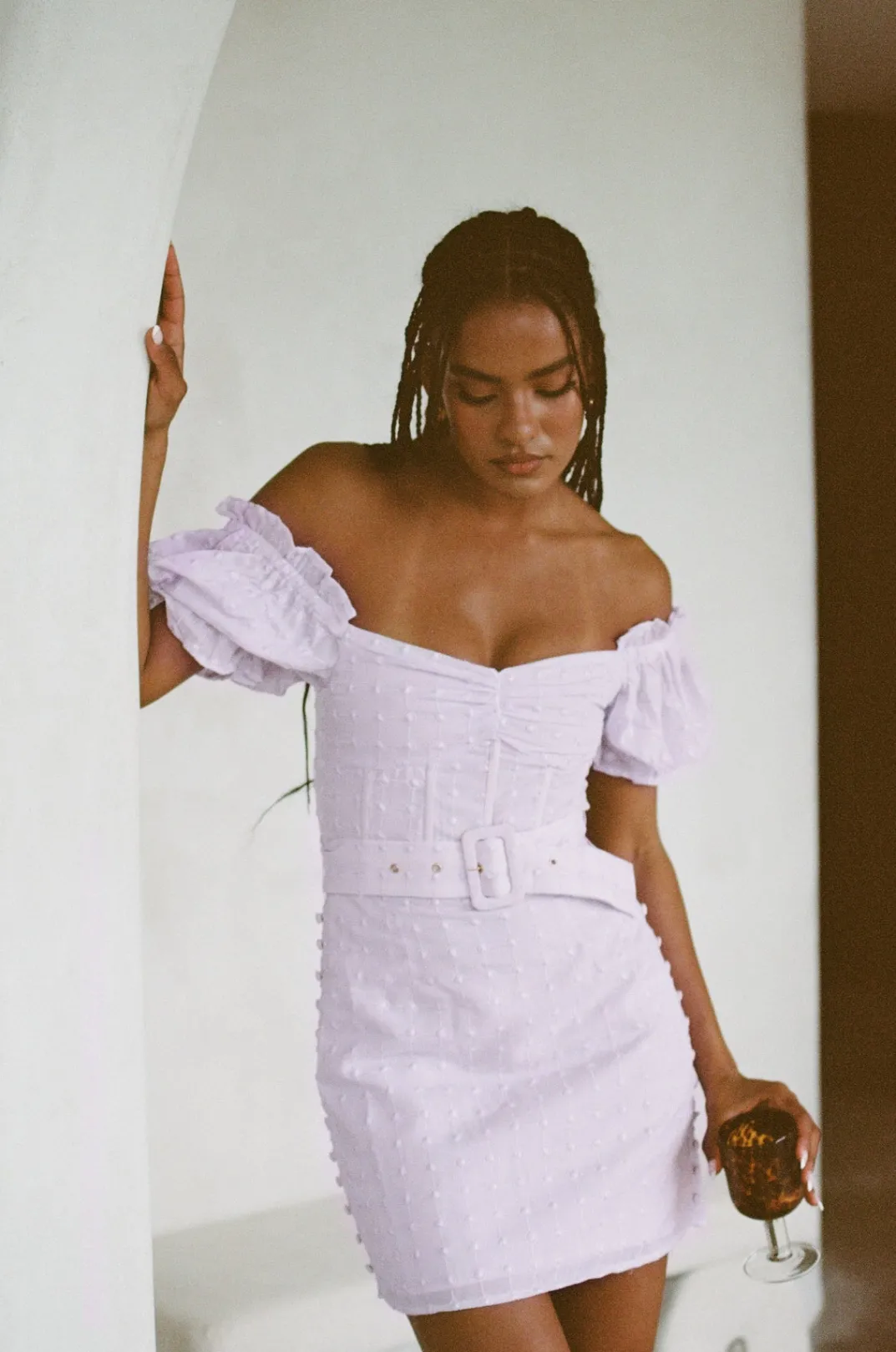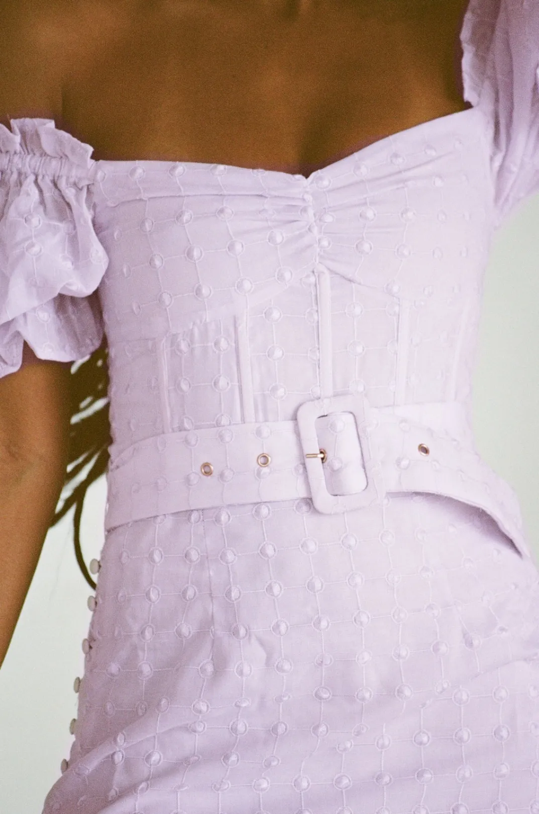 Structured Fabric With Feminine Details! The Marcelie Dress Is Made From A Textured Spot Embroidered Voile Fabric In A Soft Lilac Hue. It Is An Off Shoulder Style Featuring Short Puff Sleeves With Frill Trim Details, Gathering At Centre Bust, Boned Corseted Waist, Matching Structured Belt And Covered Buttons Down Sides Of Skirt. Style Your Look With Some Heels And Gold Accessories For Your Next Event! Designed Exclusively By Sabo.