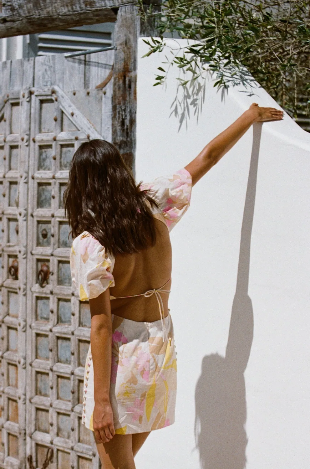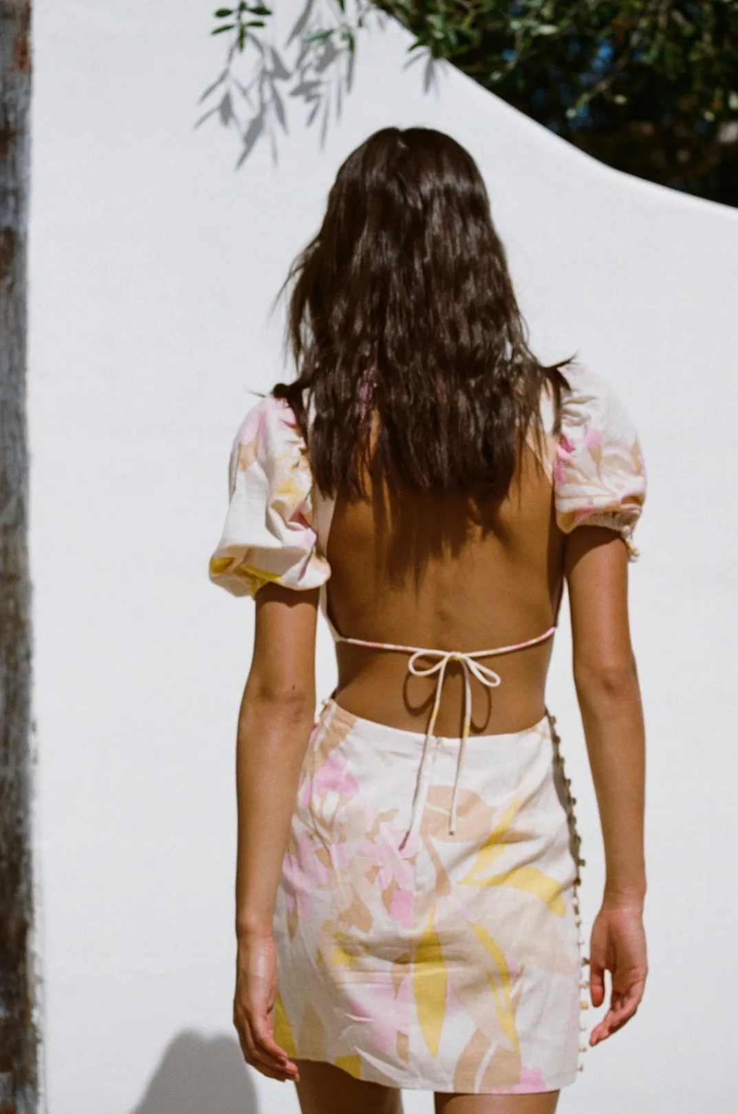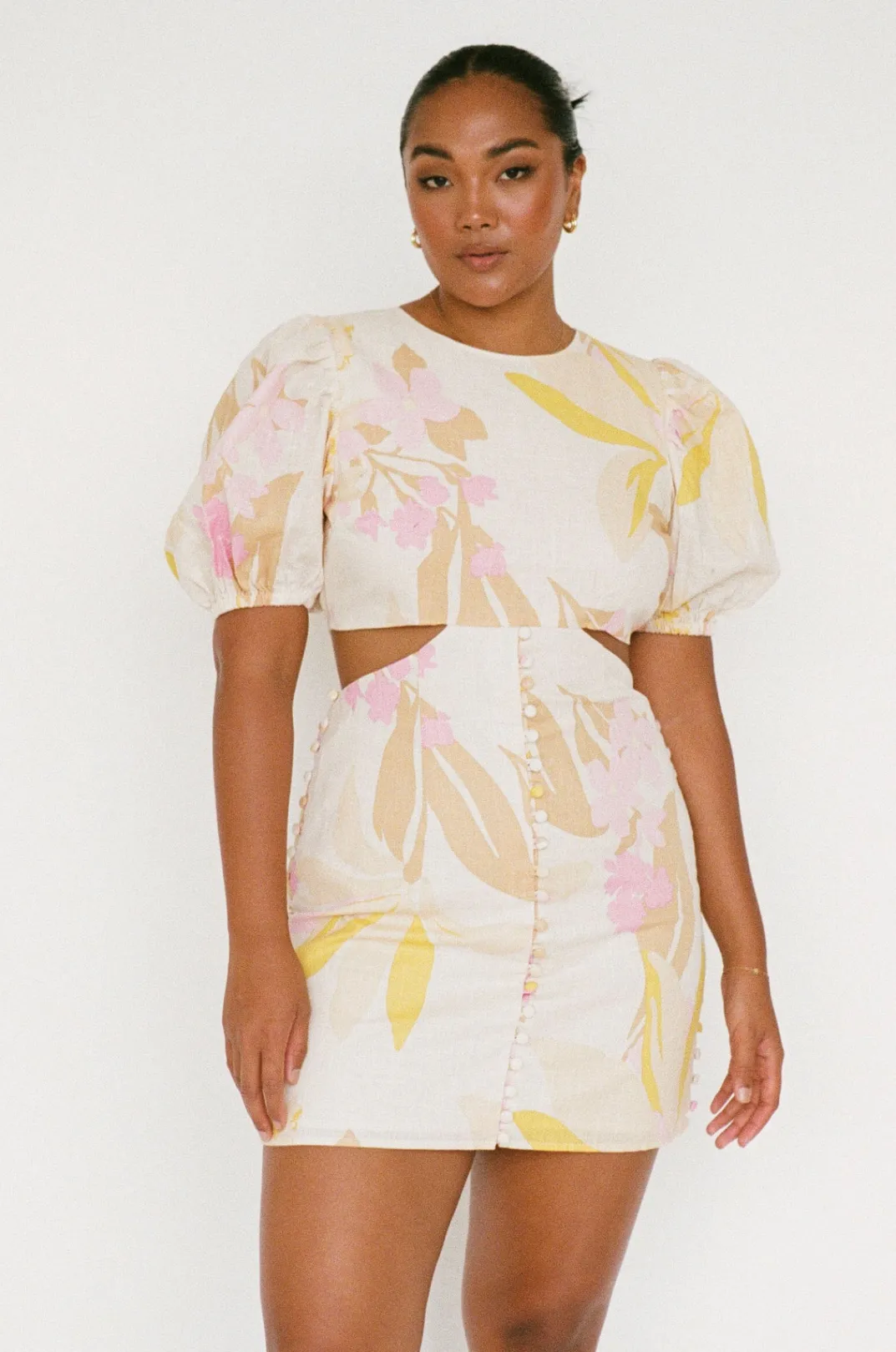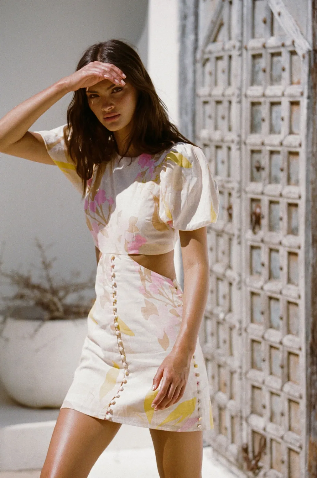 Introducing Our New And Exclusive Midsummer Vintage Print! The Melia Cutout Dress Is An Open Back Style Featuring A High Rounded Neckline, Short Puff Sleeves, Cutouts At Waist And Covered Button Details Down Centre Front Of Skirt. Dress It Up With The Strappy Leila Heels And Tiana Bag! Designed Exclusively By Sabo.