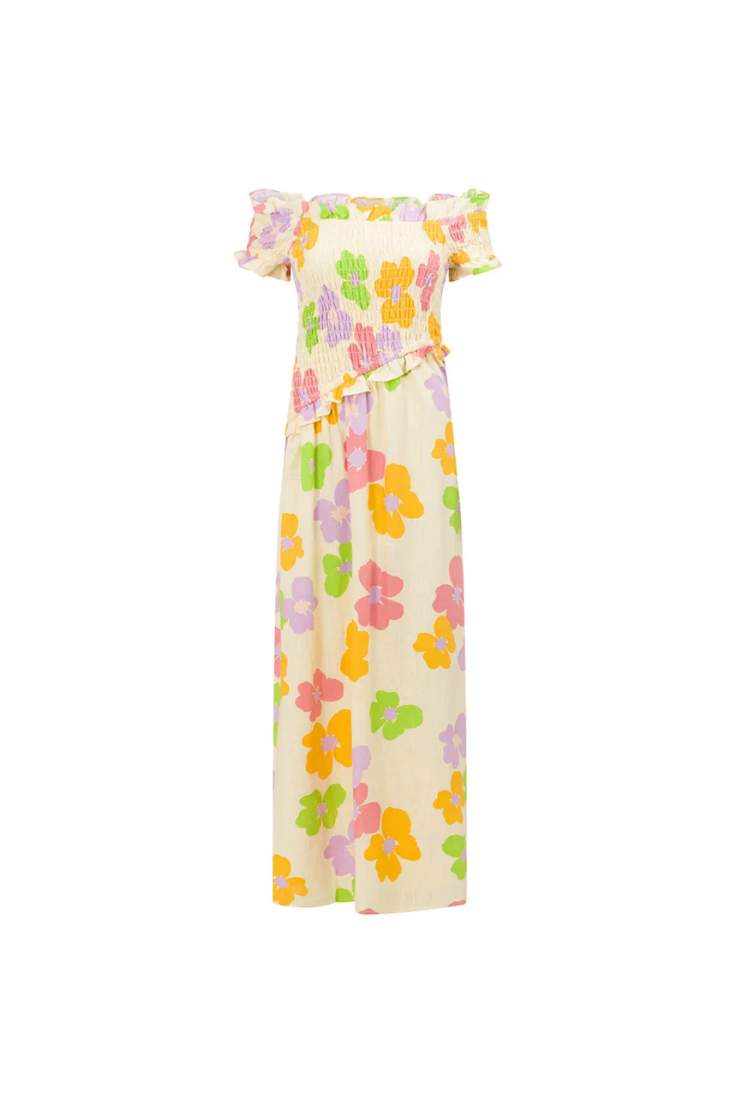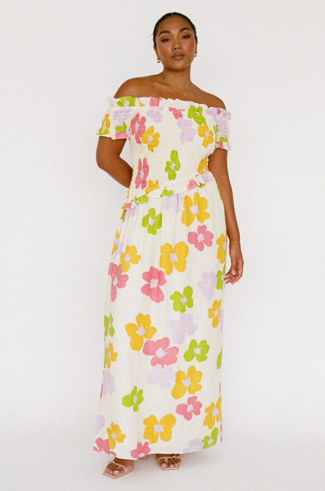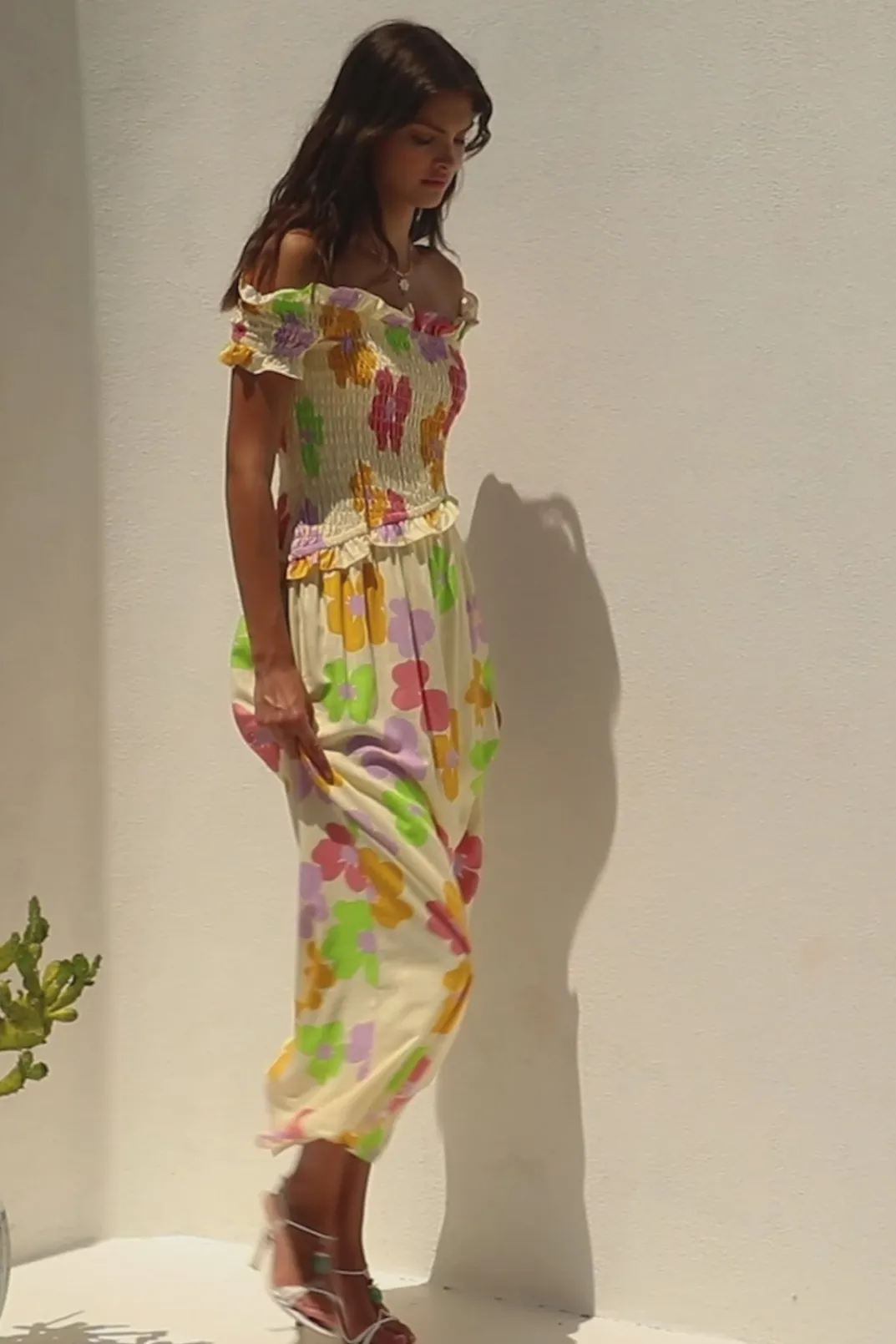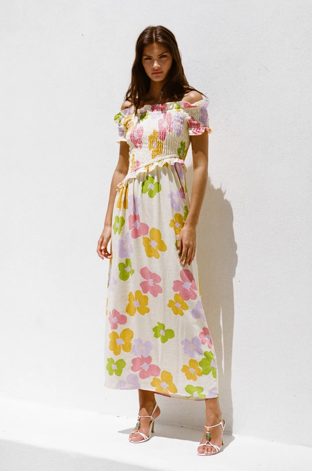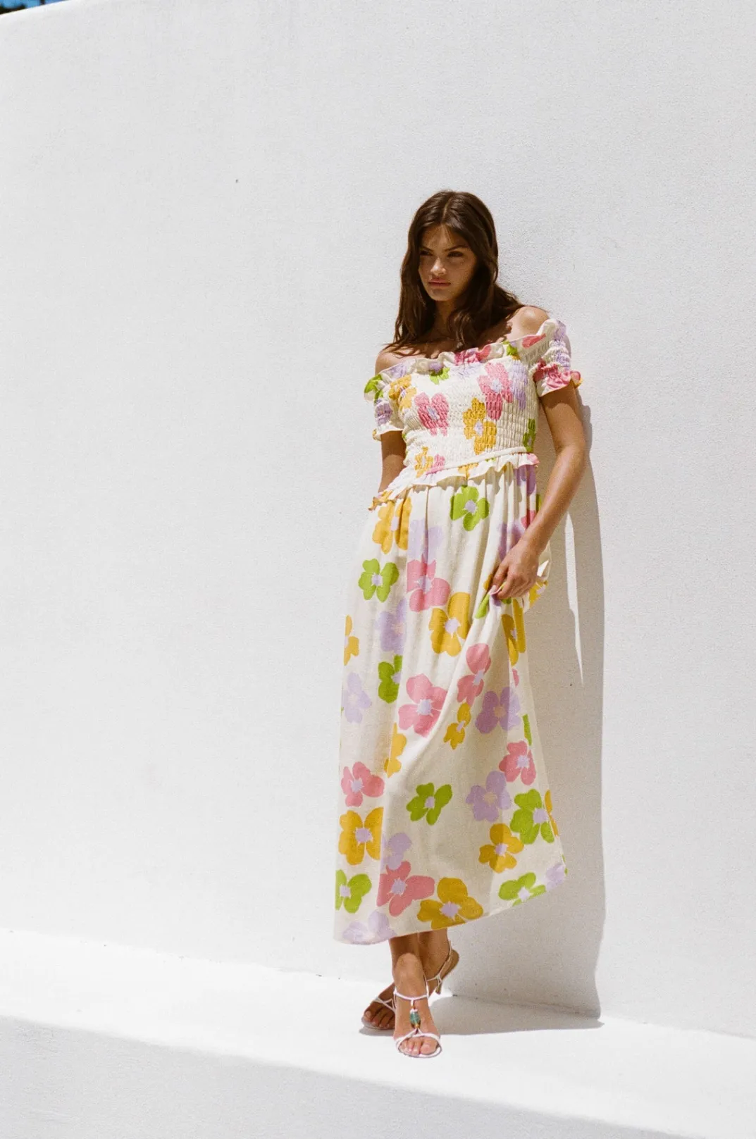 *This Is A Final Sale Item And Cannot Be Returned. See Our Returns Policy Here Introducing Our New Exclusive Print:Tutti Daisy Floral! The Mireya Midi Dress Is Made From A Soft Linen Blend Fabric Featuring A Shirred Bodice, Off Shoulder Sleeves, Frill Trims Across Neckline And Waist And A Flouncy Skirt. Dress It Up With Strappy Rafaela Heels! Designed Exclusively By Sabo.