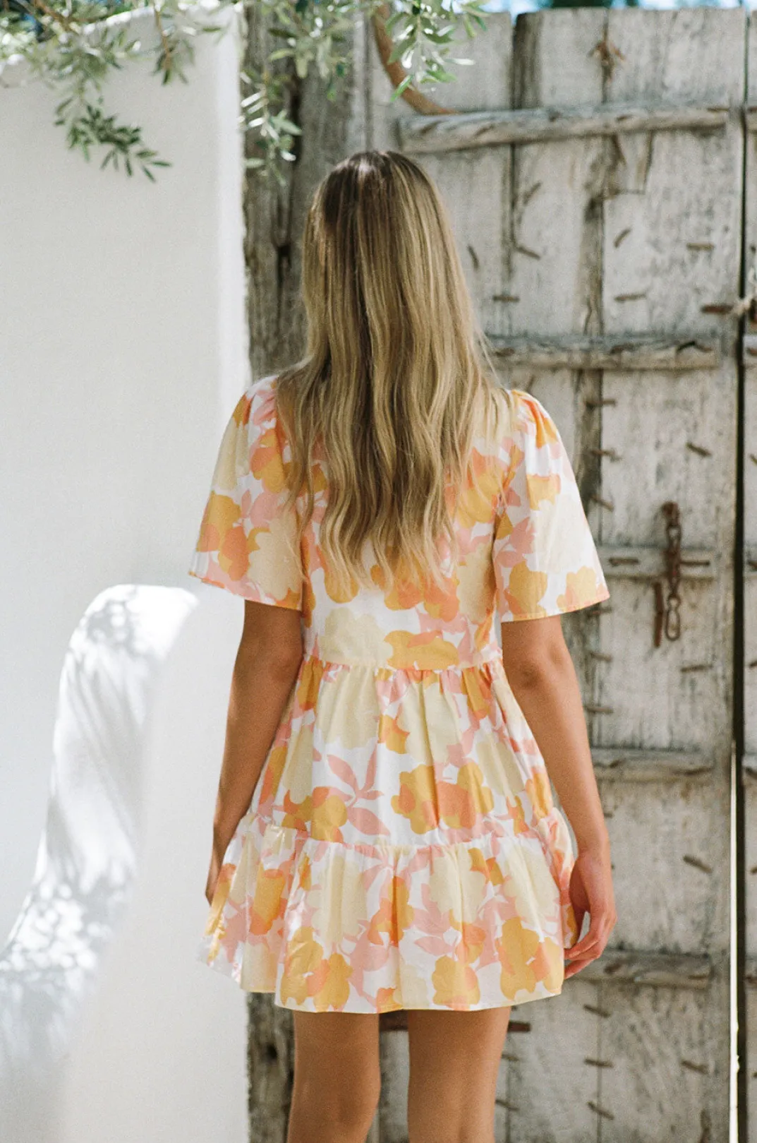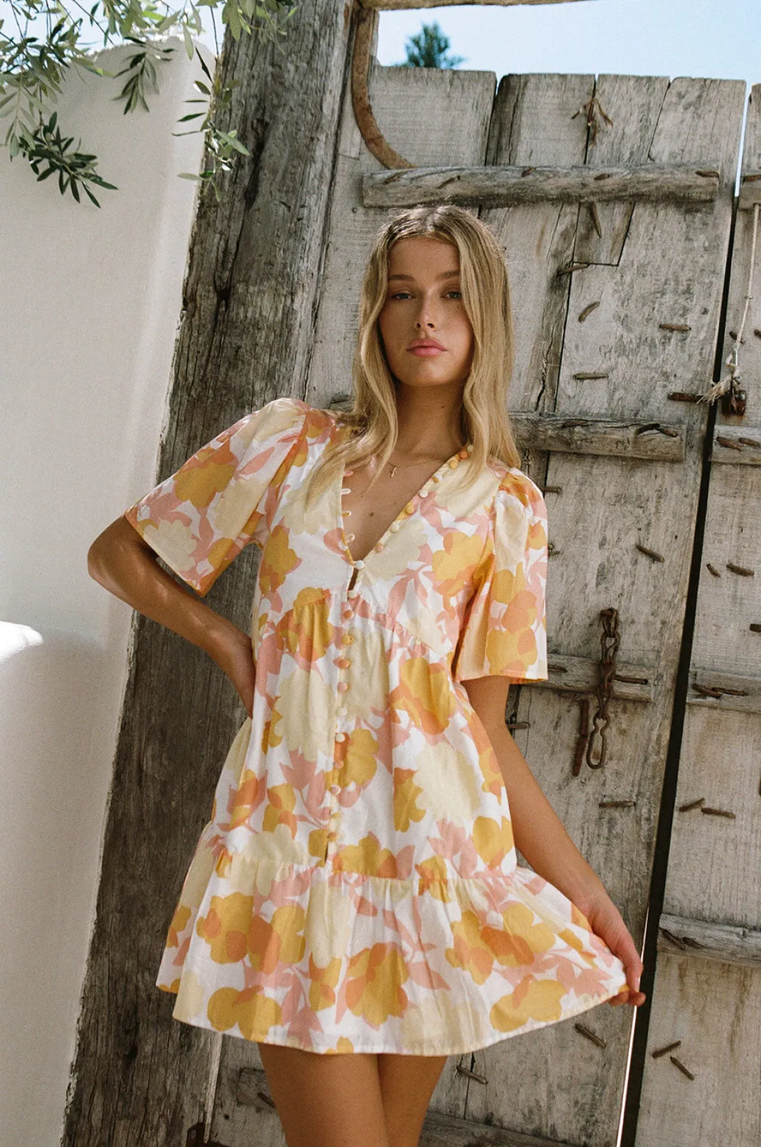 Introducing Our Exclusive New Nectar Floral Print, Themonika Babydoll Dress Is Made From A Natural Cotton Voile Fabric. It Features Short Flouncy Sleeves, V Neckline With Covered Button Details At Centre Front And Relaxed Panelled Bodice And Hem. Style Your Look With White Sandals And Caramel Marble Claw Clip! Designed Exclusively By Sabo.