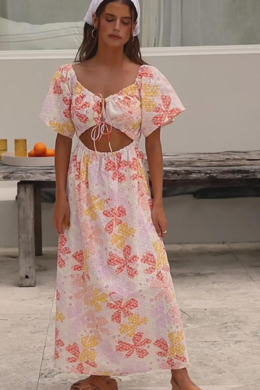 Welcoming Our Brand New Exclusive Pollen Print! The Sabo Luxe Off Shoulder Nalu Dress Is Made Features A High Quality Natural Broiderie Cotton Fabric. It Features Short Flared Sleeves, Cutout At Centre Bust With Tie Details, Cutout At Waist And Relaxed Ankle Grazing Skirt. Dress It Up With The Strappy Rafaela Heels For Your Next Event! Designed Exclusively By Sabo.