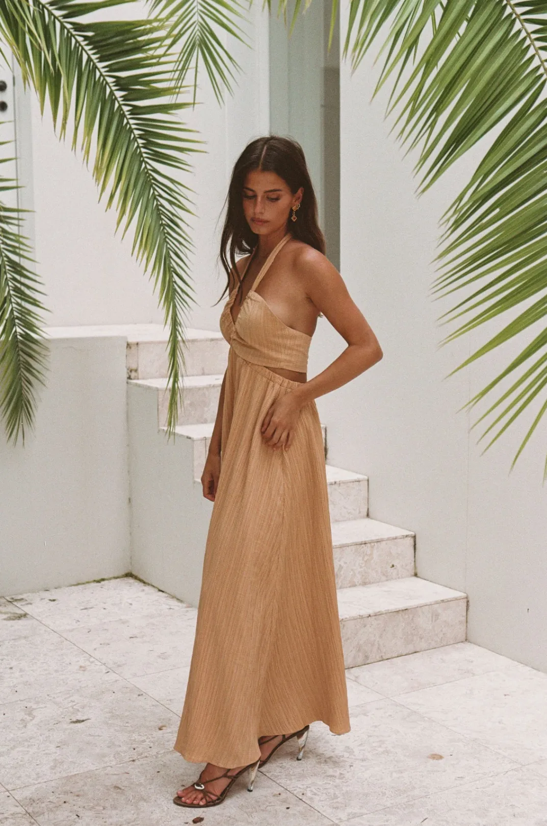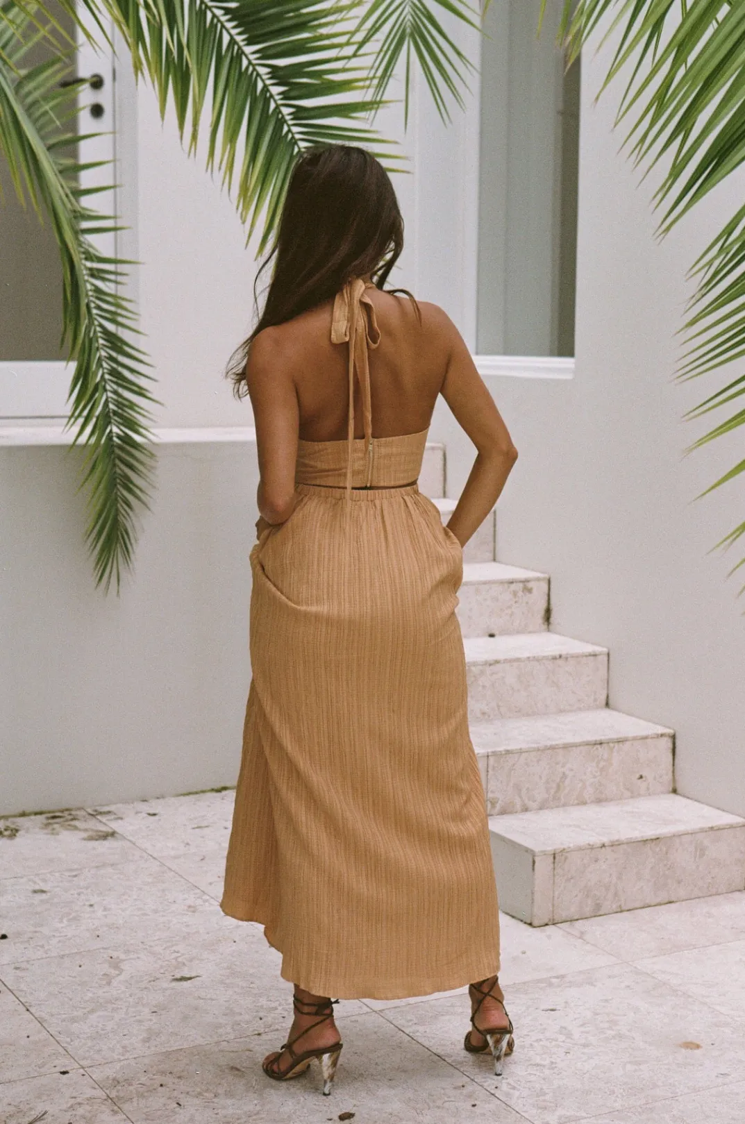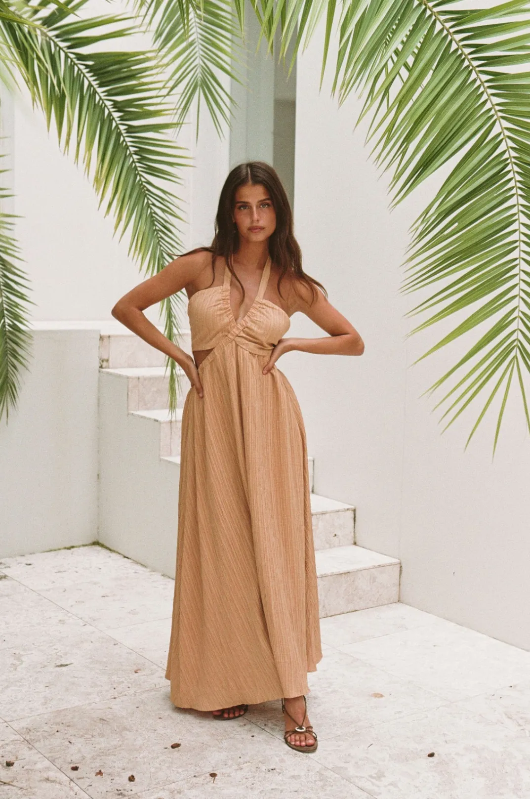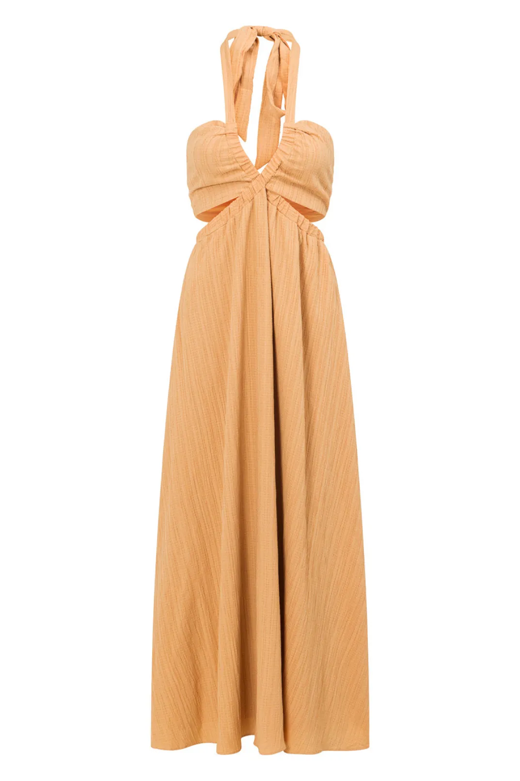 The Dreamy Olsen Midi Dress Is Made From A Textured Crepe-Feel Fabric In An Orange Hue. It Features A Halter Neck Tie, Cutouts At Waist And Flouncy Ankle Grazing Skirt. Dress It Up With White Heels For Your Next Event! Designed Exclusively By Sabo.