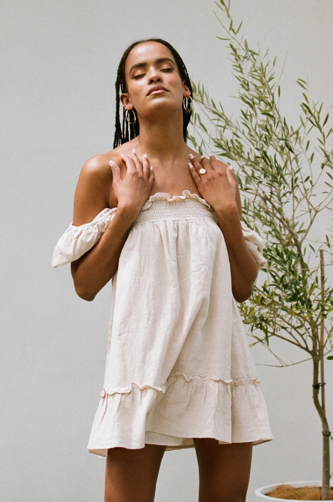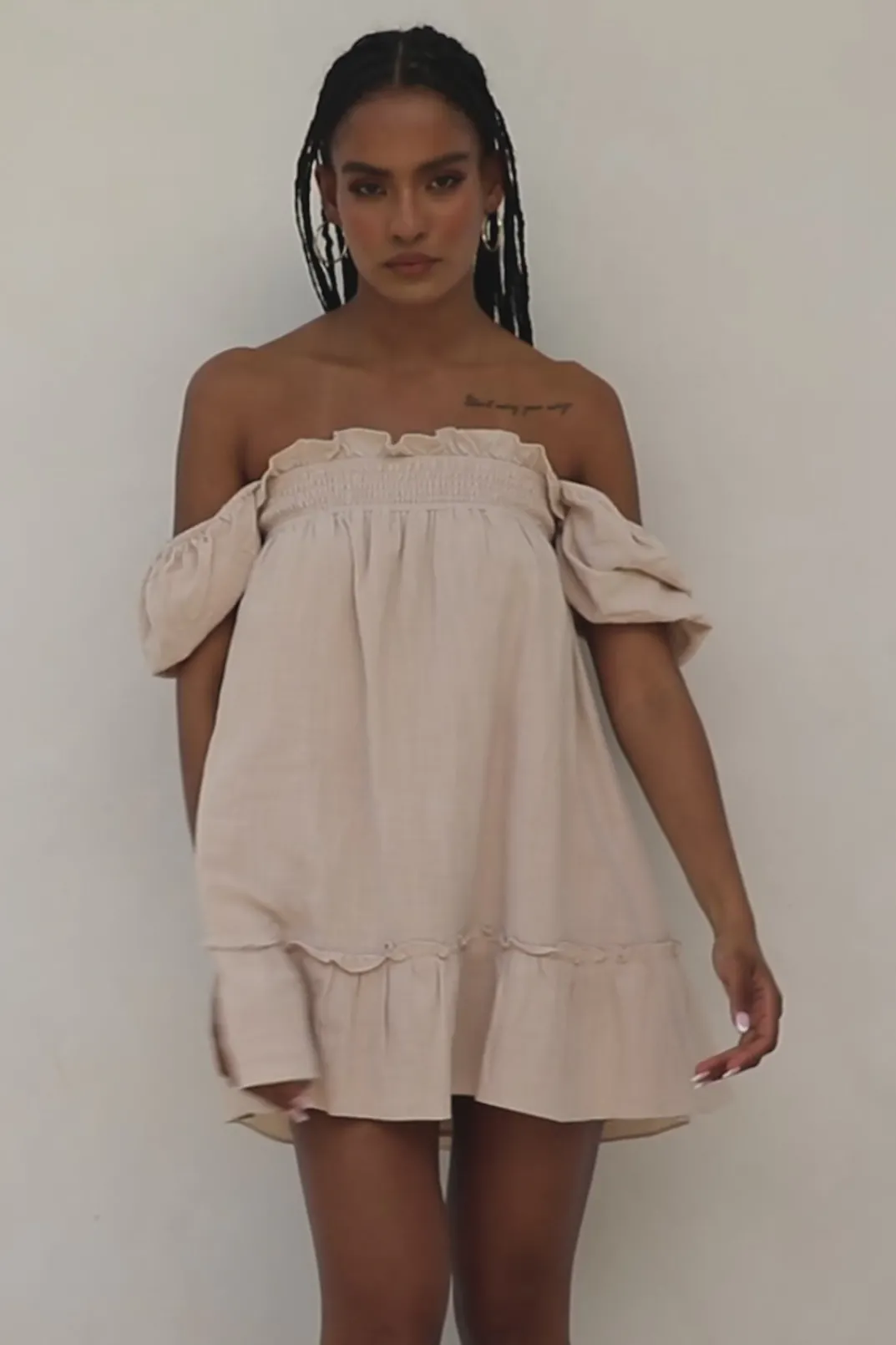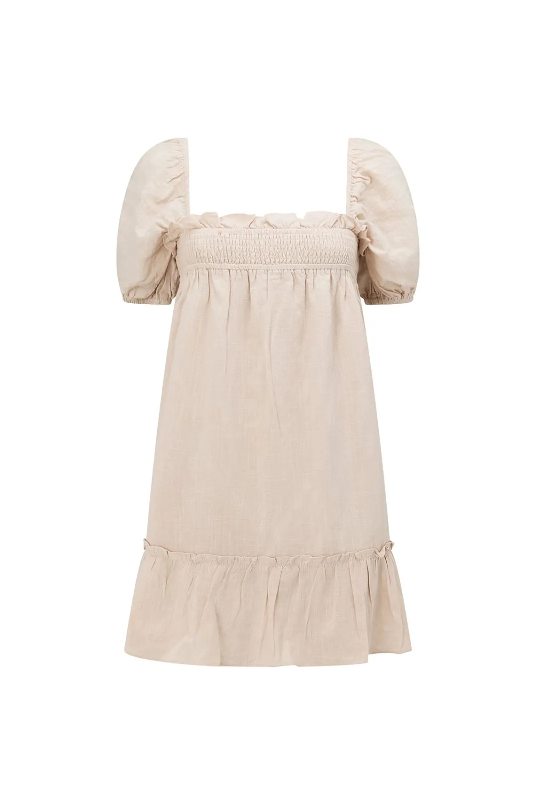 Add Heels And Wear It Out Or Throw It On Over Bikinis! The Super Cute Ranetta Dress Is Made From A Cotton Blend Fabric In A Beige Hue. It Features An Elastic Shirred Panel Across Neckline, Short Puff Sleeves, Babydoll Skirt And Ruffle Panel Details Throughout. Style With Neutral Chunky Slides And The Matisse Sunglasses! Designed Exclusively By Sabo.