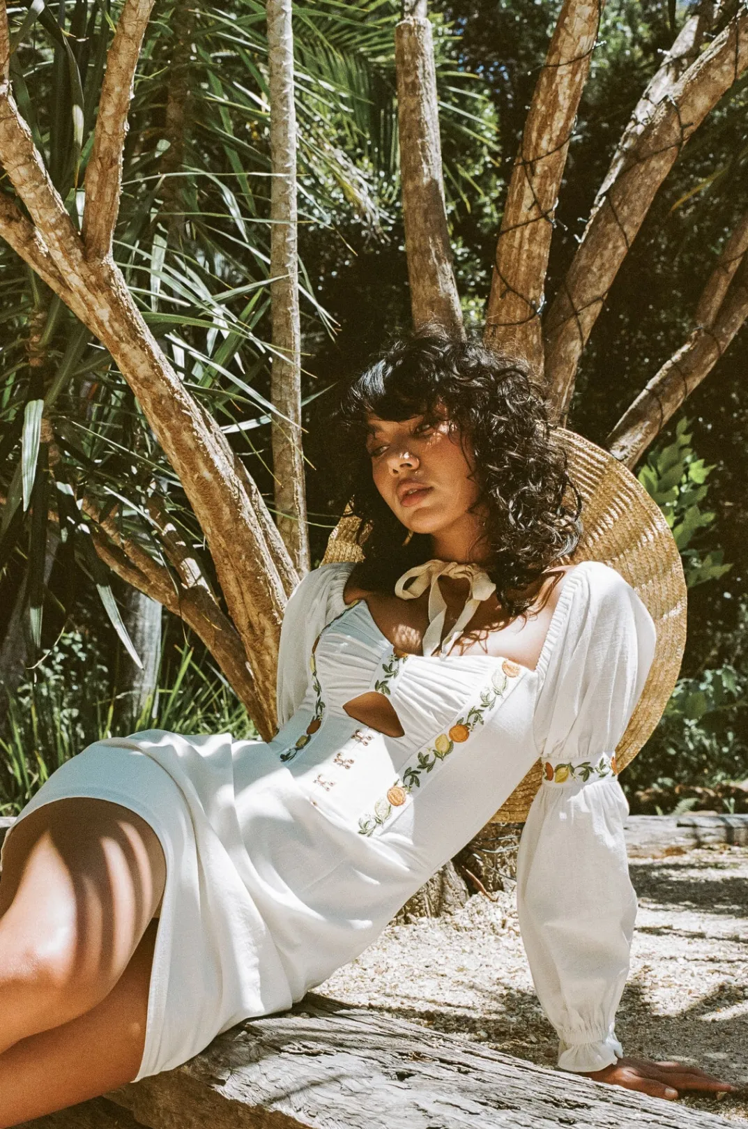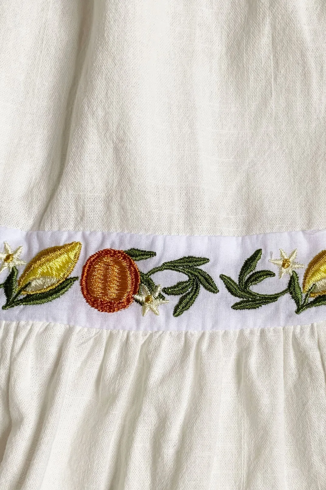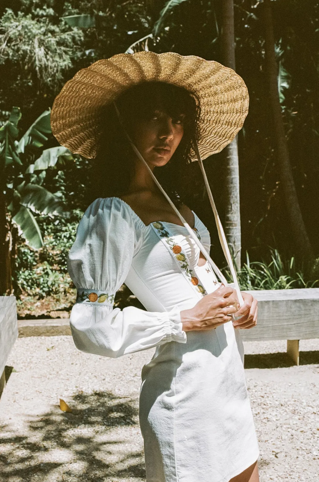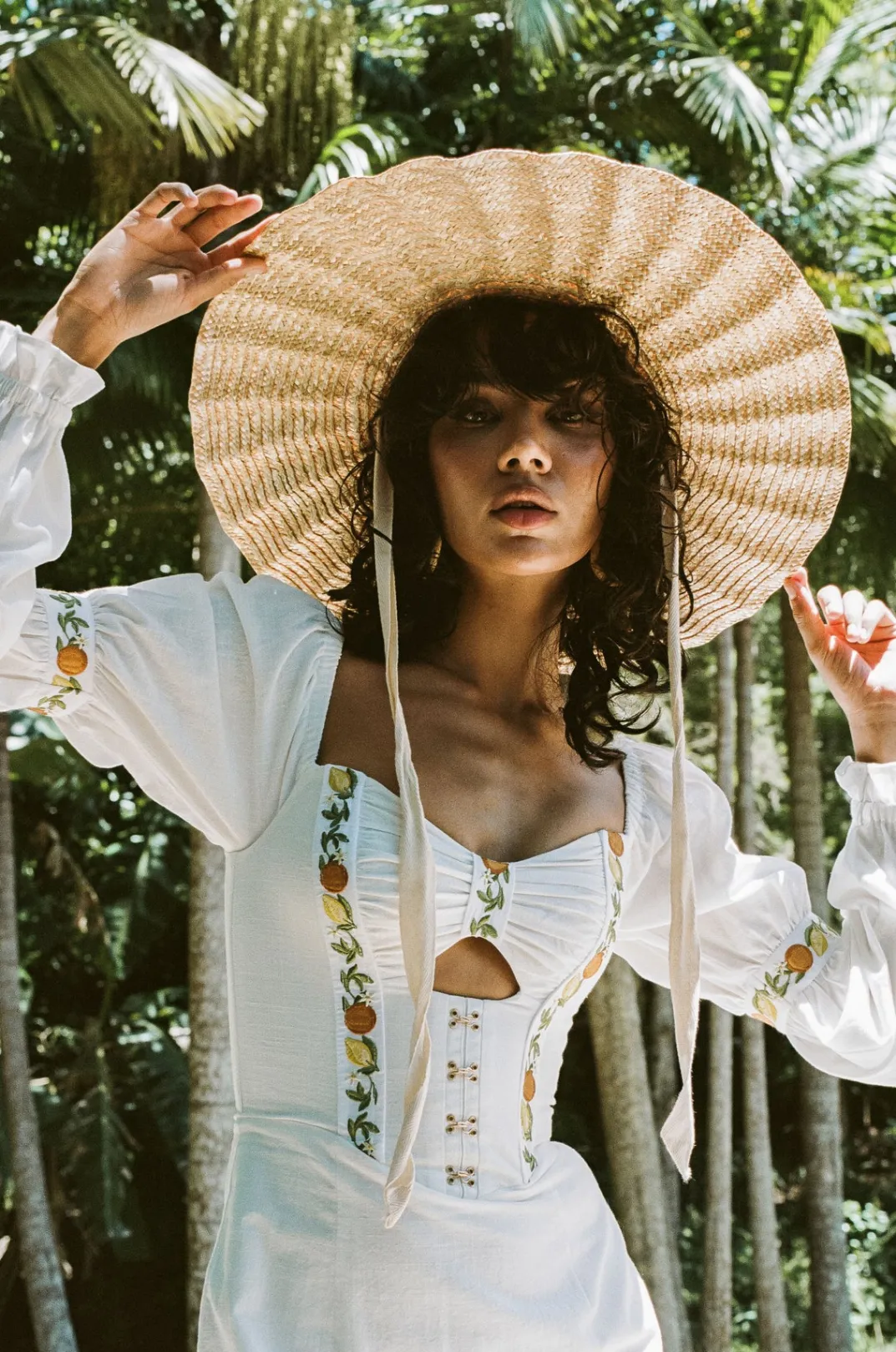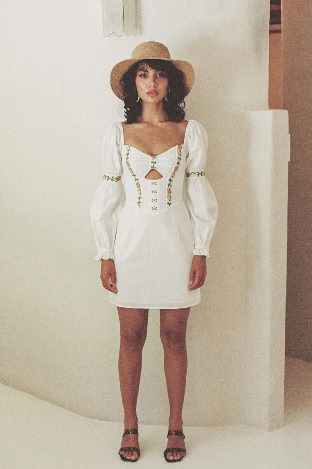 This Sabo Luxe Piece Inspired By Italian Summers Is Perfect For An Event! The Rhodes Dress Is Made From A High Quality Structured Natural Cotton Fabric In White. It Features Puff Sleeves With Frill Hems, Fitted Corset Bodice With Cutout And Gold Eyelet Details And Stunning Exclusive Citrus Embroidered Panel Details At Bodice And Sleeves. Styling Tip:Sleeves Can Also Be Worn Off Shoulder. Designed Exclusively By Sabo.