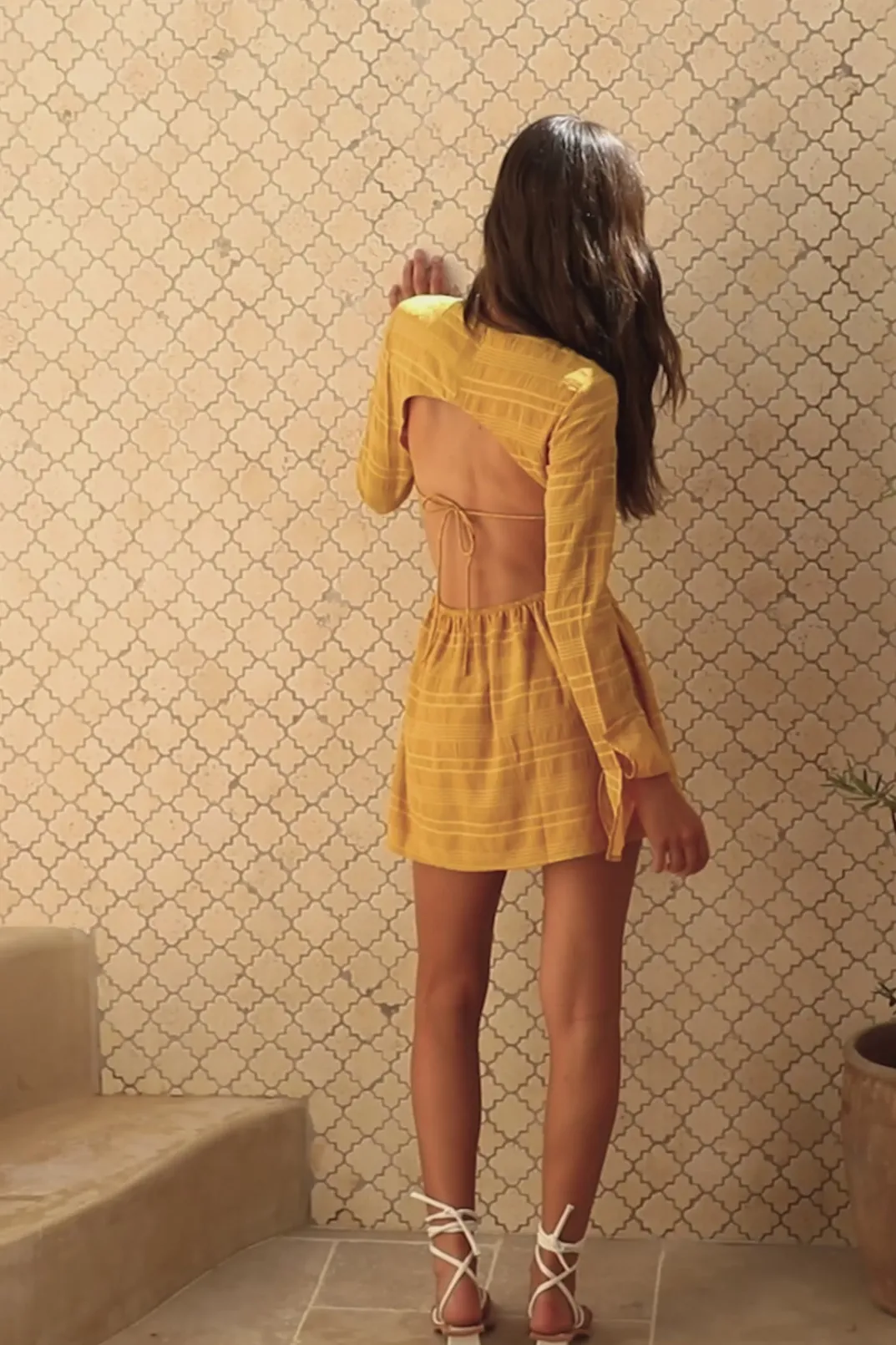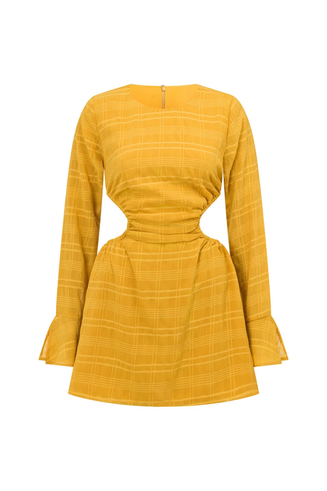 Inspired By Sun Drenched Afternoons With Friends, The Romi Dress Is Made From A Lightweight Crepe-Feel Fabric With Self Stripes Throughout. It Features A High Rounded Neckline, Full Length Sleeves With Flared Cuffs And Cutouts At Sides Of Waist. Dress It Up With The Strappy Leila Heels And Transparent Moon Rock Necklace! Designed Exclusively By Sabo.