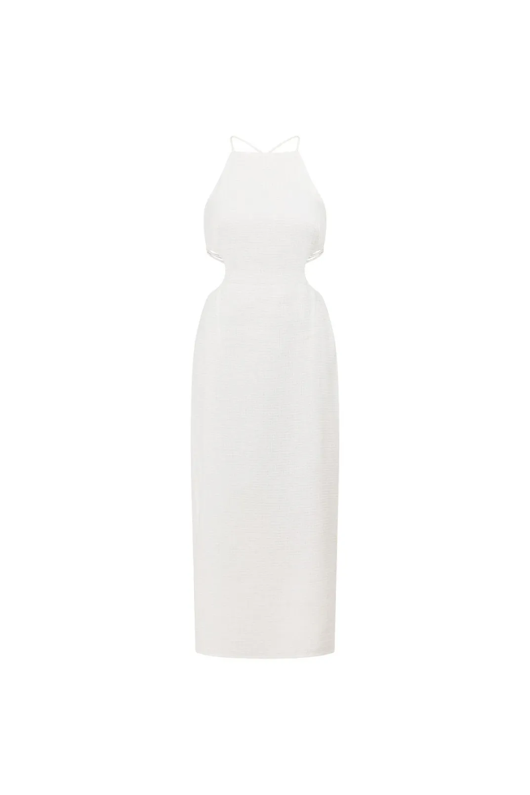 The Ultra Chicsalma Midi Dress Is Made From A High Quality Natural Textured Cotton Fabric In White. It Features An Open Back With Strappy Detailing, High Halter Neck, Cutouts At Waist And A Midi Skirt With Centre Back Split. Style Your Look With The Zita Strappy Heels And Livia Earrings! Designed Exclusively By Sabo.