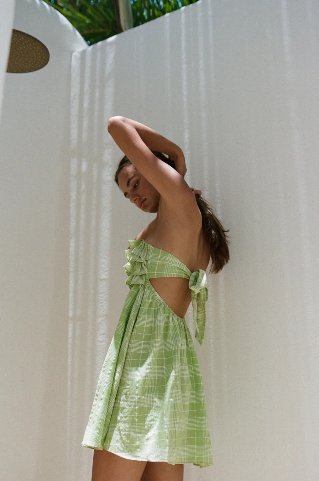 Inspired By Seaside Adventures, The Senya Dress Is Made From A Lightweight Green Fabric With A White Check Throughout. I…