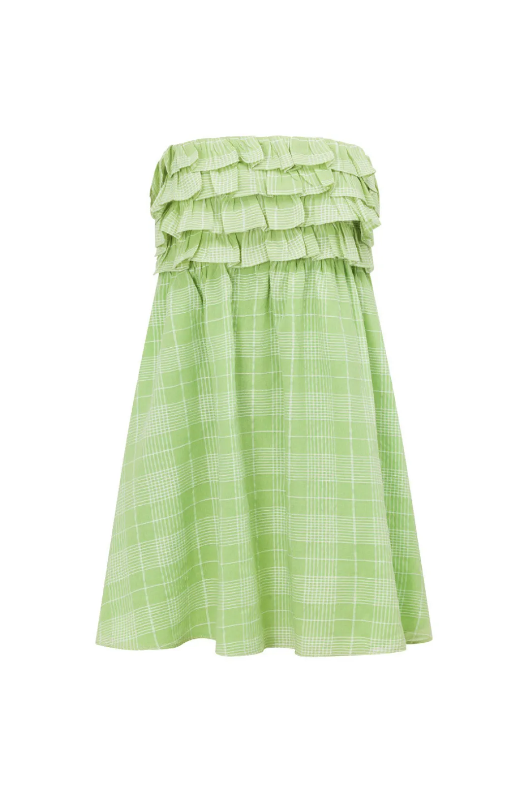Inspired By Seaside Adventures, The Senya Dress Is Made From A Lightweight Green Fabric With A White Check Throughout. It Is A Strapless Style Featuring A Tie And Cutout At Back, Frill Detailing At Front Bust And A Mini Babydoll Skirt. Pair It With Sandals And The Caramel Marble Claw Clip! Designed Exclusively By Sabo.